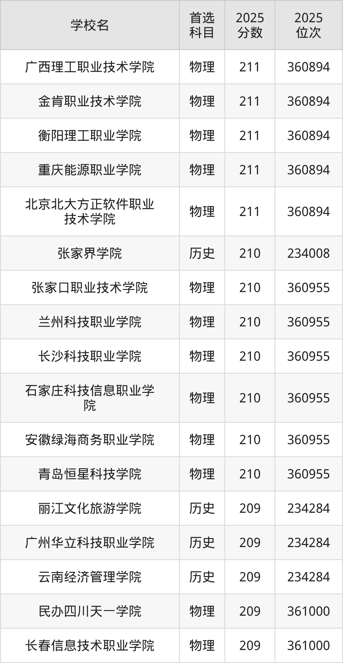 2025年在河北高考历史类录取分数线是210分的大学有张家界学院。物理类录取分数线是210分的大学有张家口职业技术学院、兰州科技职业学院、长沙科技职业学院、石家庄科技信息职业学院、安徽绿海商务职业学院、青岛恒星科技学院。