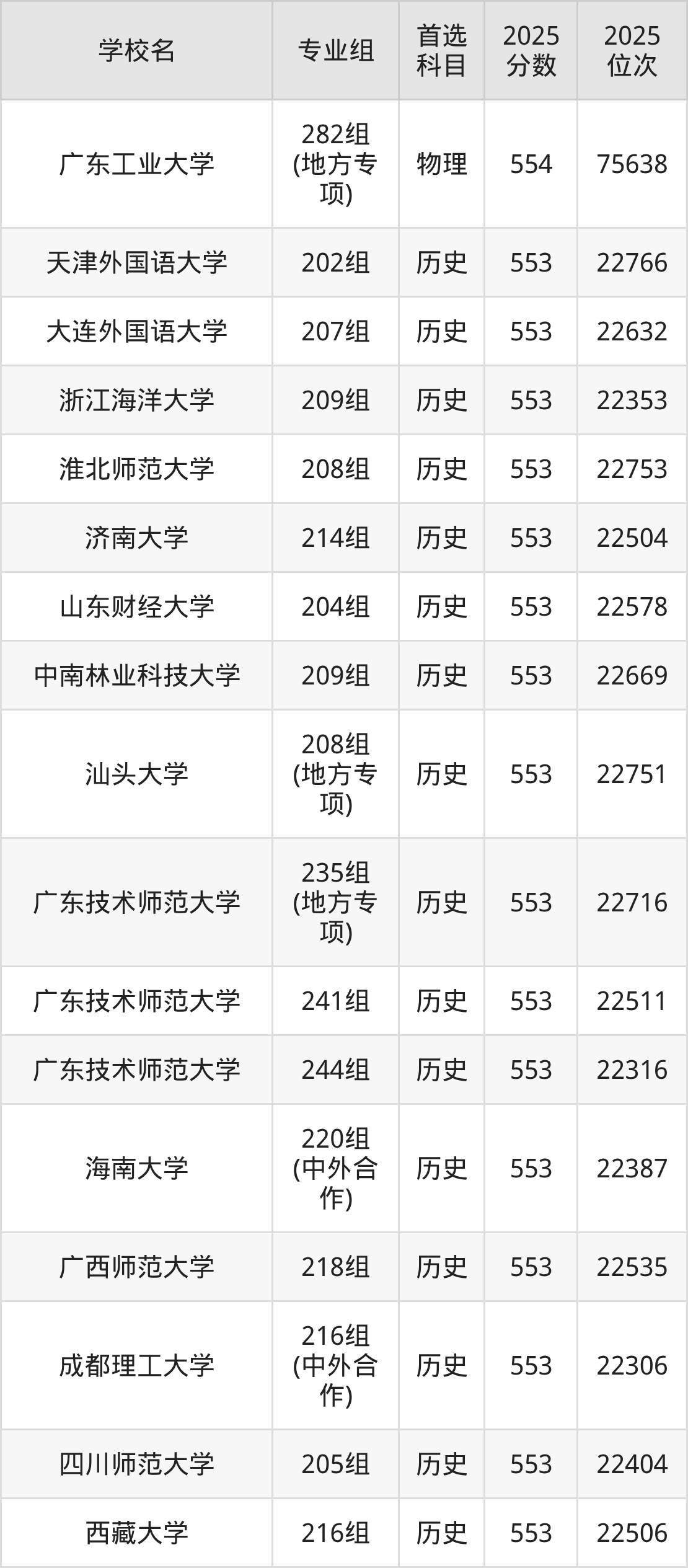 2025年在广东高考历史类录取分数线是552分的大学有天津外国语大学、华北理工大学、吉林师范大学、安徽农业大学、安徽财经大学、赣南师范大学、湖南科技大学、湖南农业大学、南华大学、南宁师范大学等。物理类录取分数线是552分的大学有北京印刷学院、北京石油化工学院、天津师范大学、内蒙古大学、东北财经大学、长春理工大学、苏州科技大学、山东师范大学、河南大学、武汉科技大学等。