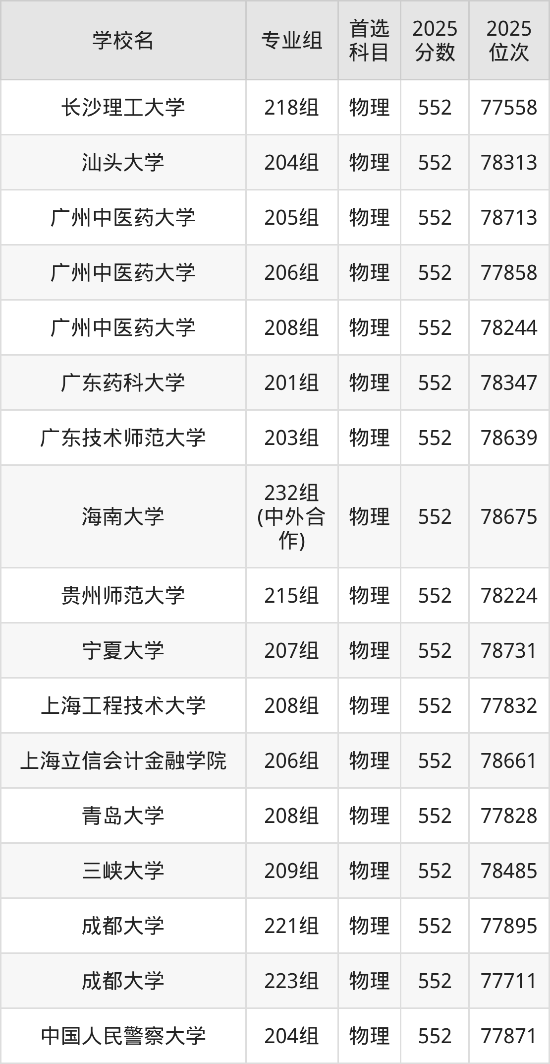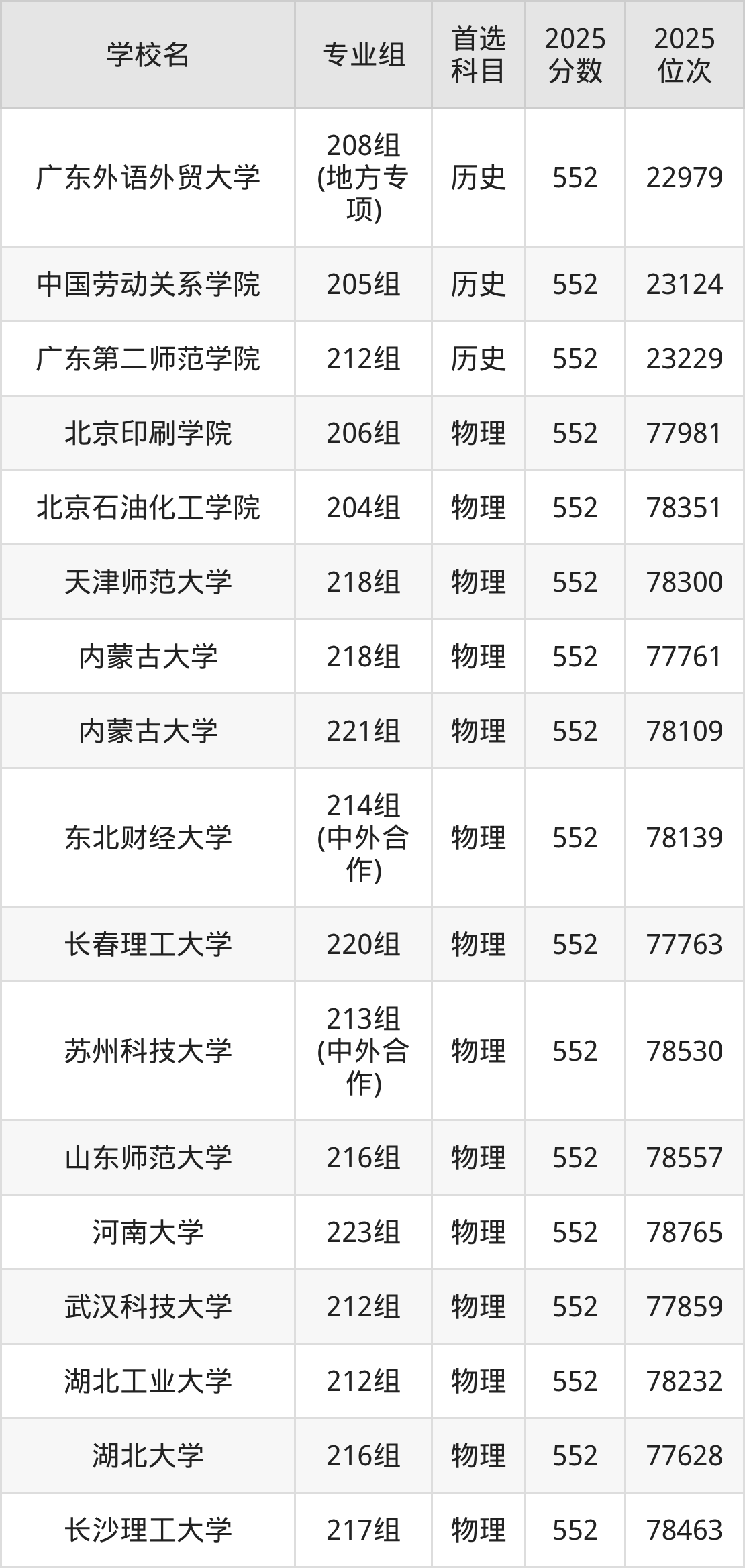 广东高考历史类552分对应的位次排名是22822名-23229名,物理类552分对应的位次排名是77558名-78827名,因此建议2026年位次排在这附近的同学考虑这些大学。