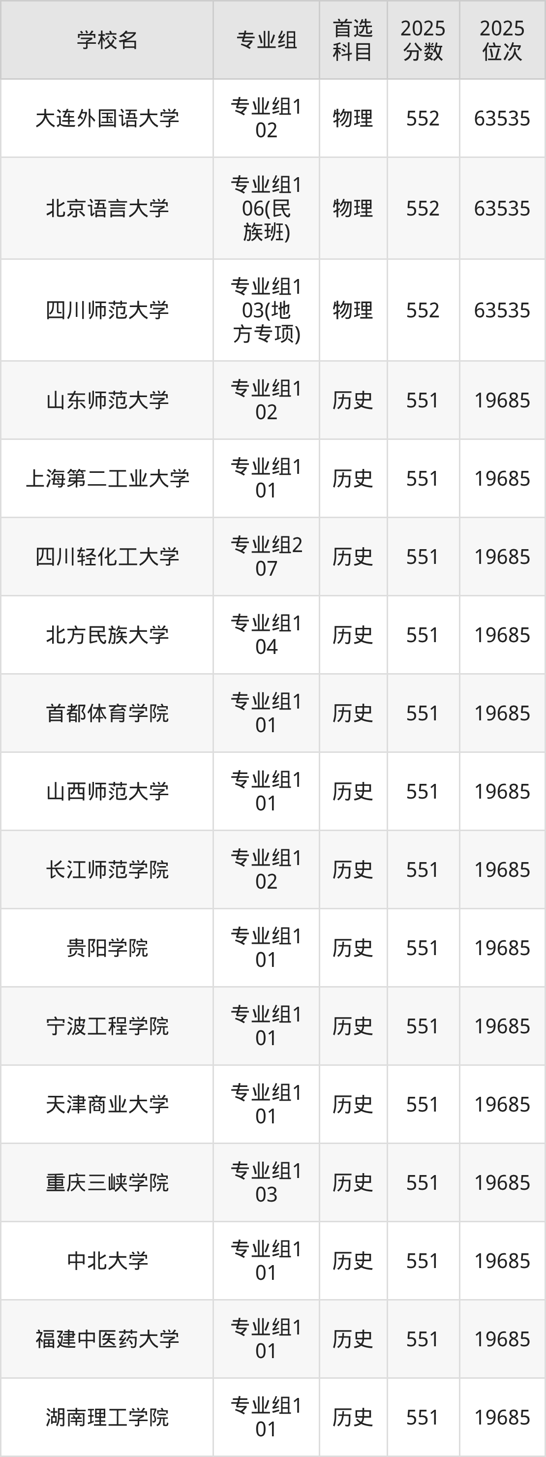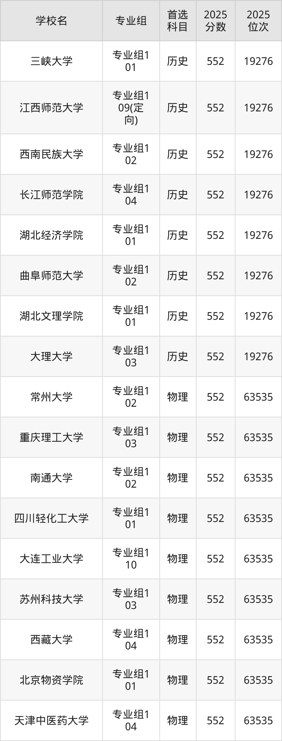 四川高考历史类552分对应的位次排名是19276名,物理类552分对应的位次排名是63535名,因此建议2026年位次排在这附近的同学考虑这些大学。
