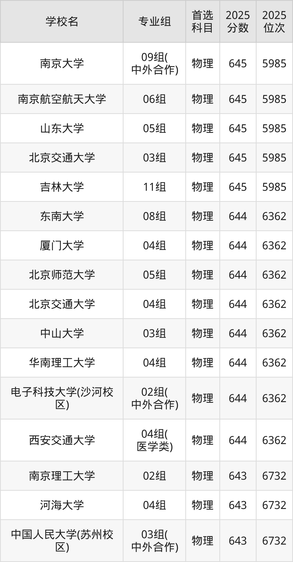 2025年在江苏高考物理类录取分数线是643分的大学有南京理工大学、河海大学、中国人民大学(苏州校区)、中山大学。历史类录取分数线是643分的大学有南京大学。
