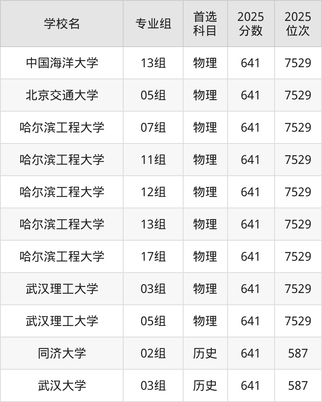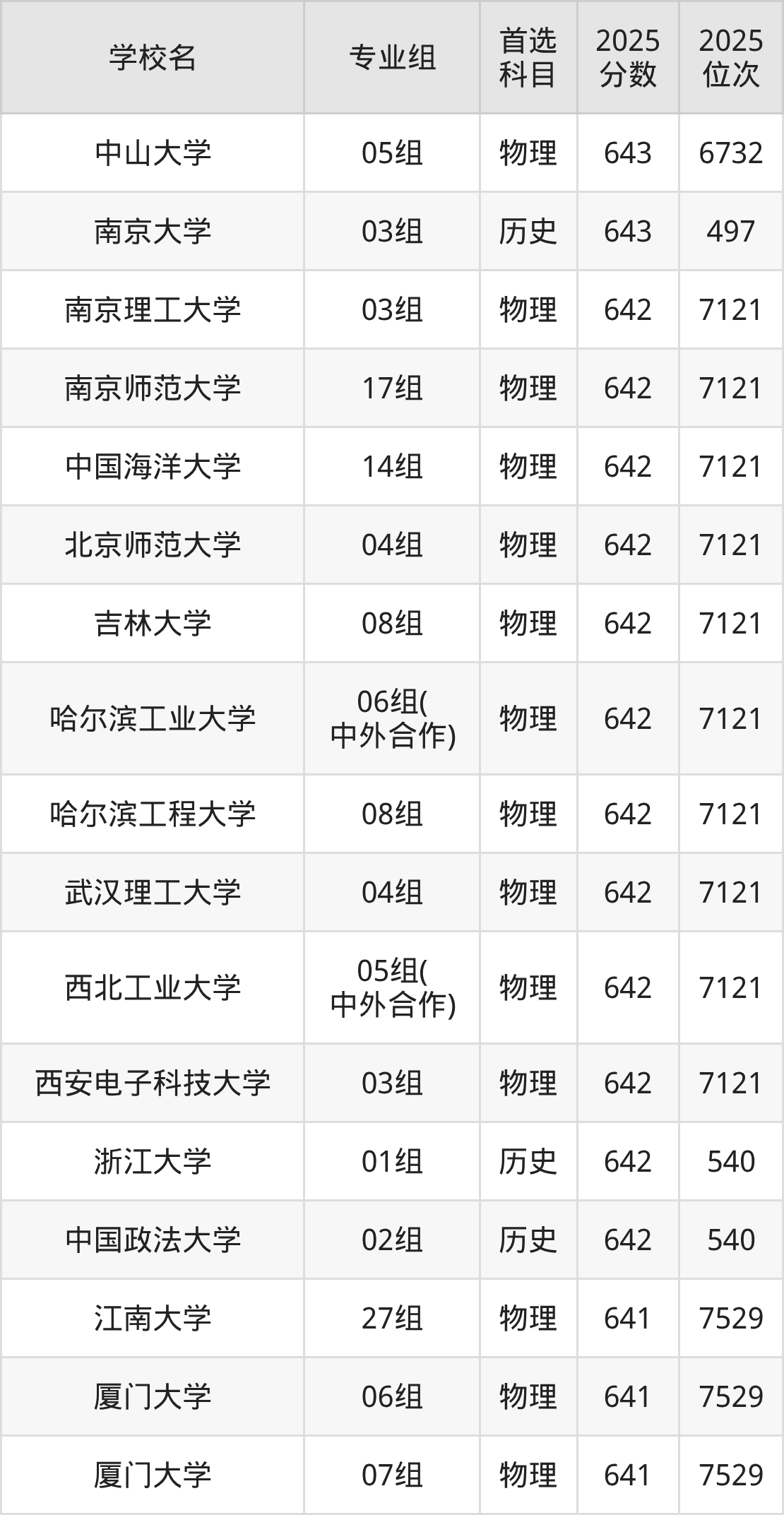 历史类643分较稳妥的大学:浙江大学642分、中国政法大学642分、同济大学641分、武汉大学641分等。