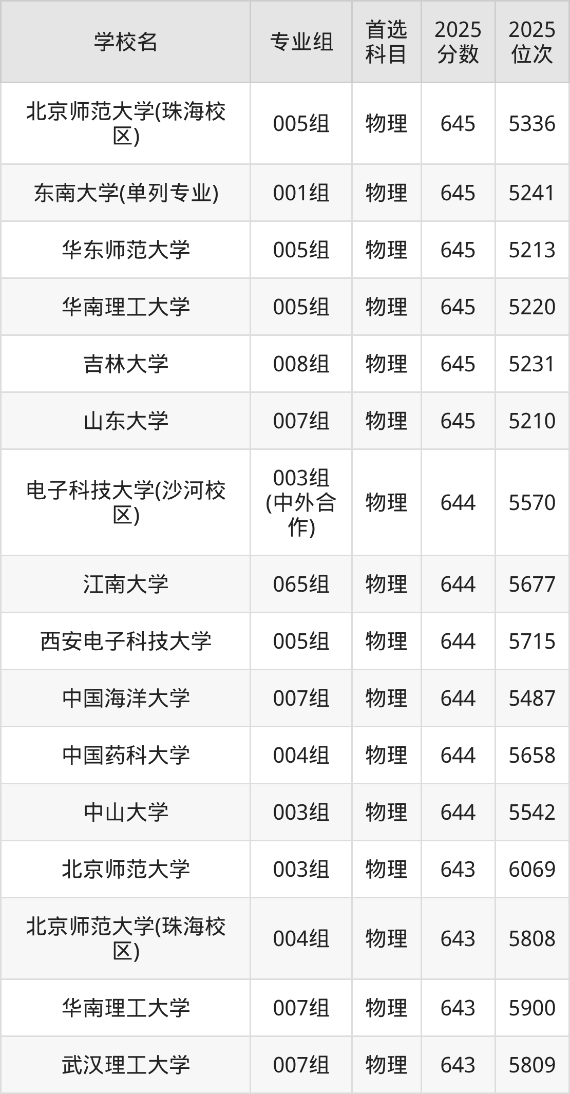 物理类643分可以冲的大学:南京大学645分、南京航空航天大学645分、山东大学645分、北京交通大学645分等;较稳妥的大学:南京理工大学642分、南京师范大学642分、中国海洋大学642分、北京师范大学642分等。