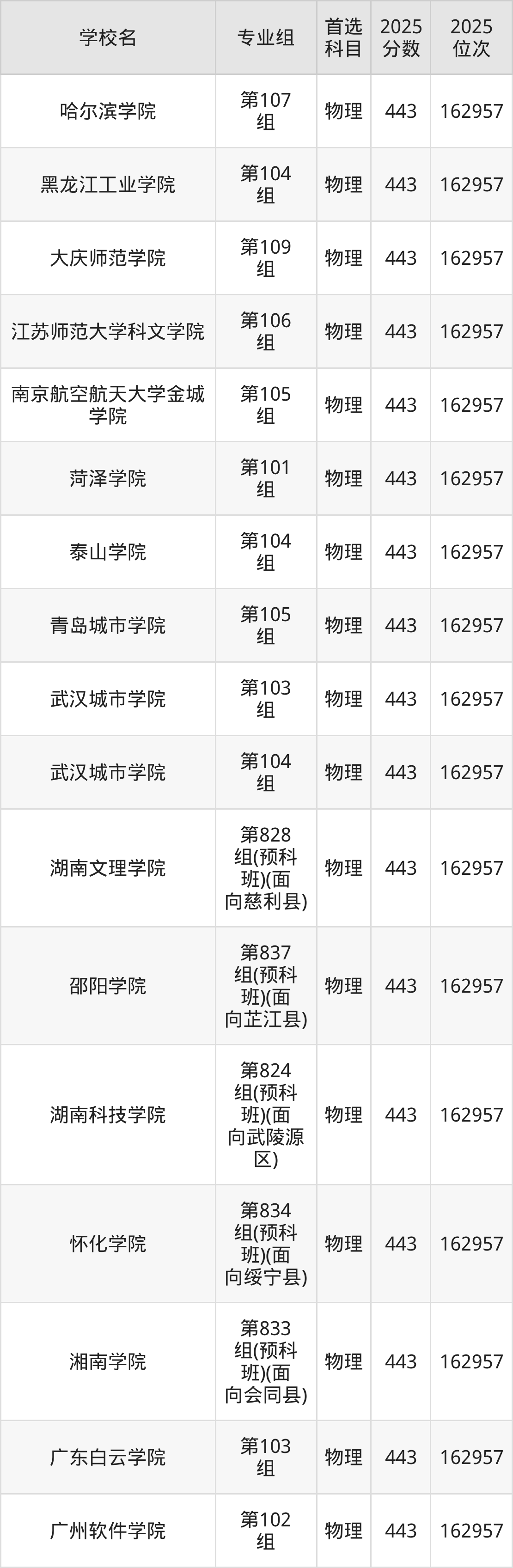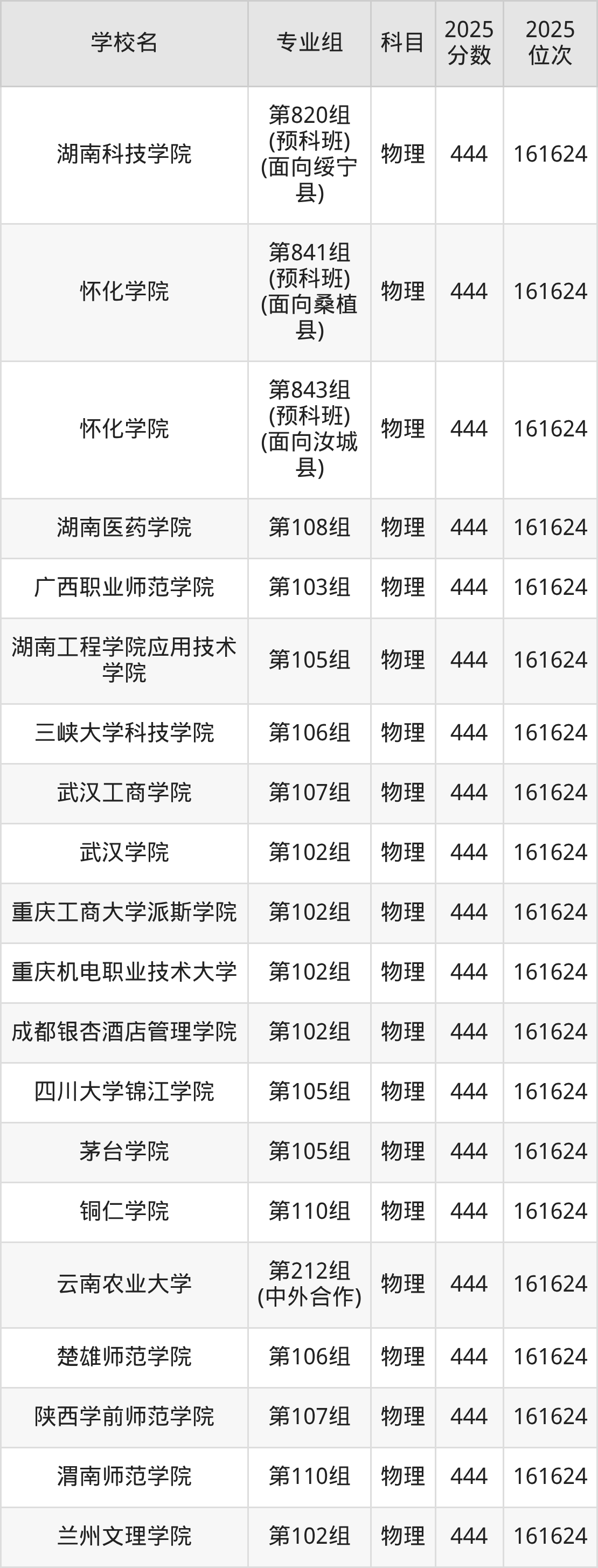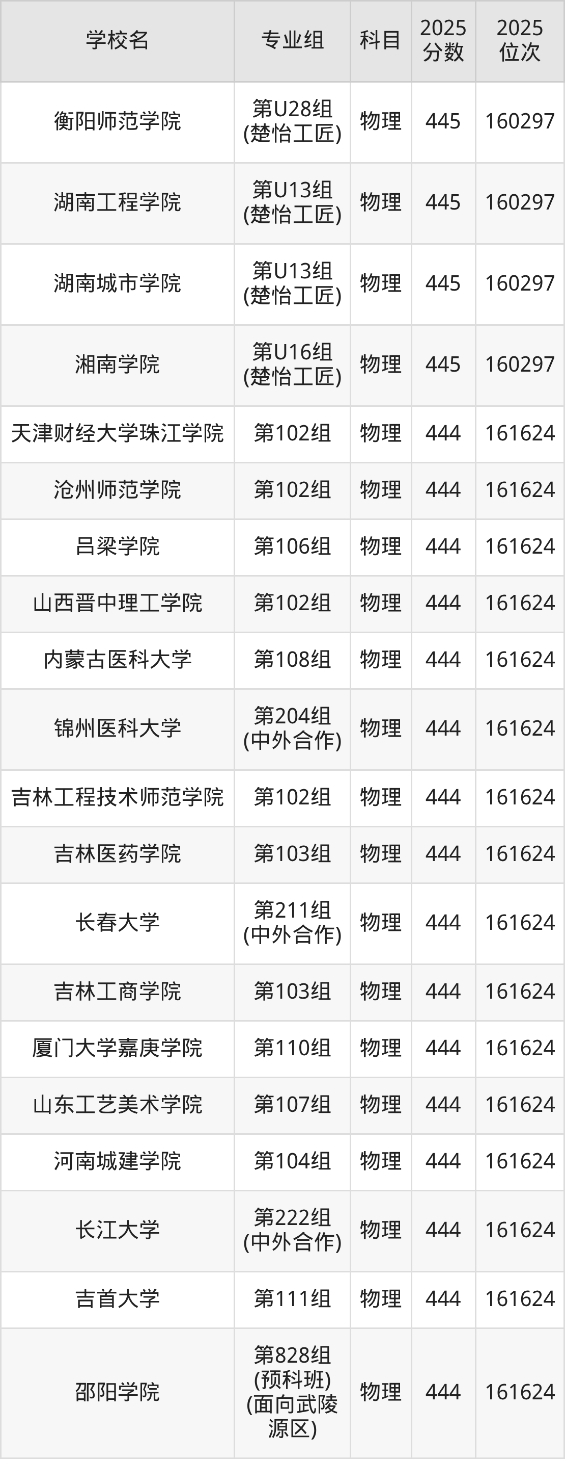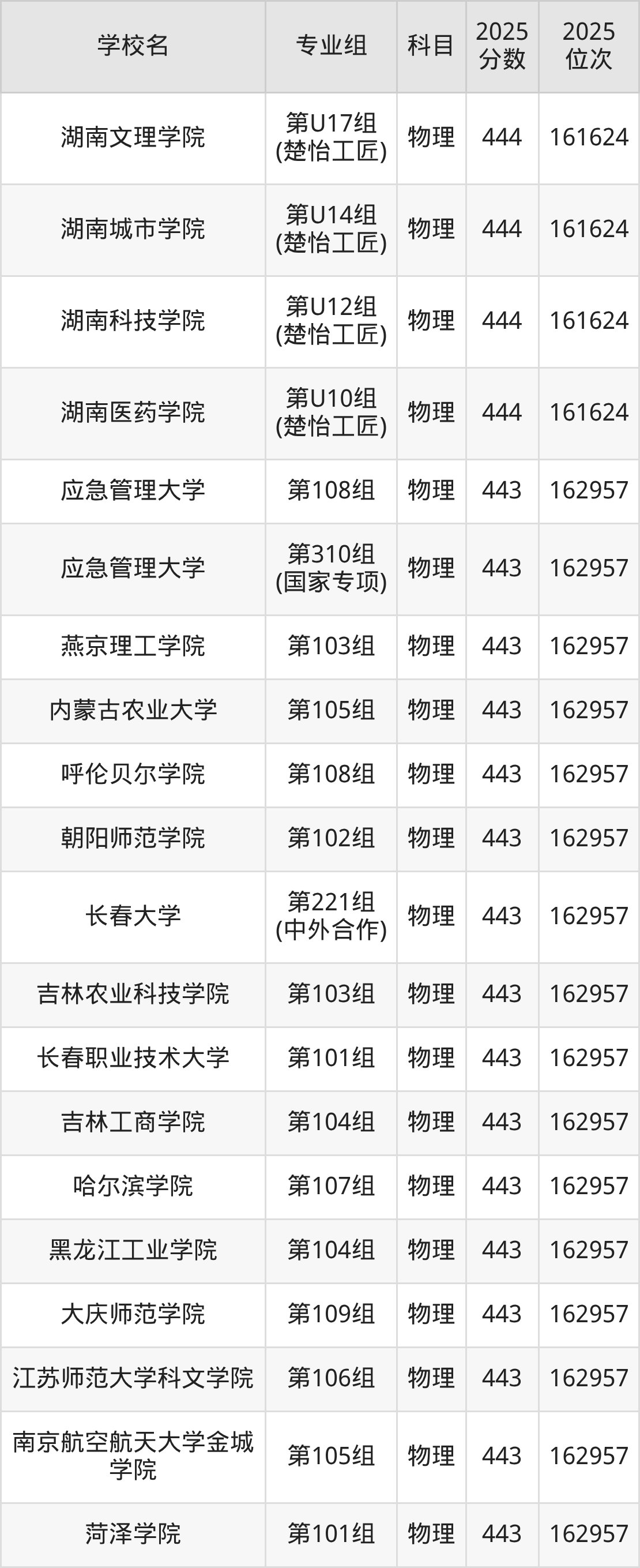 湖南物理类444分对应的位次排名是161624名,因此建议2026年位次排在这附近的考生考虑这些大学。