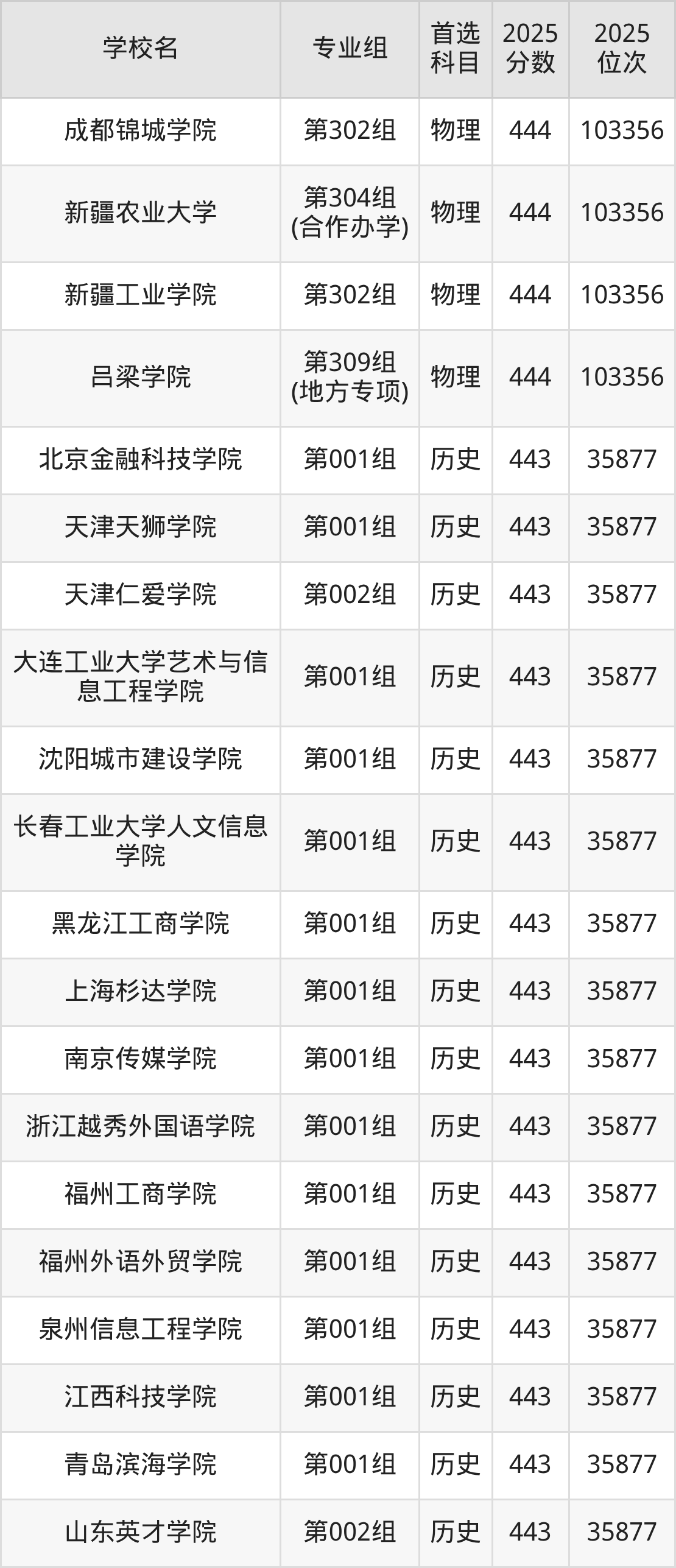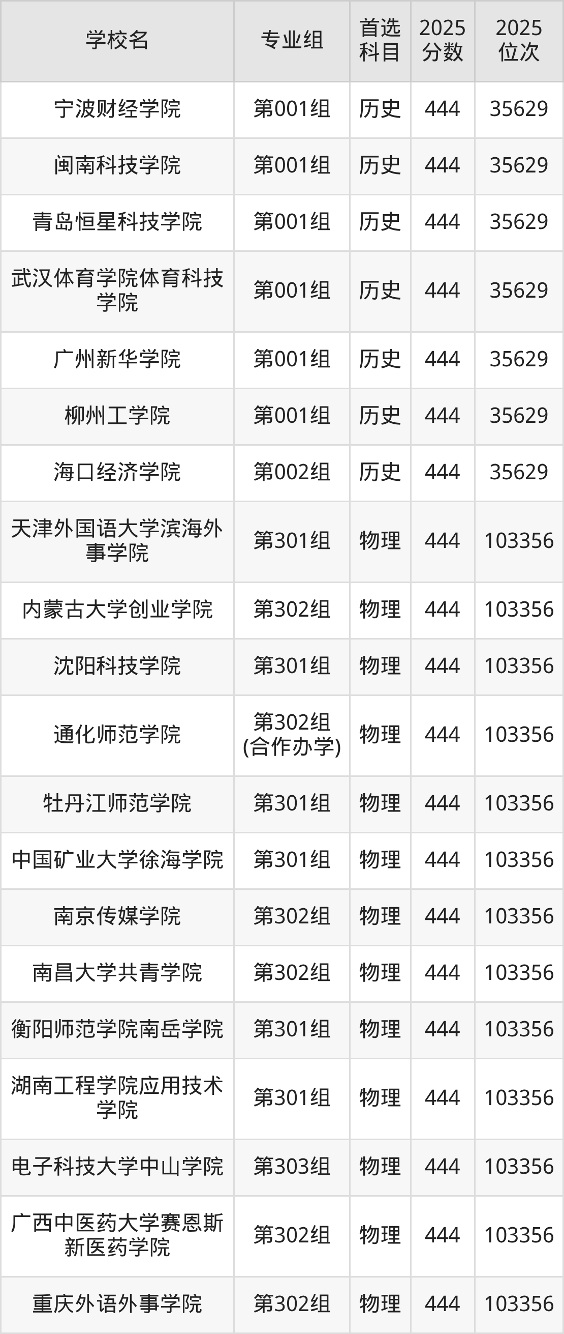 2025年在山西高考历史类录取分数线是444分的大学有北京工业大学耿丹学院、河北外国语学院、大连科技学院、大连东软信息学院、辽宁传媒学院、哈尔滨信息工程学院、齐齐哈尔工程学院、宁波财经学院、闽南科技学院、青岛恒星科技学院等。物理类录取分数线是444分的大学有天津外国语大学滨海外事学院、内蒙古大学创业学院、沈阳科技学院、通化师范学院、牡丹江师范学院、中国矿业大学徐海学院、南京传媒学院、南昌大学共青学院、衡阳师范学院南岳学院、湖南工程学院应用技术学院等。