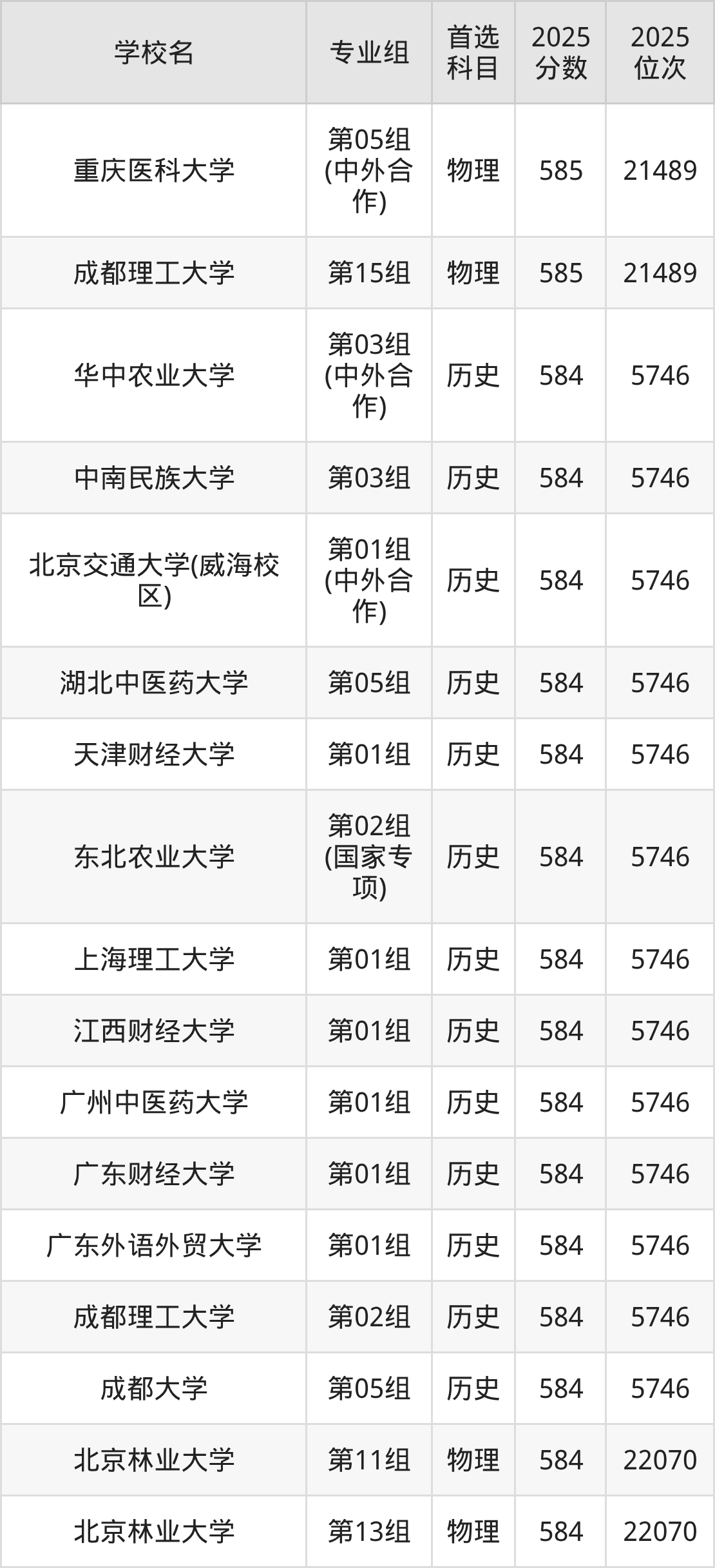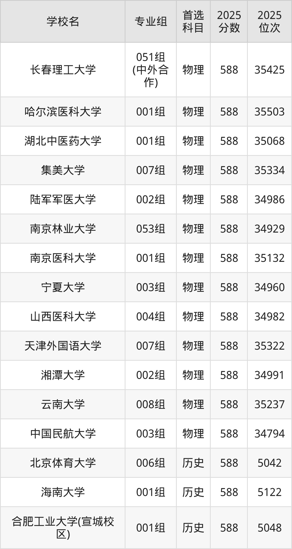 物理类586分可以冲的大学:长春理工大学588分、哈尔滨医科大学588分、湖北中医药大学588分、集美大学588分等;较稳妥的大学:重庆医科大学585分、东北电力大学585分、东北林业大学585分、华东交通大学585分等。
