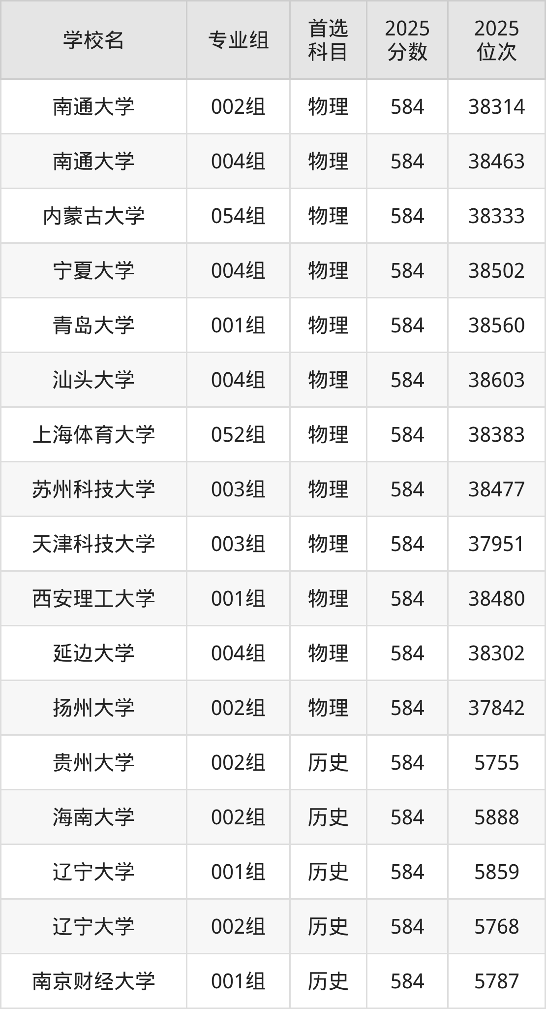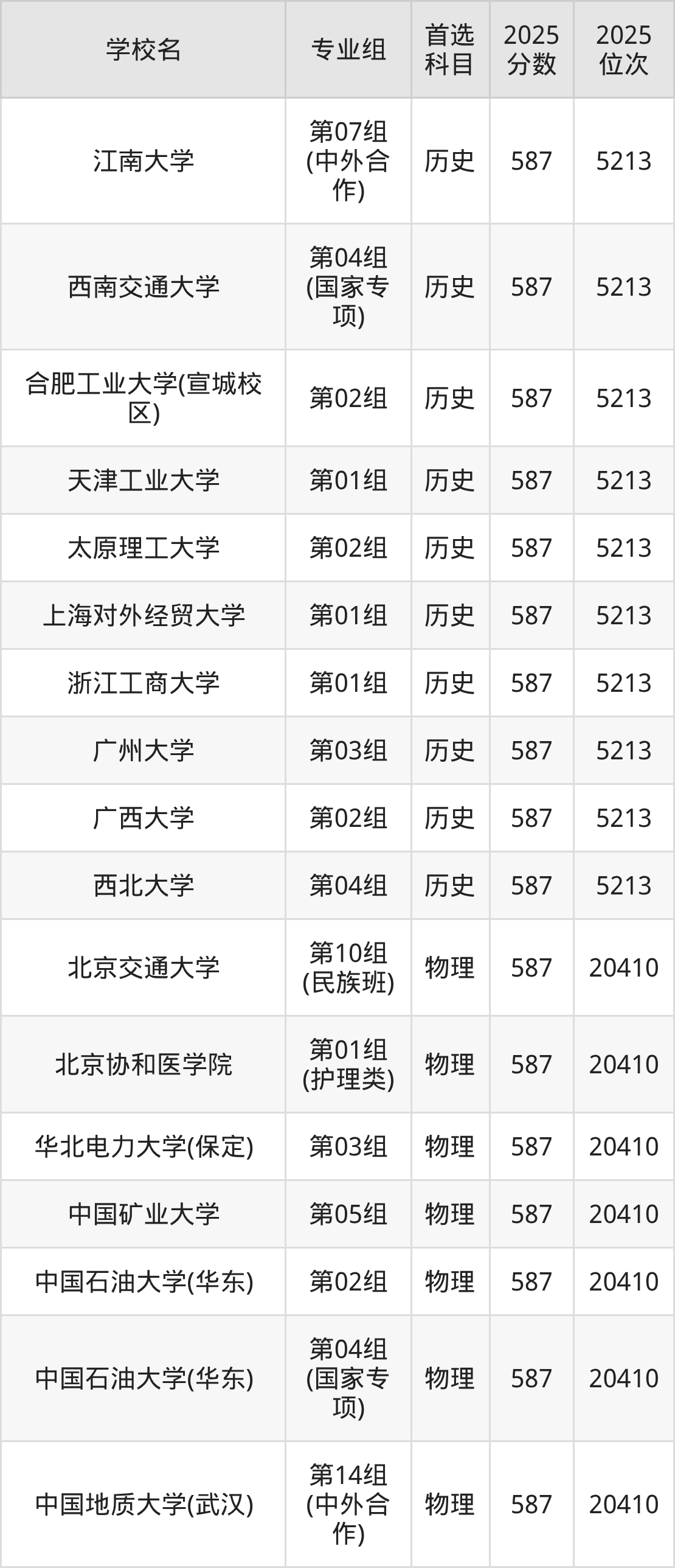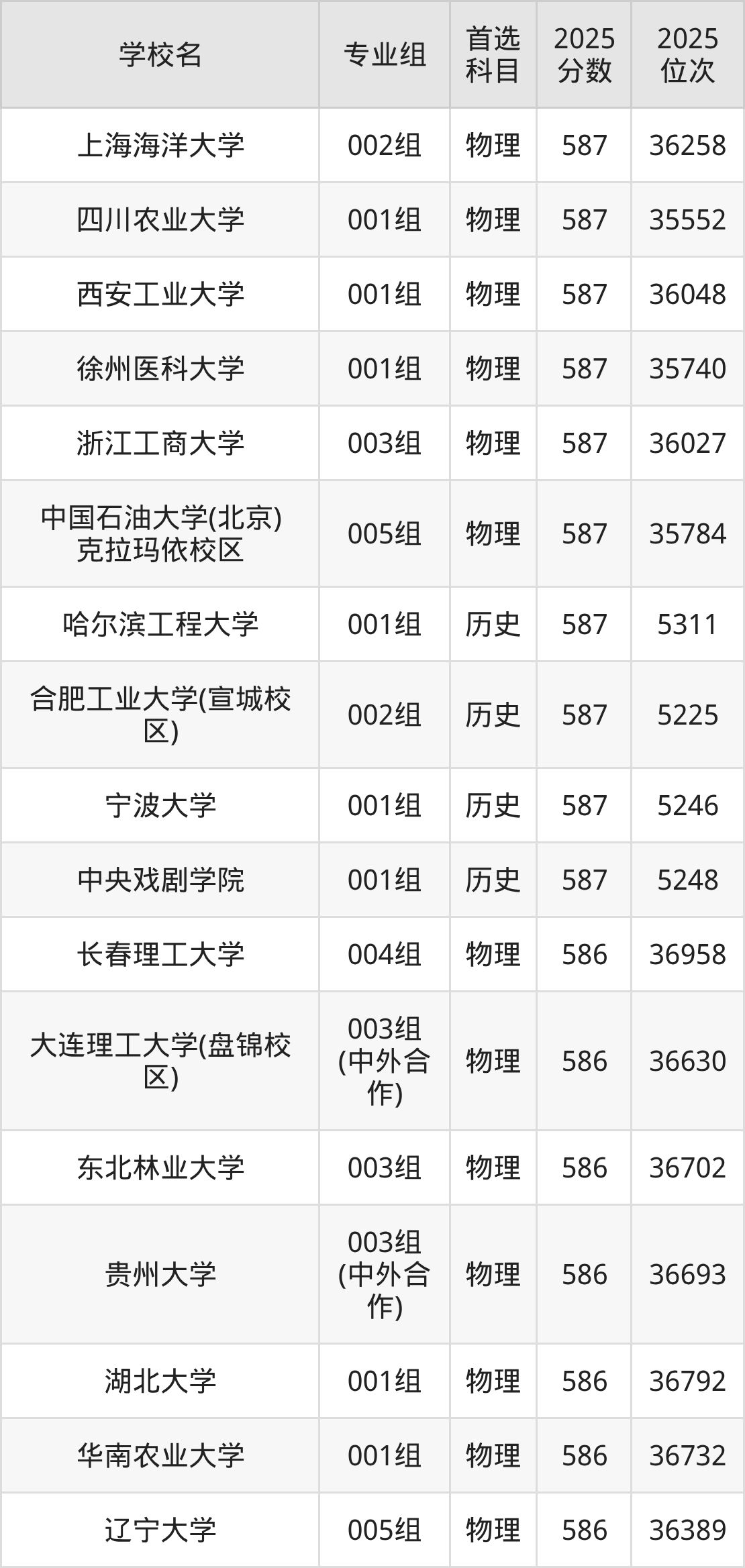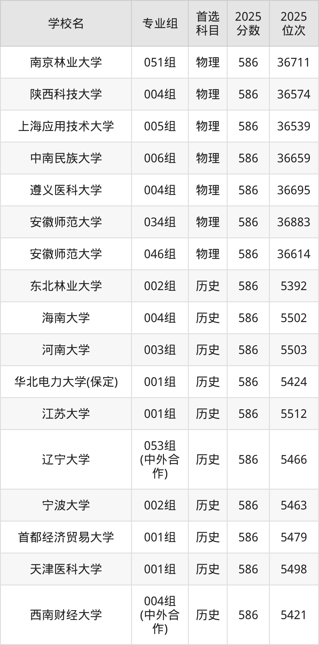 2025年在安徽高考物理类录取分数线是586分的大学有长春理工大学、大连理工大学(盘锦校区)、东北林业大学、贵州大学、湖北大学、华南农业大学、辽宁大学、南京林业大学、陕西科技大学、上海应用技术大学等。历史类录取分数线是586分的大学有东北林业大学、海南大学、河南大学、华北电力大学(保定)、江苏大学、辽宁大学、宁波大学、首都经济贸易大学、天津医科大学、西南财经大学等。