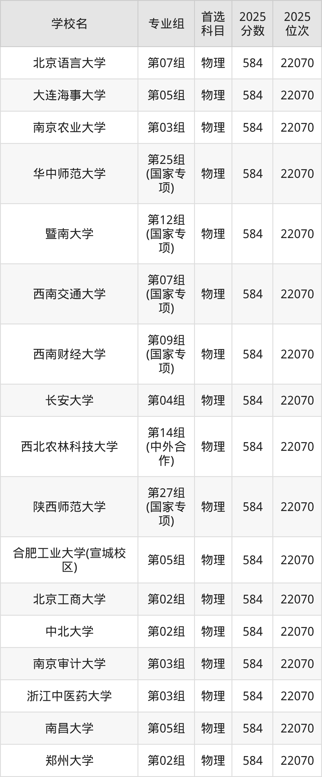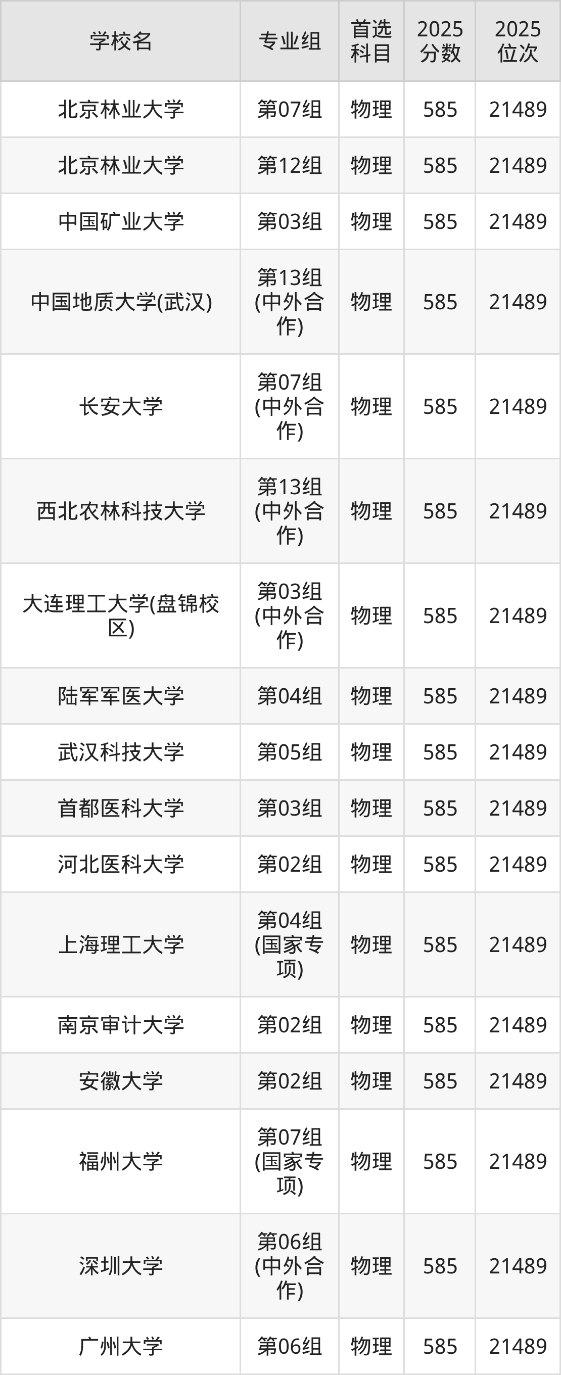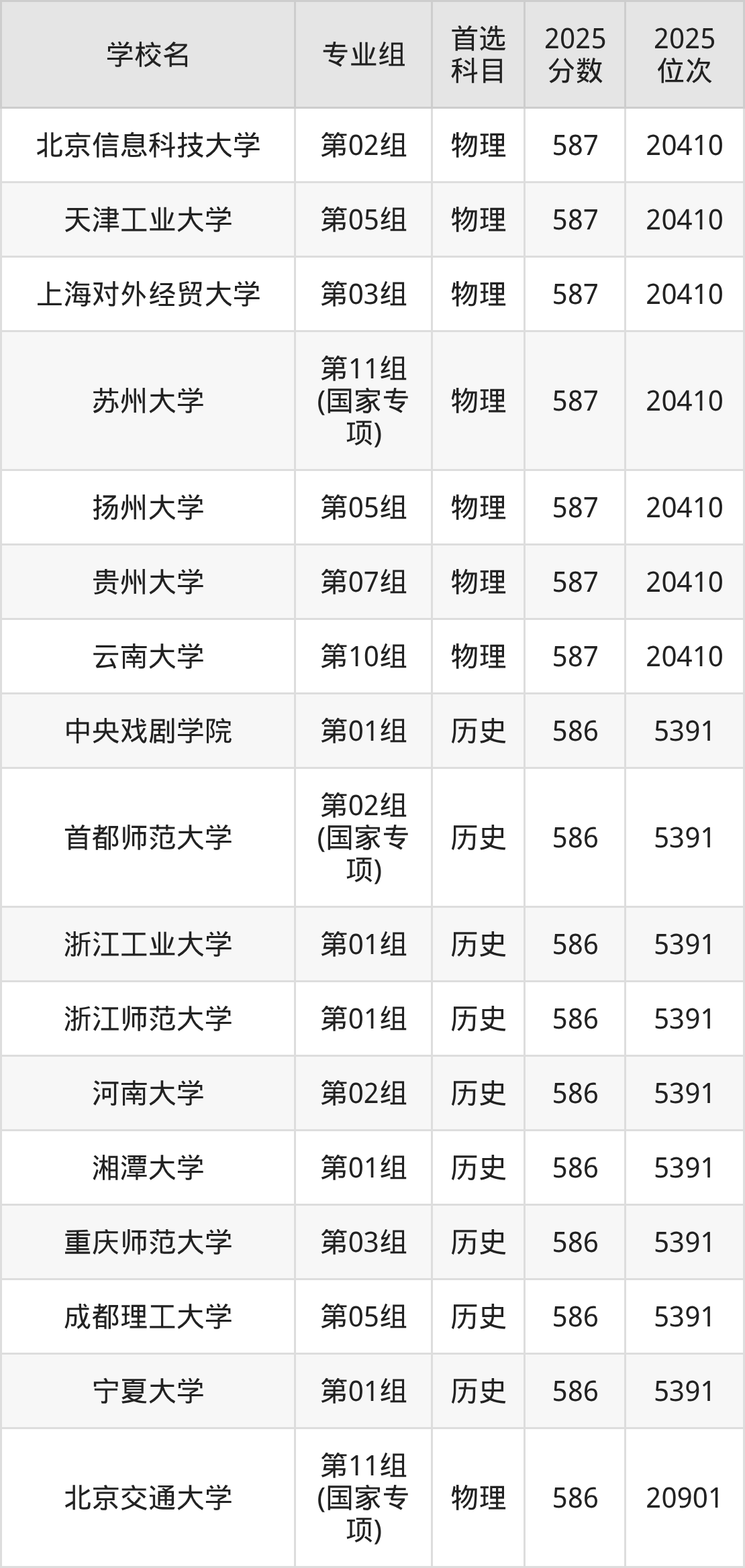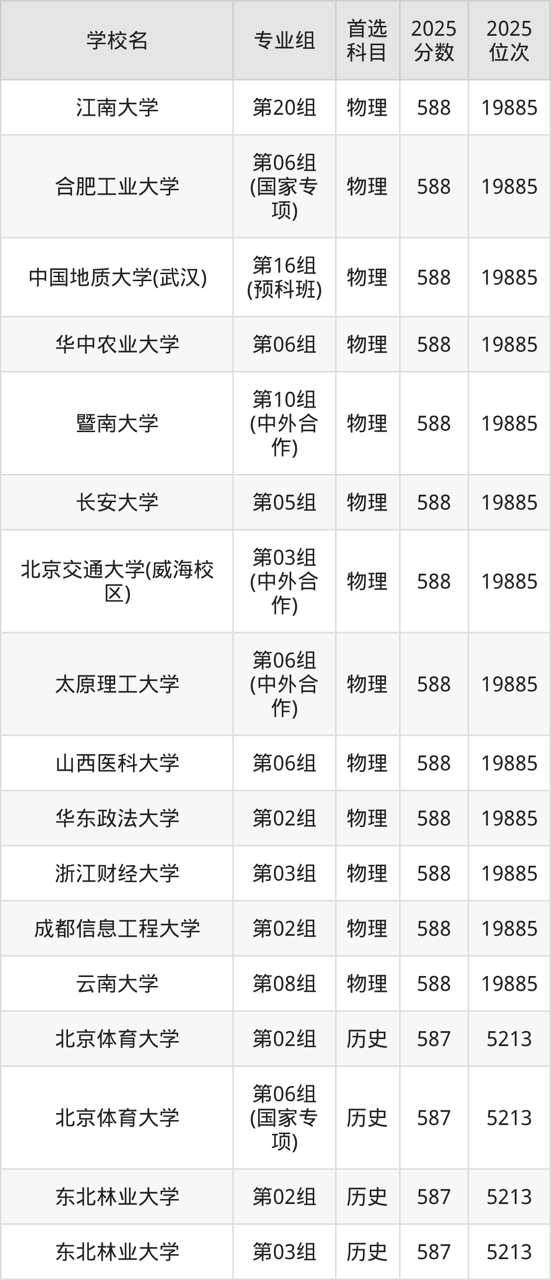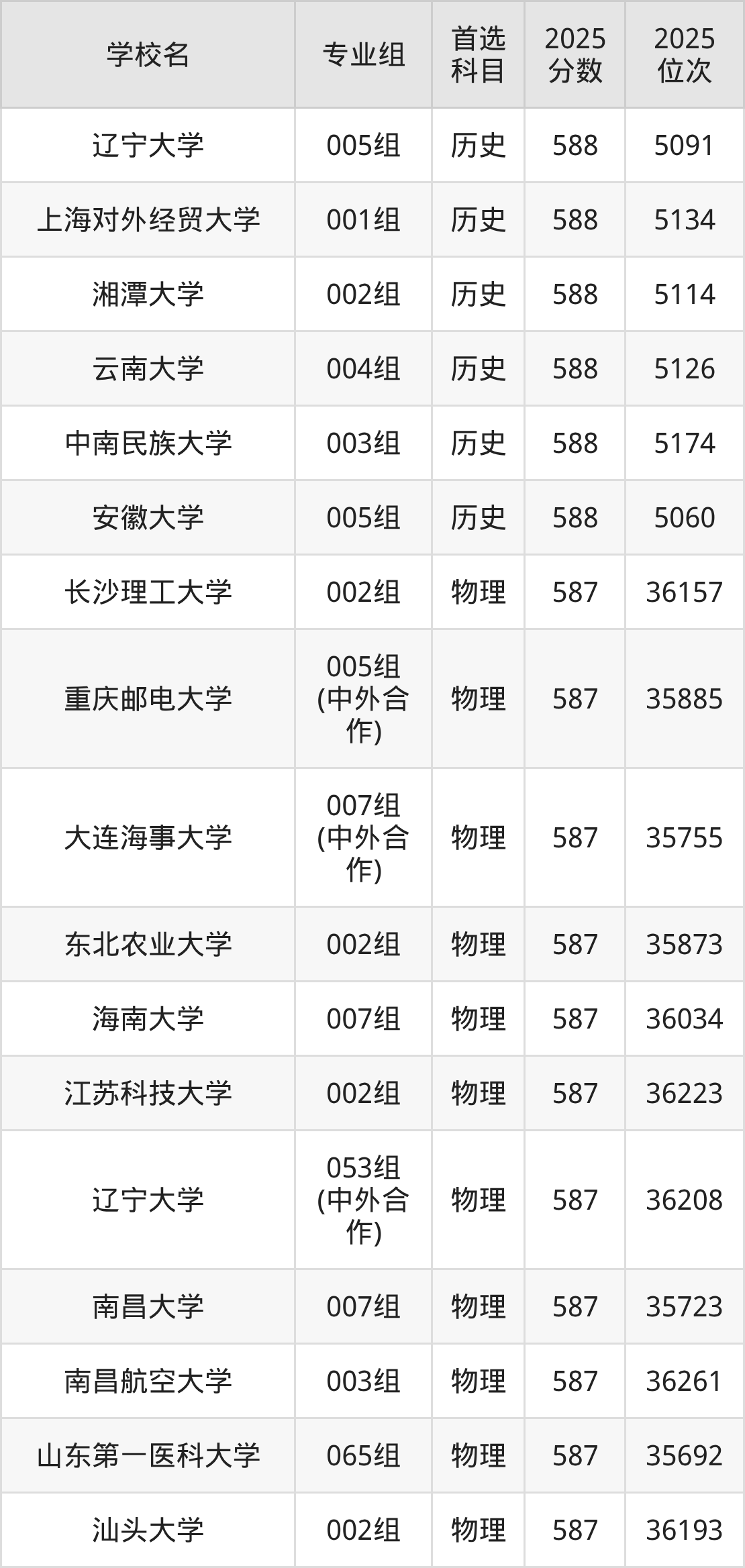 2025年在安徽高考物理类录取分数线是586分的大学有长春理工大学、大连理工大学(盘锦校区)、东北林业大学、贵州大学、湖北大学、华南农业大学、辽宁大学、南京林业大学、陕西科技大学、上海应用技术大学等。历史类录取分数线是586分的大学有东北林业大学、海南大学、河南大学、华北电力大学(保定)、江苏大学、辽宁大学、宁波大学、首都经济贸易大学、天津医科大学、西南财经大学等。