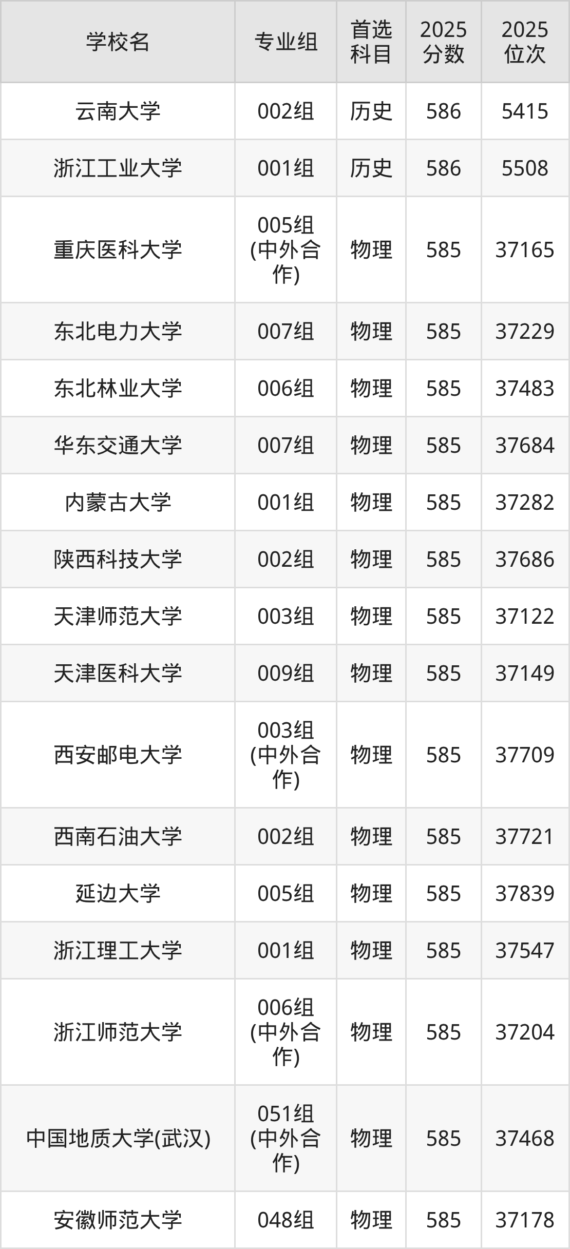 安徽高考物理类586分对应的位次排名是36389名-36958名,历史类586分对应的位次排名是5392名-5512名,因此建议2026年位次排在这附近的同学考虑这些大学。