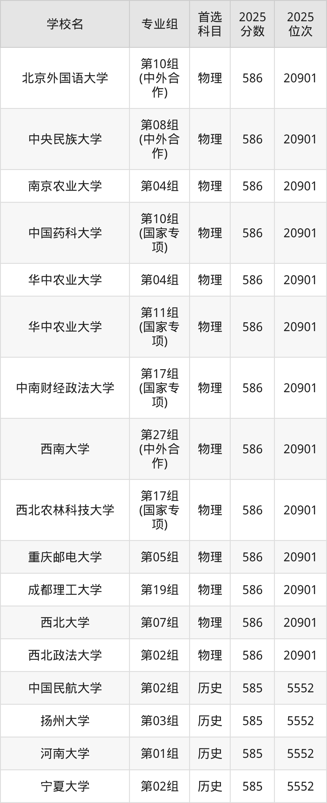 2025年在湖北高考历史类录取分数线是586分的大学有中央戏剧学院、首都师范大学、浙江工业大学、浙江师范大学、河南大学、湘潭大学、重庆师范大学、成都理工大学、宁夏大学。物理类录取分数线是586分的大学有北京交通大学、北京外国语大学、中央民族大学、南京农业大学、中国药科大学、华中农业大学、中南财经政法大学、西南大学、西北农林科技大学、重庆邮电大学等。