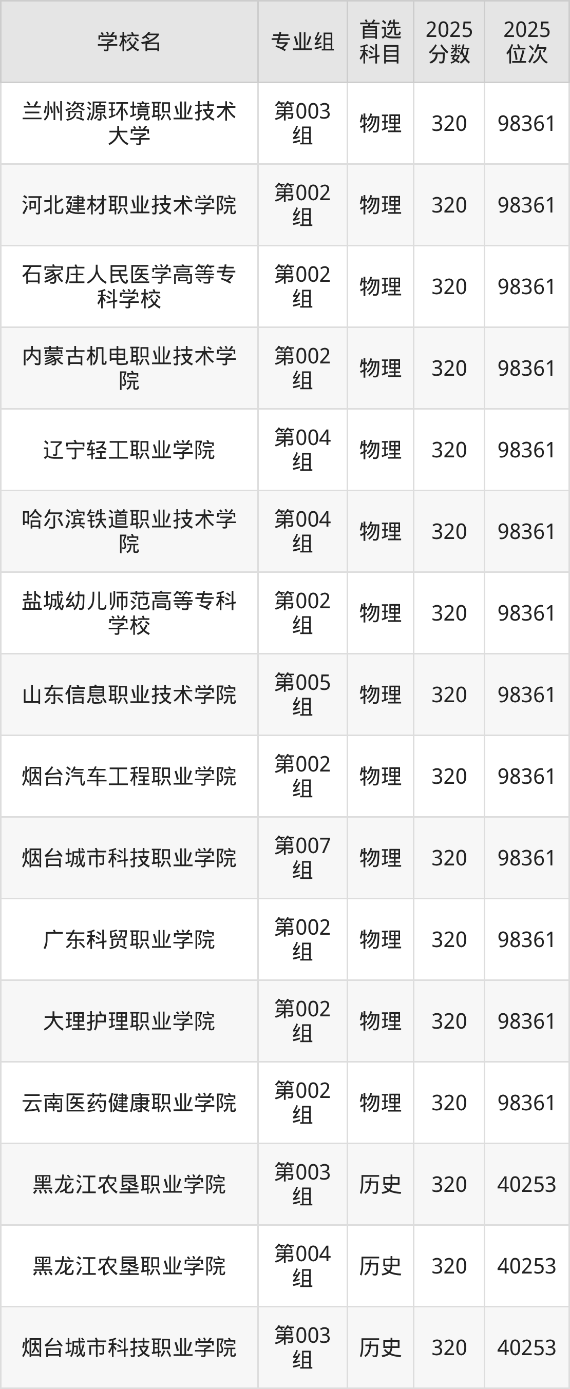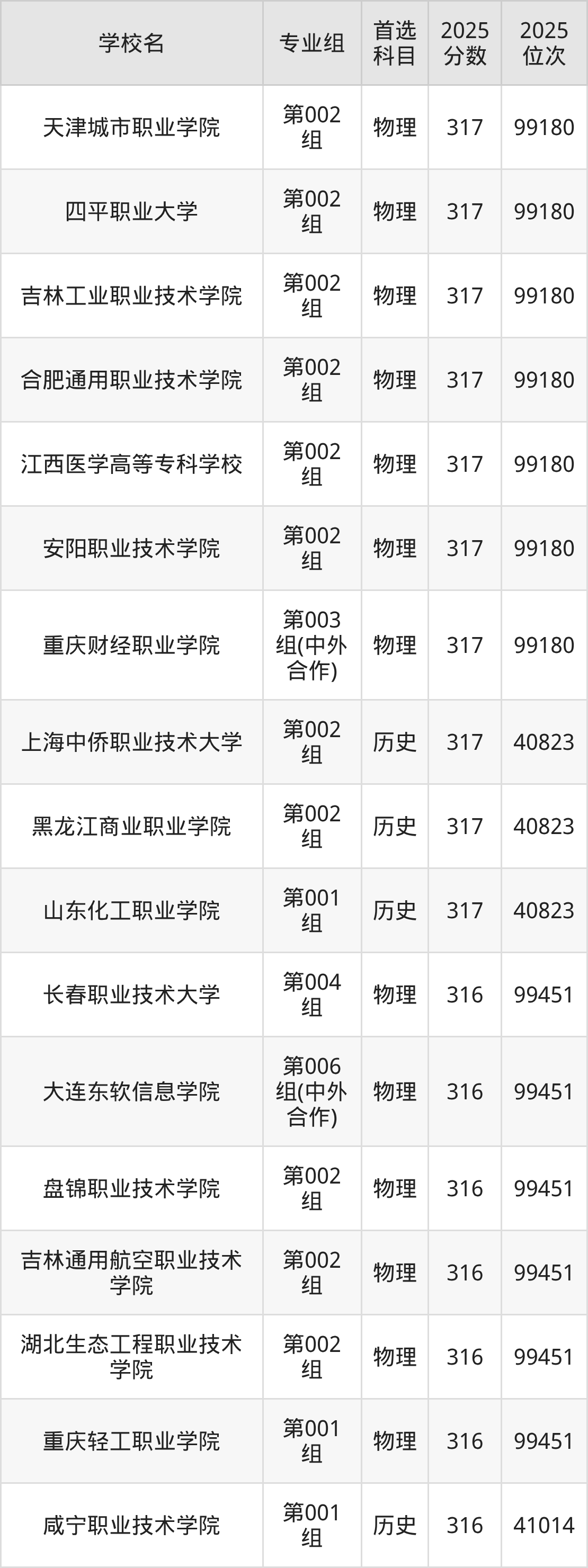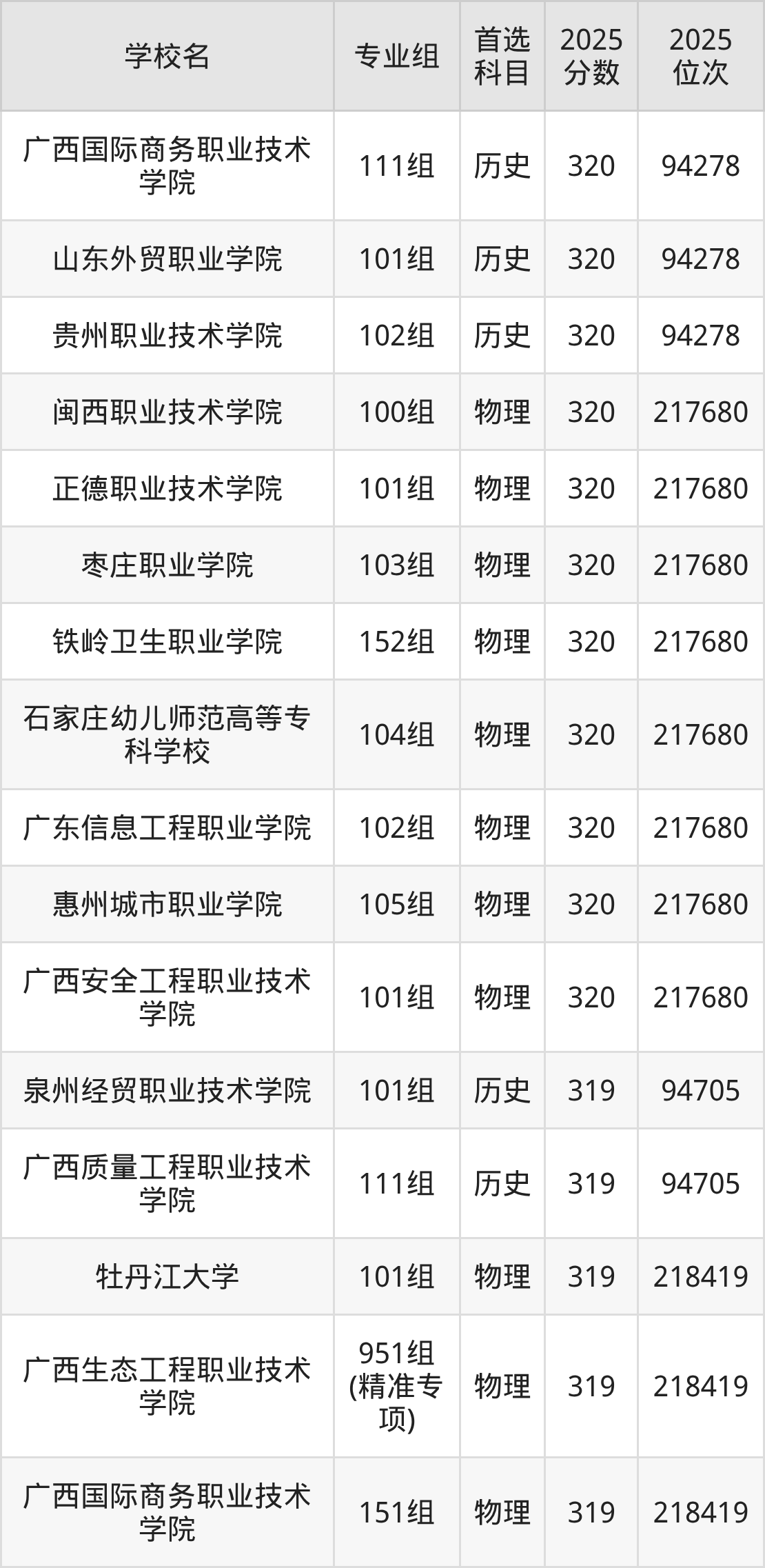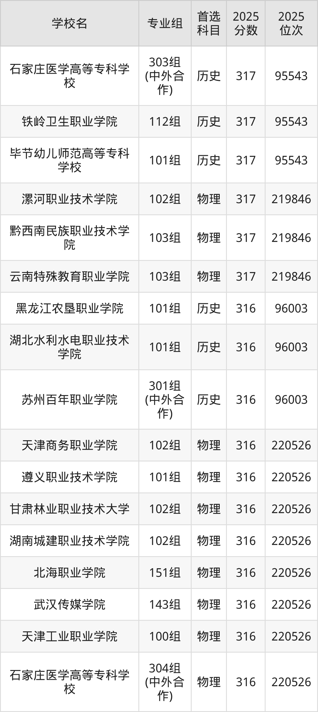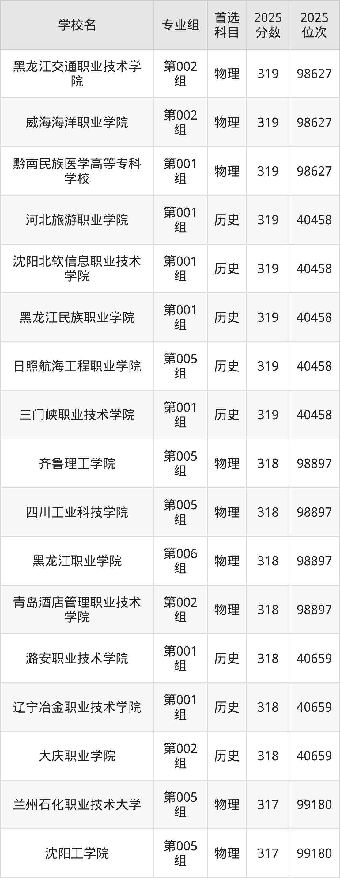 2025年在黑龙江高考物理类录取分数线是318分的大学有齐鲁理工学院、四川工业科技学院、黑龙江职业学院、青岛酒店管理职业技术学院。历史类录取分数线是318分的大学有潞安职业技术学院、辽宁冶金职业技术学院、大庆职业学院。