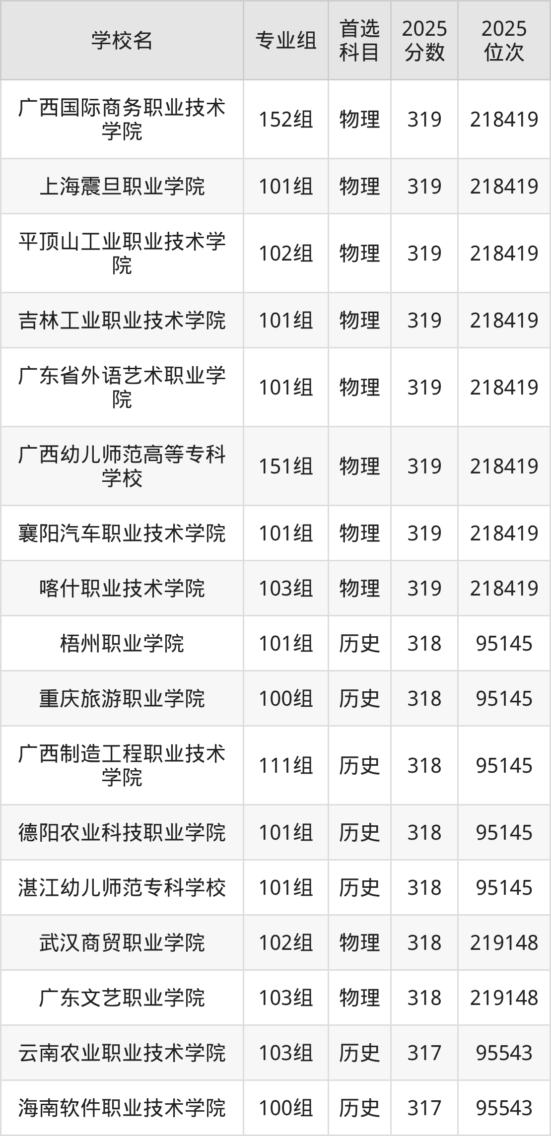 2025年在广西高考历史类录取分数线是318分的大学有梧州职业学院、重庆旅游职业学院、广西制造工程职业技术学院、德阳农业科技职业学院、湛江幼儿师范专科学校。物理类录取分数线是318分的大学有武汉商贸职业学院、广东文艺职业学院。