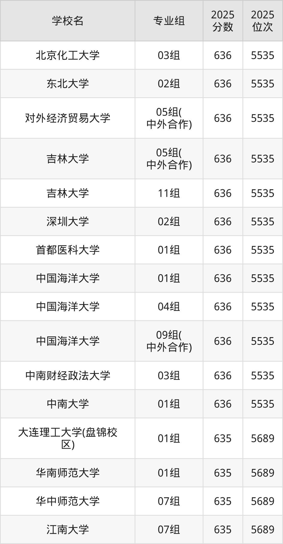 634分可以冲一冲的大学:北京化工大学636分、东北大学636分、对外经济贸易大学636分、吉林大学636分等;