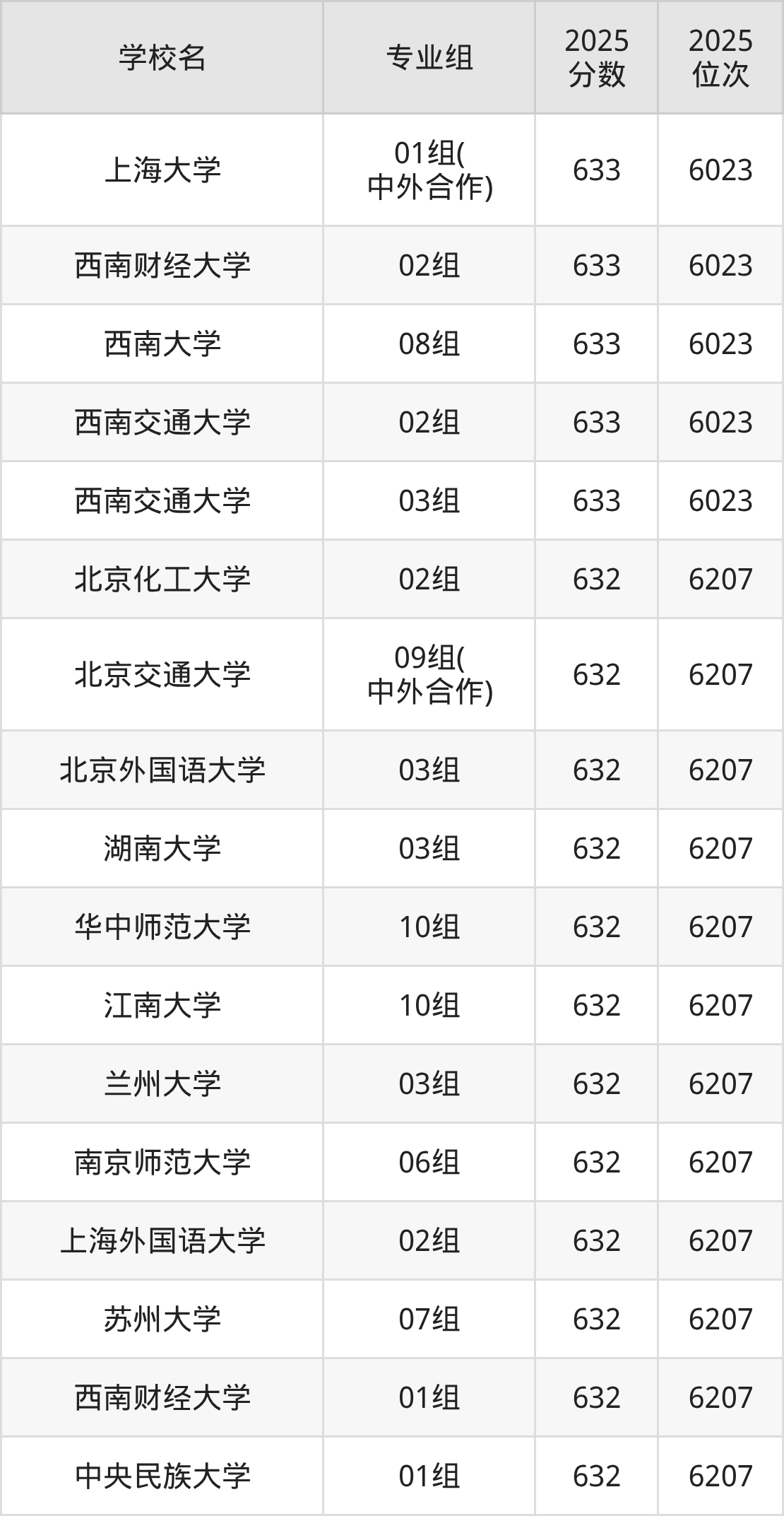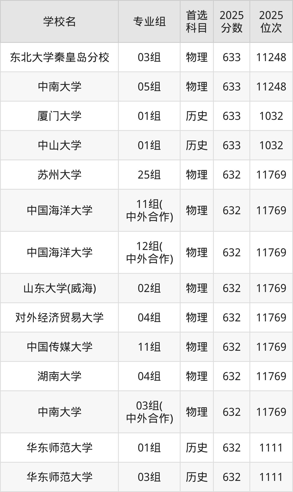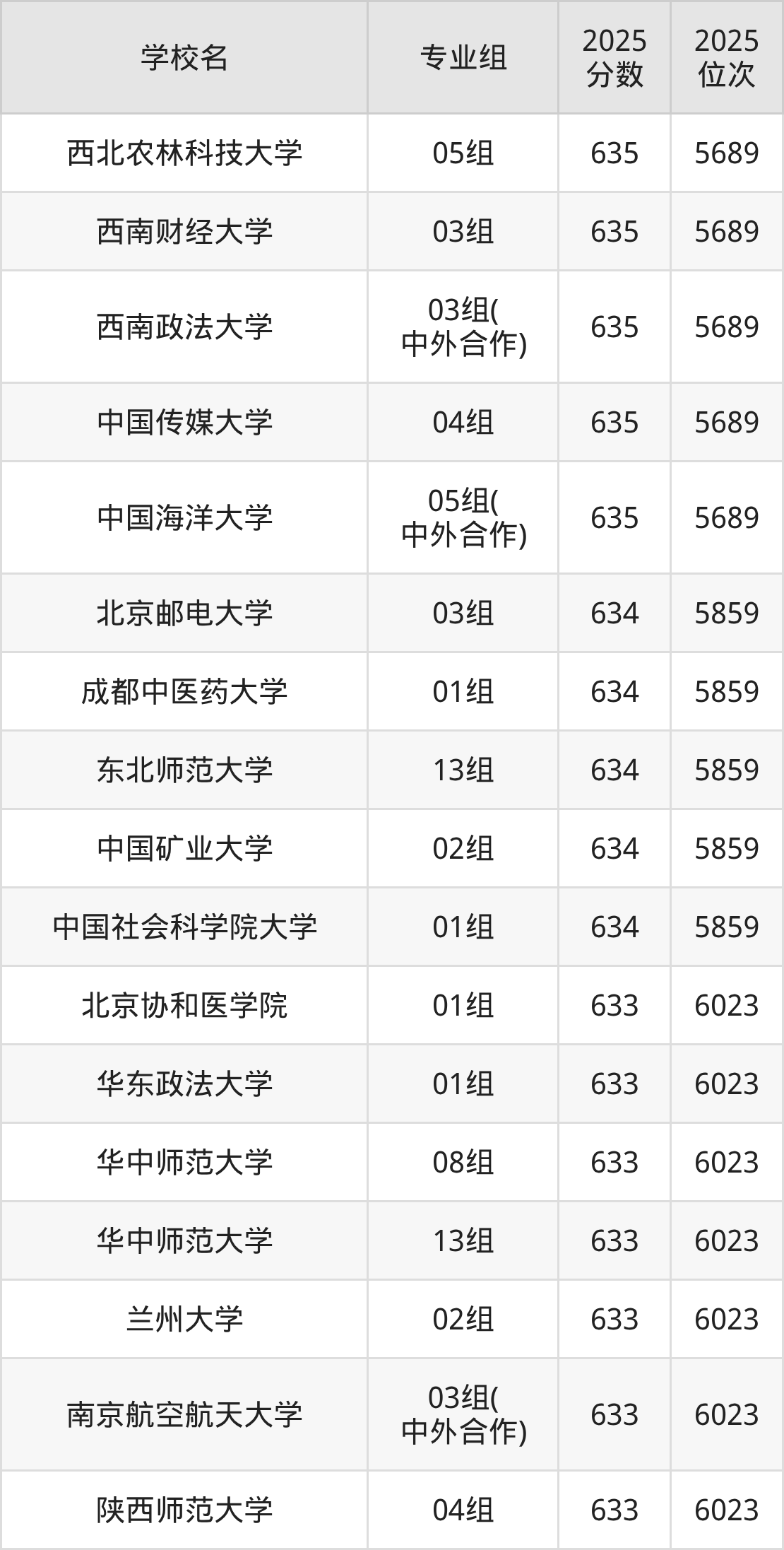 634分较稳妥的大学:北京协和医学院633分、华东政法大学633分、华中师范大学633分、兰州大学633分等。