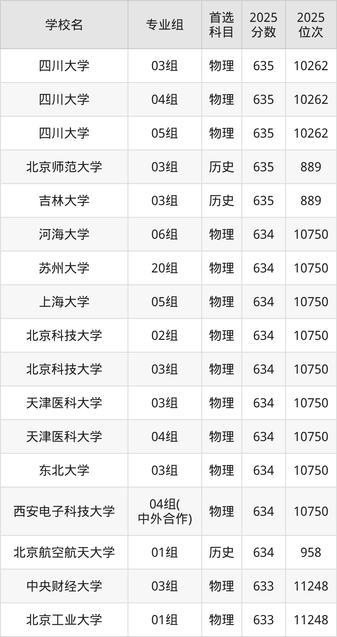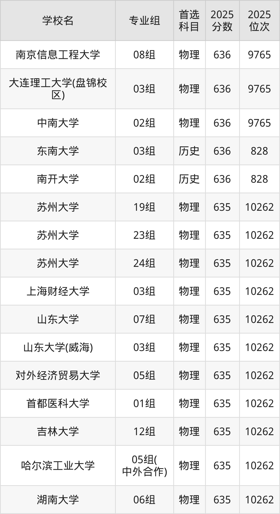 江苏高考物理类634分对应的位次排名是10750名,历史类634分对应的位次排名是958名,因此建议2026年位次排在这附近的同学考虑这些大学。