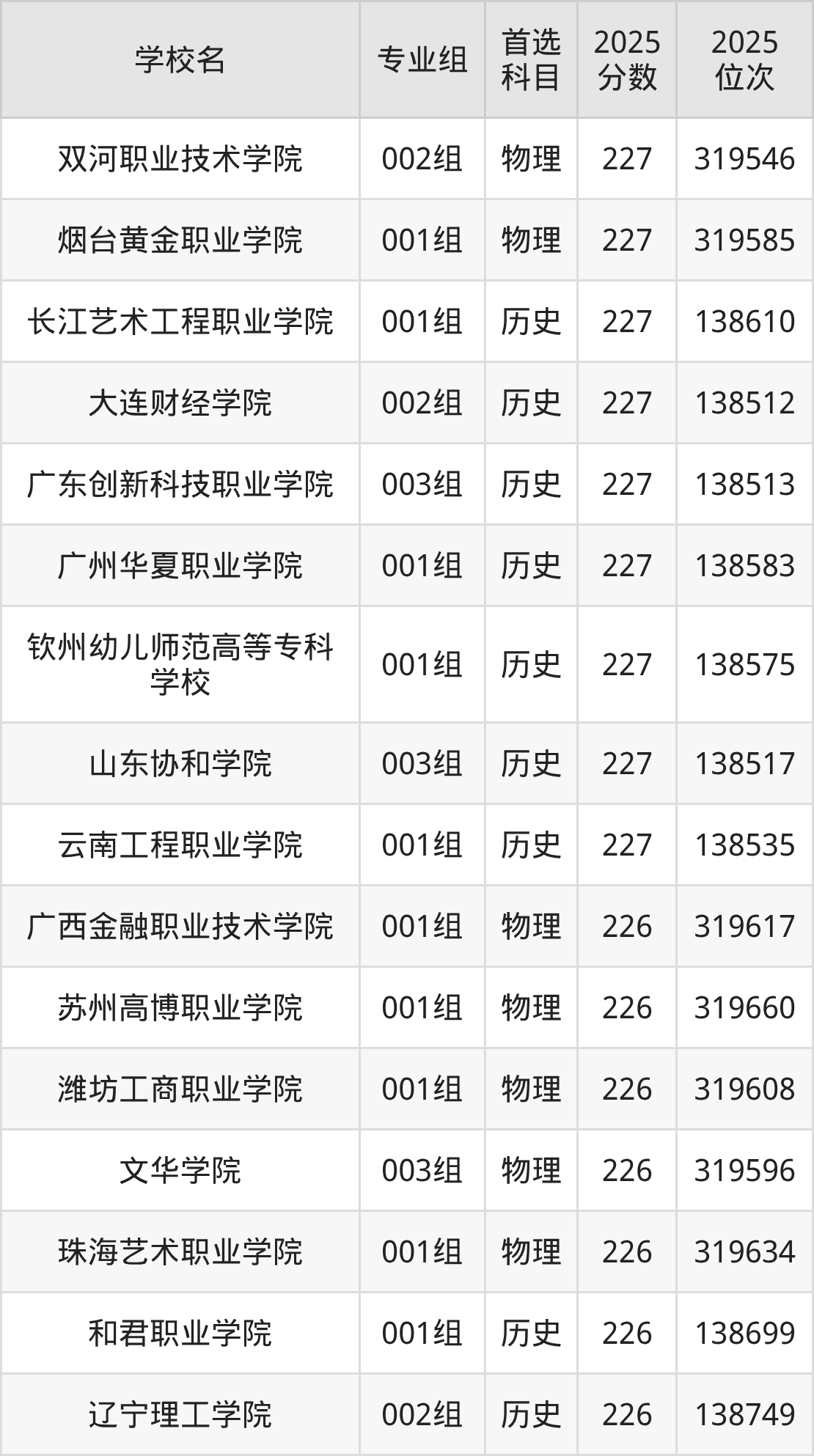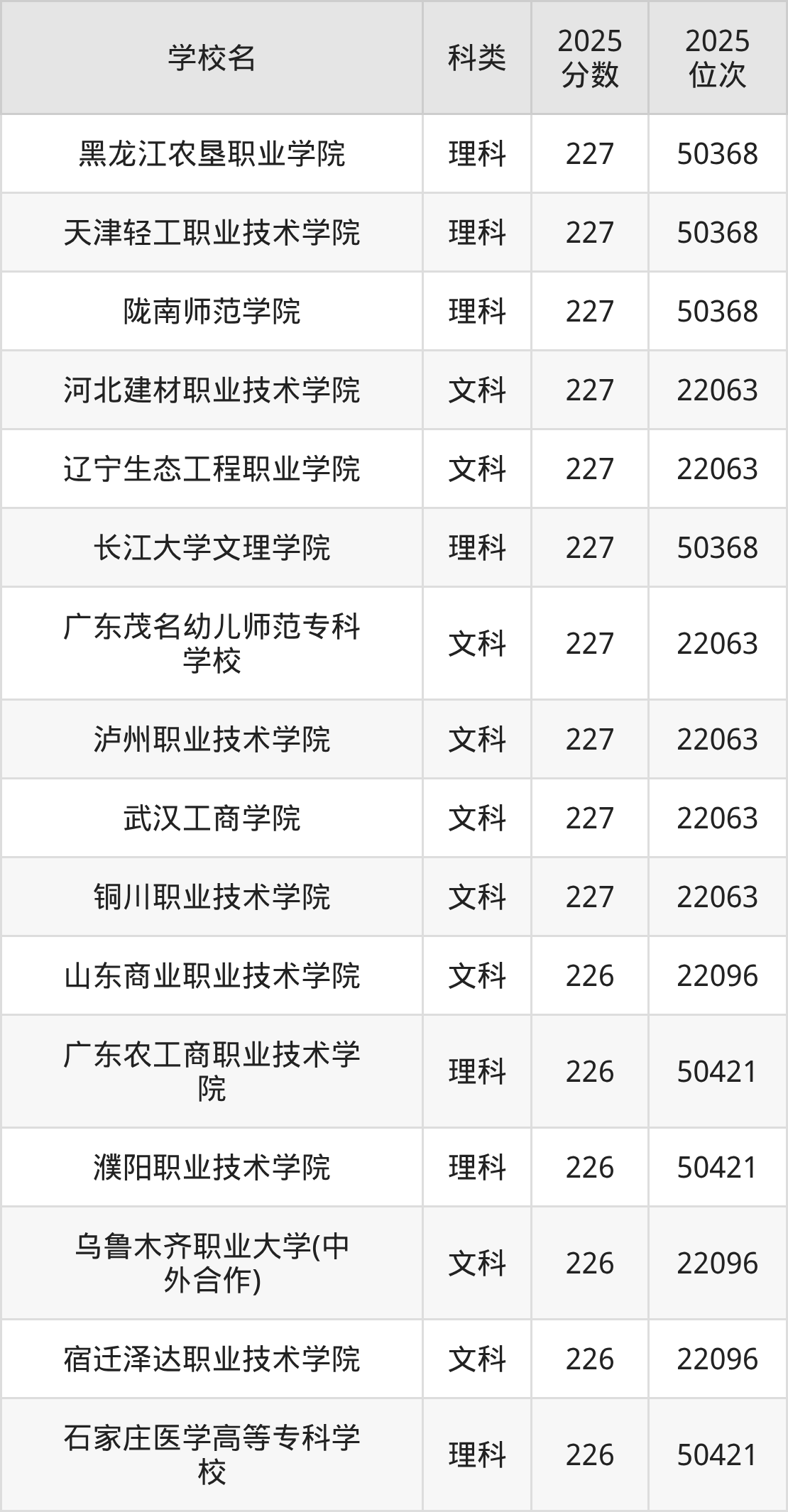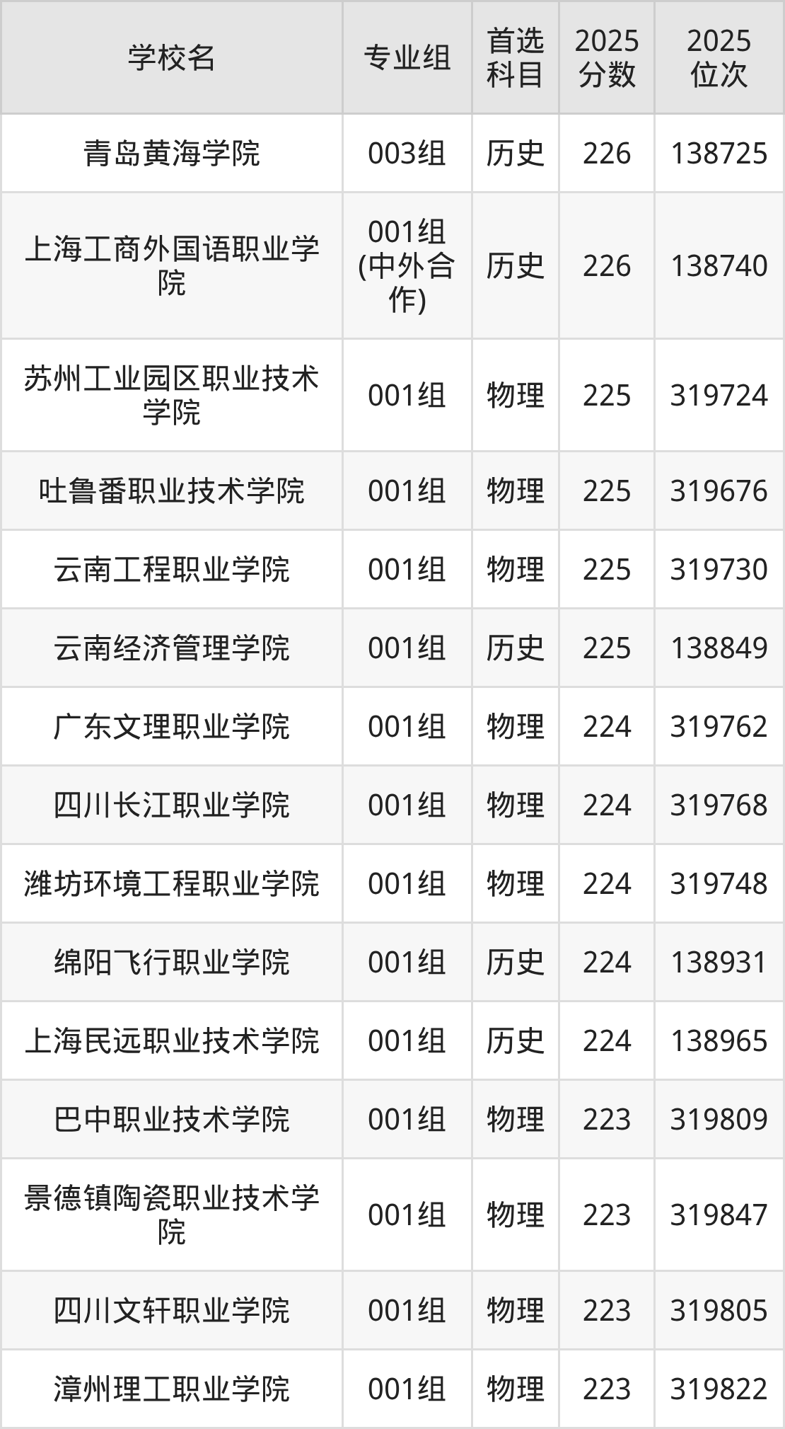 下面老师将以上文整理的其中两个省份为例,为大家具体展示225分左右能上的专科大学名单。