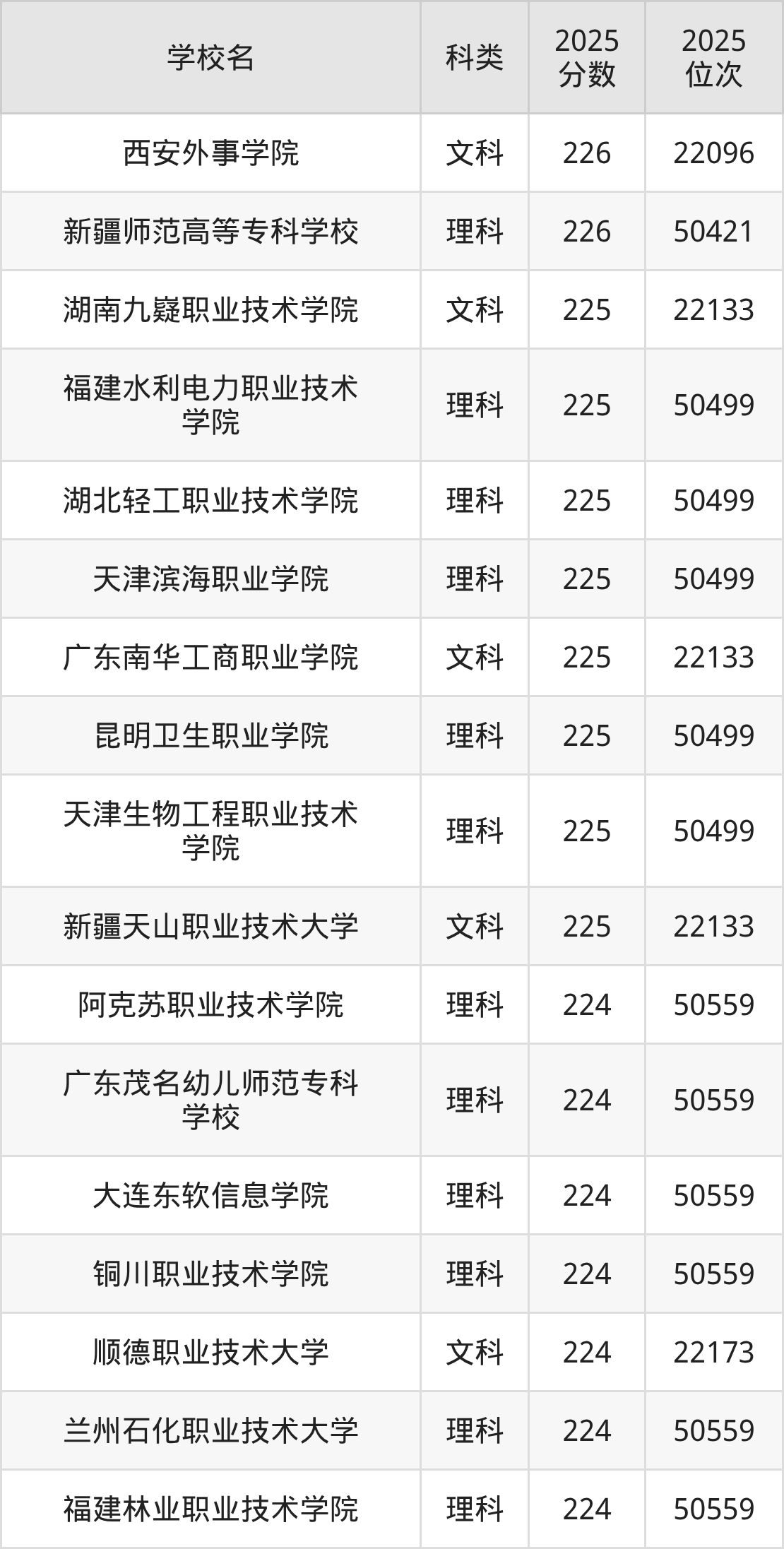 2025年在新疆高考文科录取分数线是225分的大学有湖南九嶷职业技术学院、广东南华工商职业学院、新疆天山职业技术大学。理科录取分数线是225分的大学有福建水利电力职业技术学院、湖北轻工职业技术学院、天津滨海职业学院、昆明卫生职业学院、天津生物工程职业技术学院。
