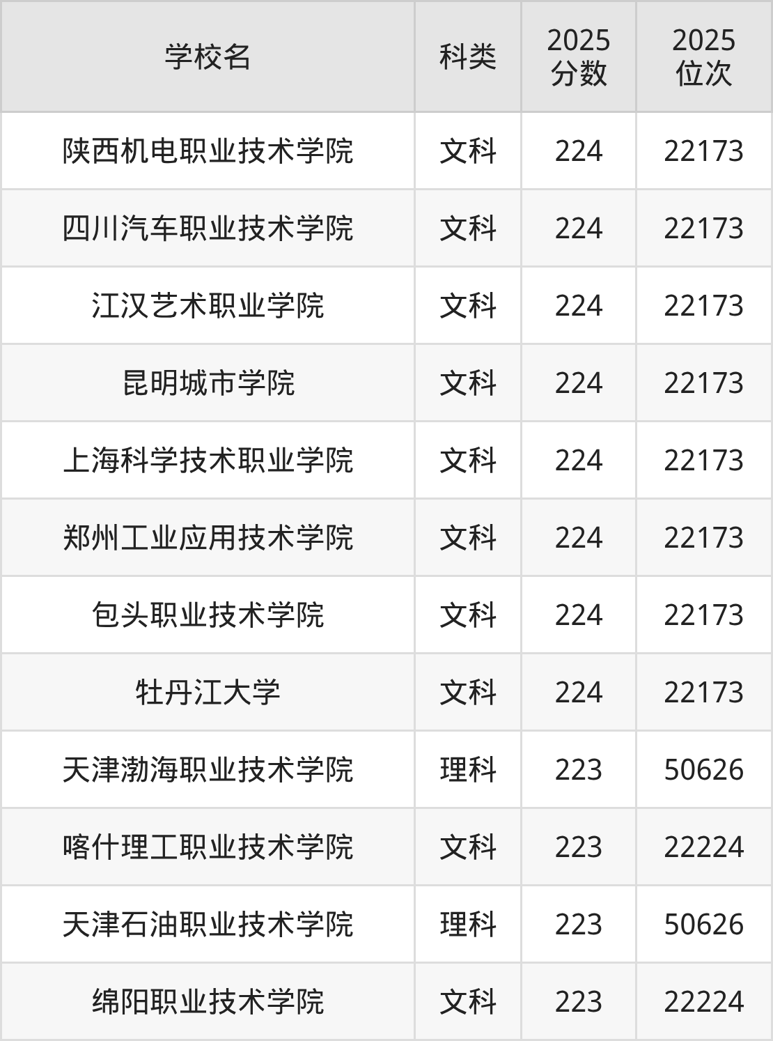2025年在安徽高考物理类录取分数线是225分的大学有苏州工业园区职业技术学院、吐鲁番职业技术学院、云南工程职业学院。历史类录取分数线是225分的大学有云南经济管理学院。