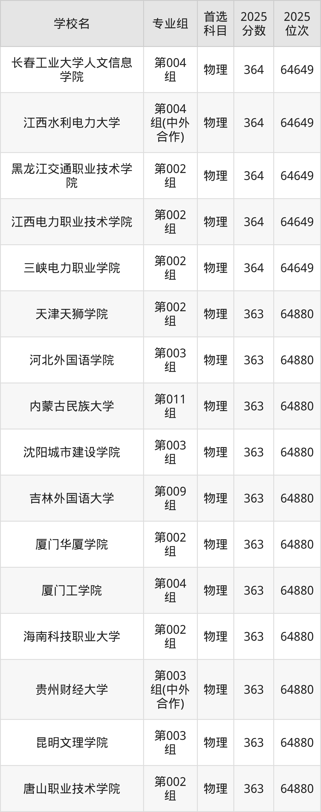 362分可以冲一冲的大学:长春工业大学人文信息学院364分、江西水利电力大学364分、黑龙江交通职业技术学院364分、江西电力职业技术学院364分等;