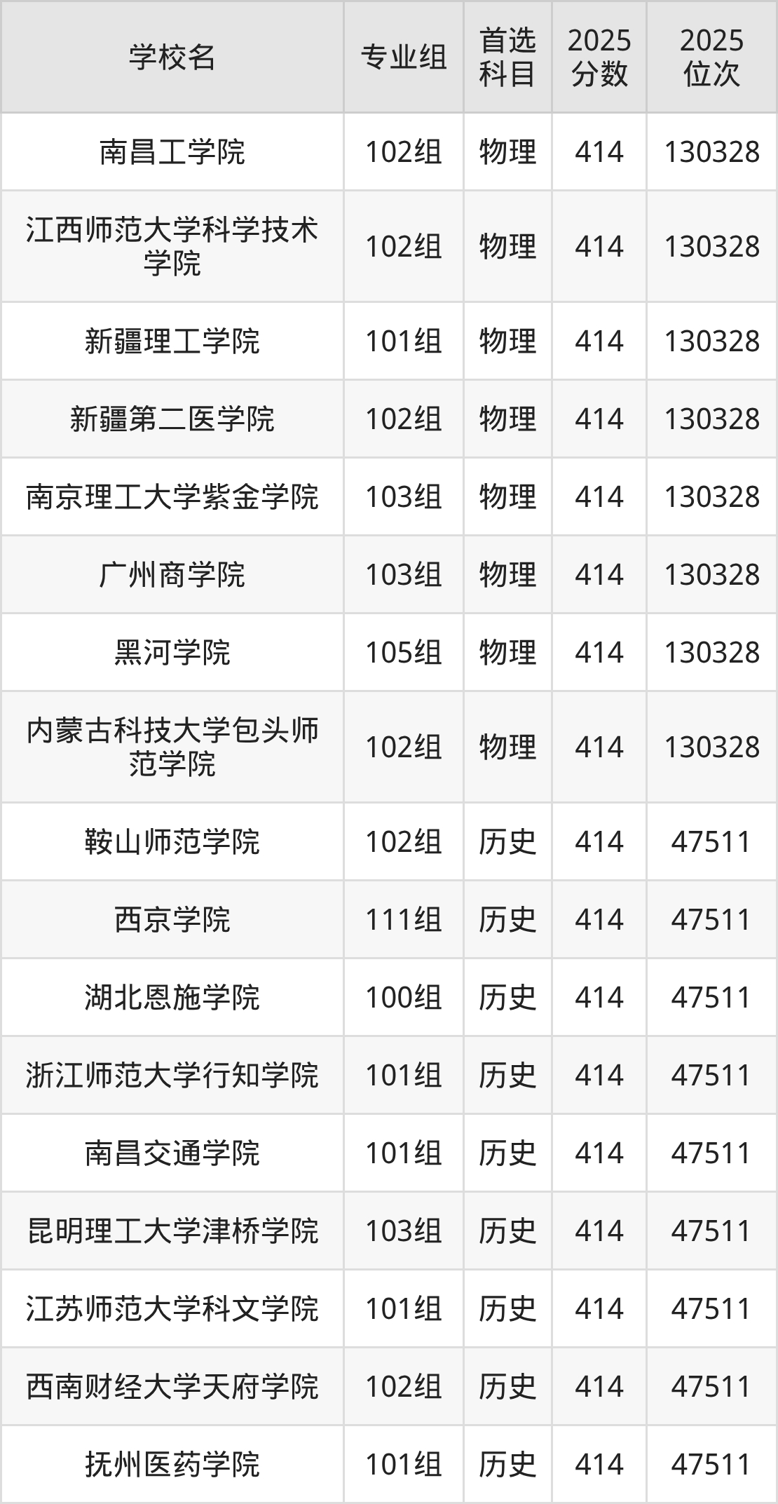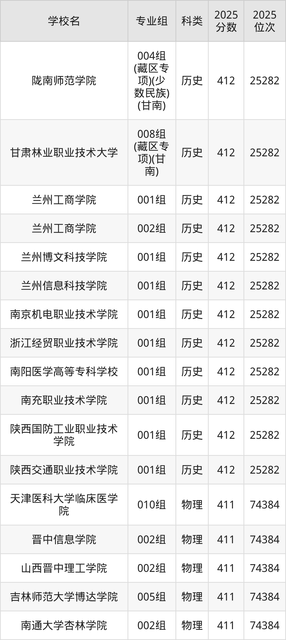 2025年在广西高考历史类录取分数线是412分的大学有南宁学院、岳阳学院、湖北工业大学工程技术学院、福建师范大学协和学院、桂林学院、黑河学院、成都锦城学院、江苏大学京江学院、江苏科技大学苏州理工学院、上海财经大学浙江学院等。物理类录取分数线是412分的大学有天津职业技术师范大学、内蒙古民族大学、大连工业大学、鞍山师范学院、黑龙江八一农垦大学、哈尔滨商业大学、新疆和田学院、天津城建大学、辽东学院、湖南工程学院应用技术学院等。