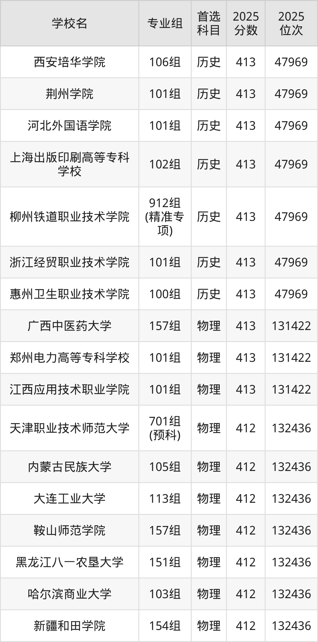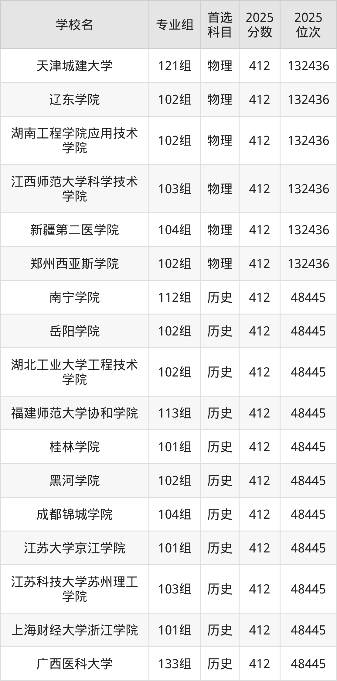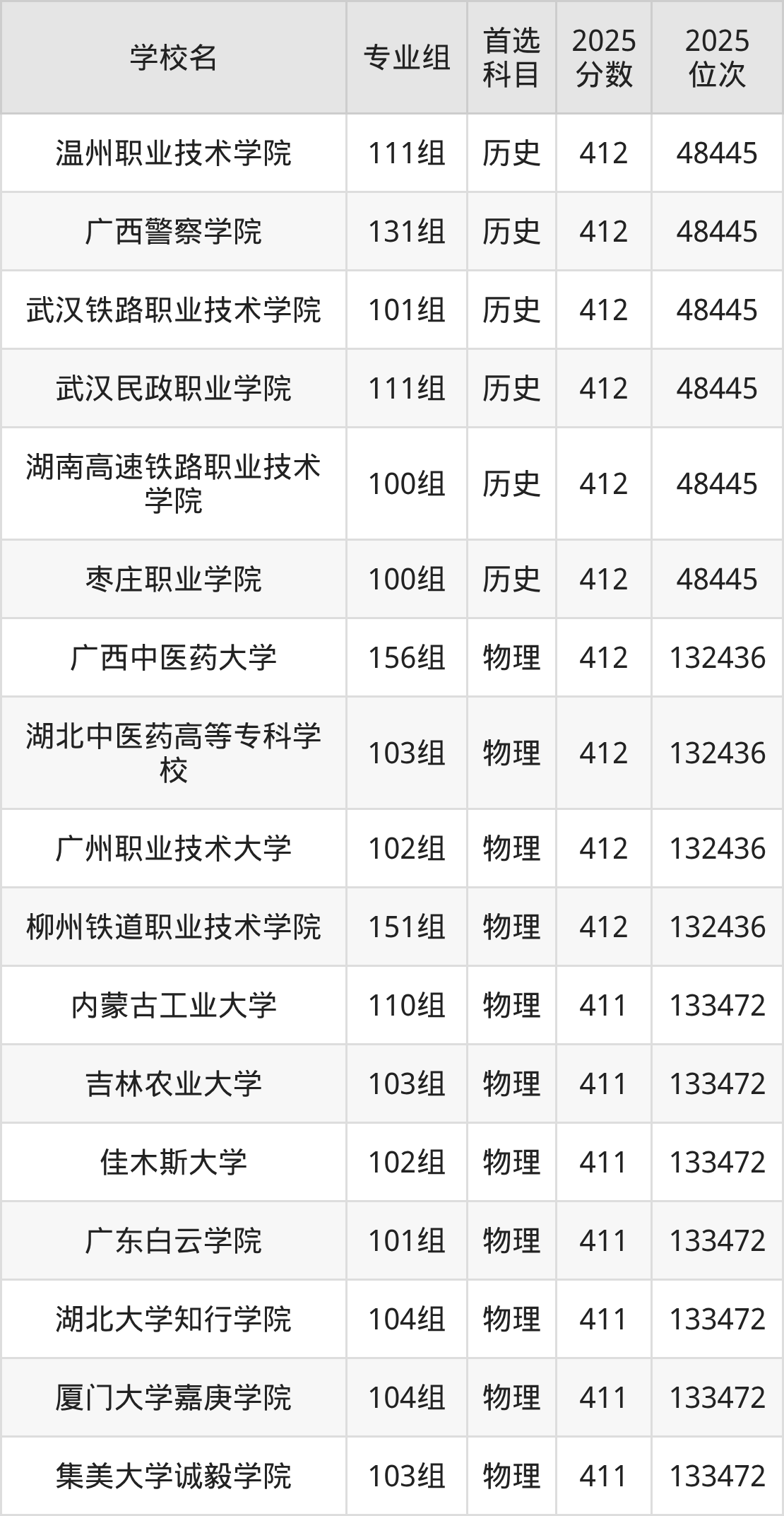 广西高考物理类412分对应的位次排名是132436名,历史类412分对应的位次排名是48445名,因此建议2026年位次排在这附近的同学考虑这些大学。
