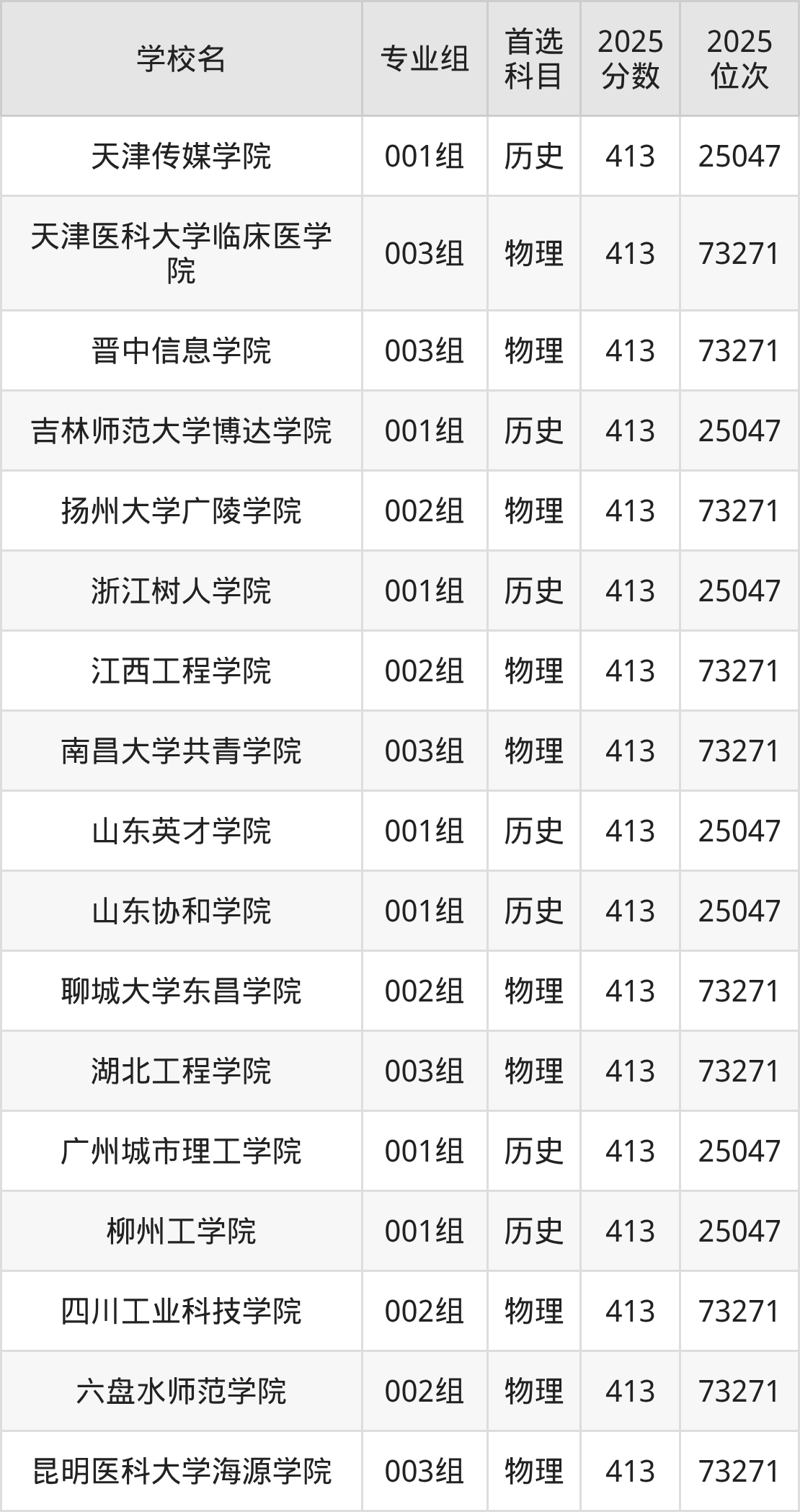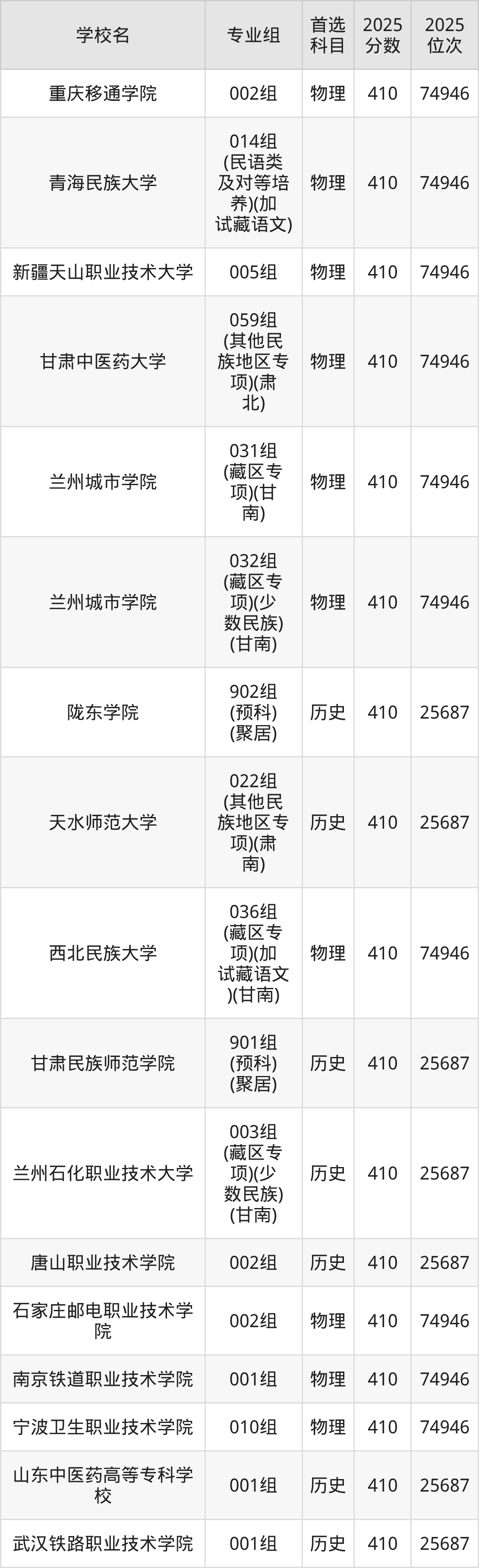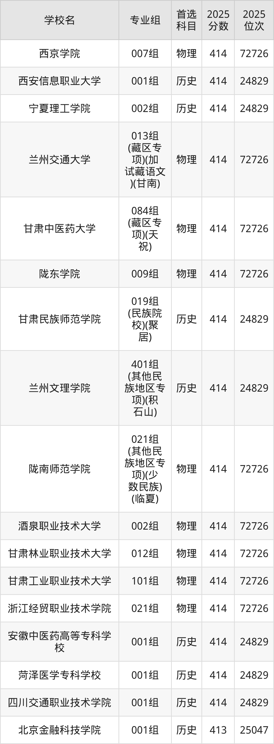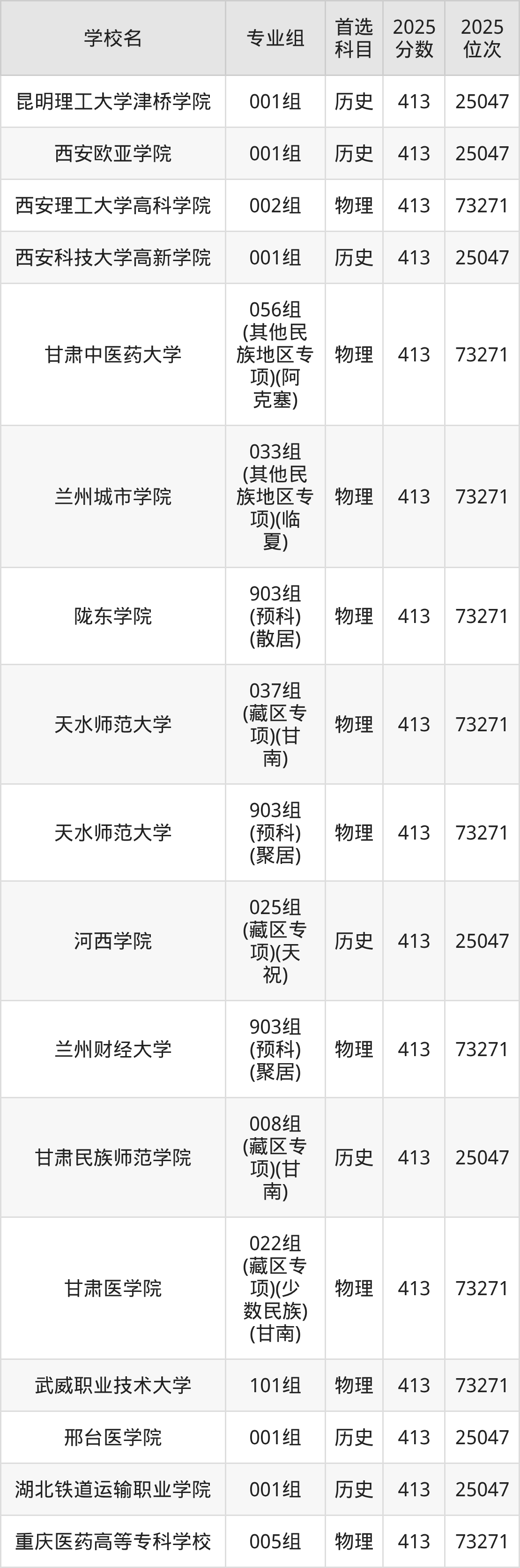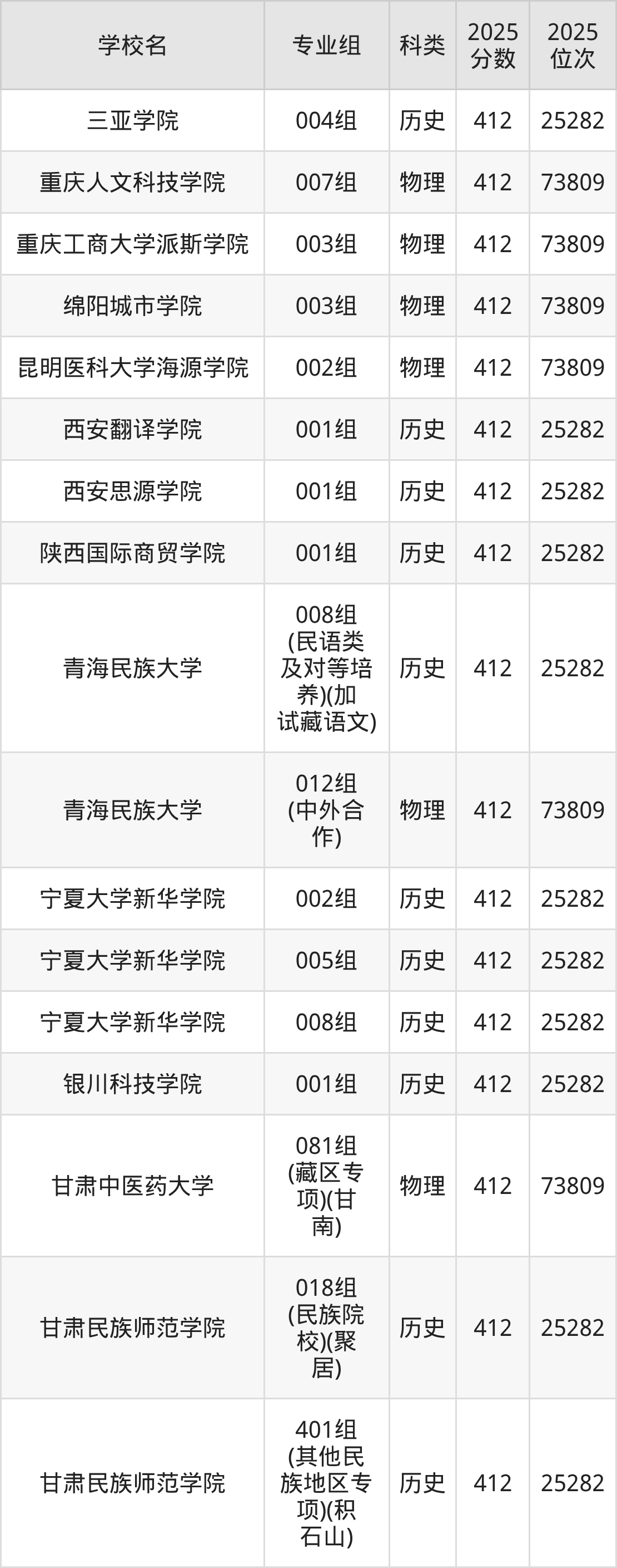 甘肃高考物理类412分对应的位次排名是73809名,历史类412分对应的位次排名是25282名,因此建议2026年位次排在这附近的同学考虑这些大学。