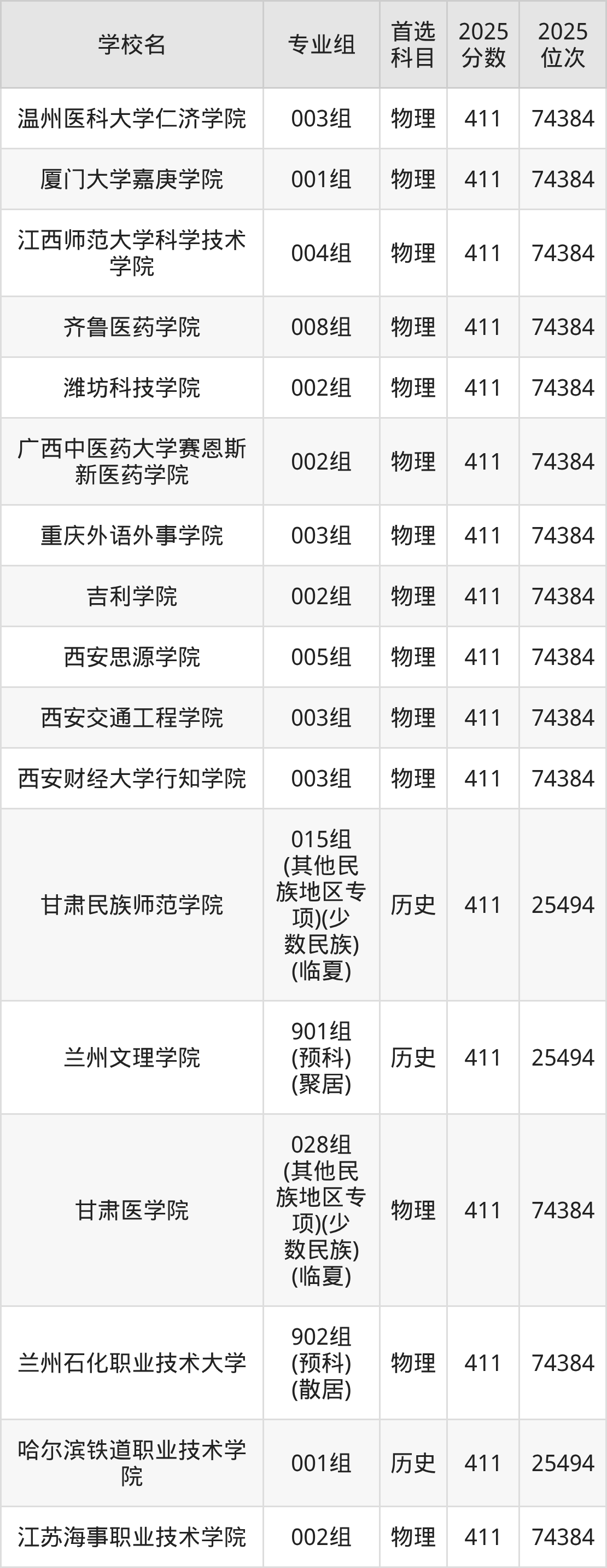 2025年在甘肃高考历史类录取分数线是412分的大学有北京工业大学耿丹学院、天津仁爱学院、保定学院、鞍山师范学院、辽宁对外经贸学院、黑龙江财经学院、黑龙江工程学院昆仑旅游学院、上海杉达学院、上海建桥学院、南通理工学院等。物理类录取分数线是412分的大学有天津科技大学、山西应用科技学院、大连财经学院、南京工业大学浦江学院、宁波大学科学技术学院、集美大学诚毅学院、青岛城市学院、郑州商学院、武汉文理学院、武汉纺织大学外经贸学院等。