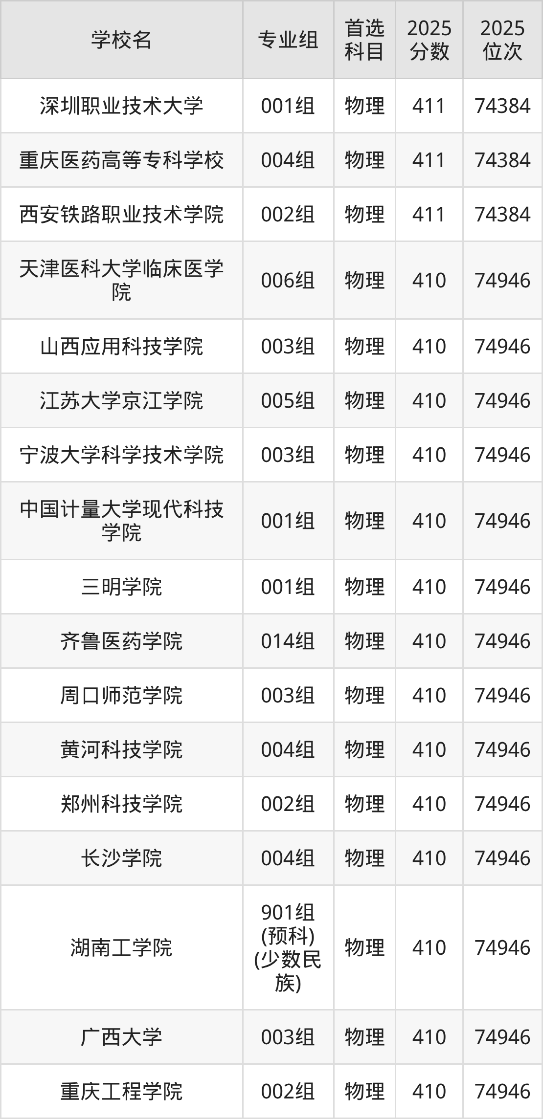 物理类412分可以冲的大学:渤海大学414分、沈阳城市学院414分、温州医科大学仁济学院414分、山东建筑大学414分等;较稳妥的大学:天津医科大学临床医学院411分、晋中信息学院411分、山西晋中理工学院411分、吉林师范大学博达学院411分等。