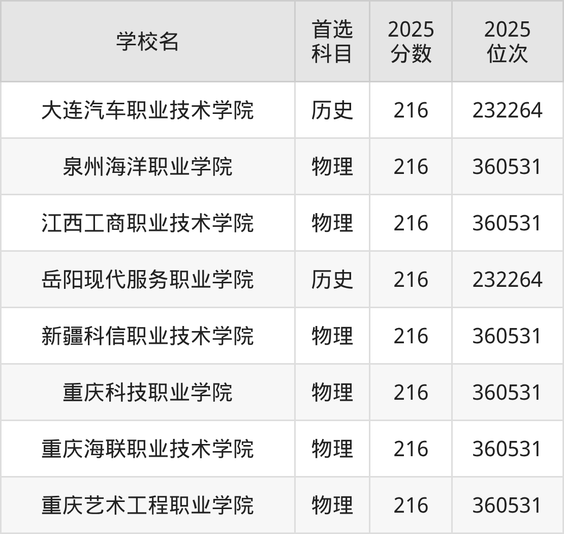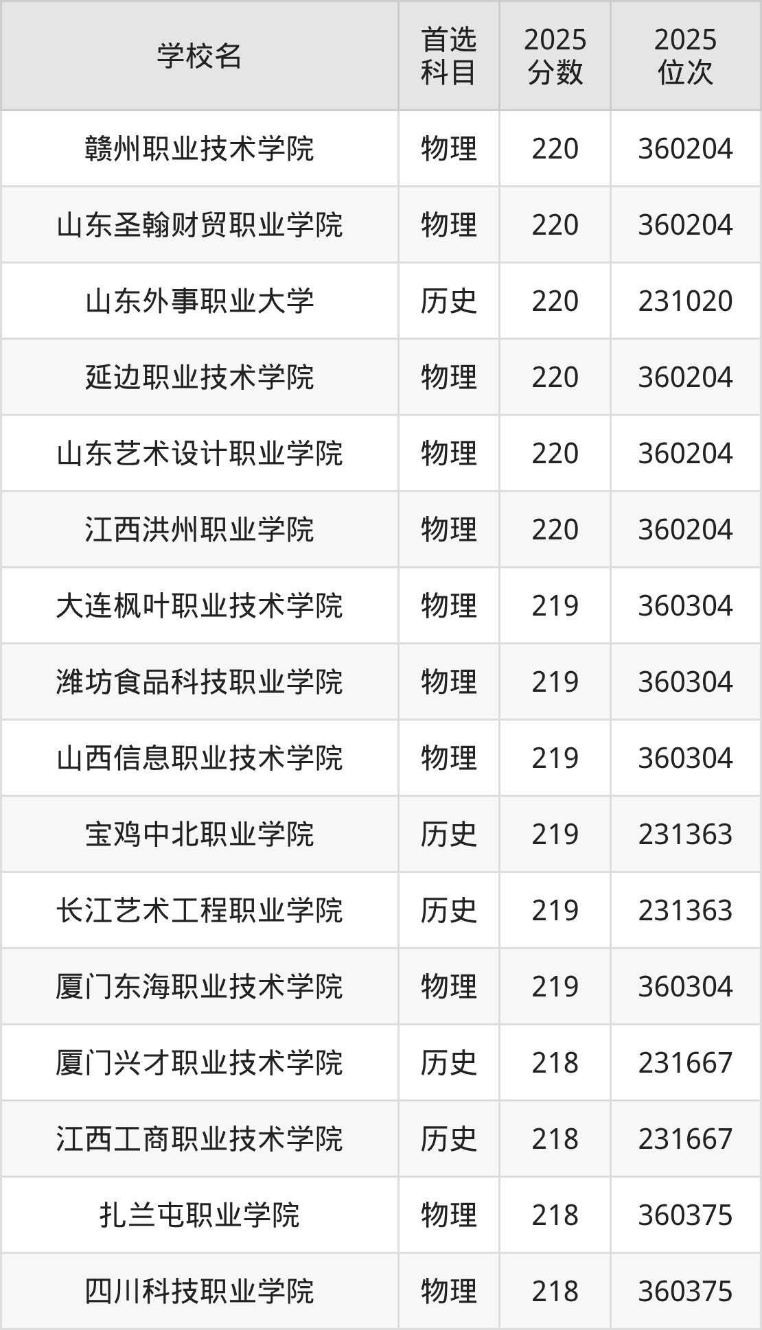 2025年在河北高考历史类录取分数线是218分的大学有厦门兴才职业技术学院、江西工商职业技术学院。物理类录取分数线是218分的大学有扎兰屯职业学院、四川科技职业学院、海南工商职业学院、海南科技职业大学、长江艺术工程职业学院、成都文理学院、山东力明科技职业学院、江西枫林涉外经贸职业学院。