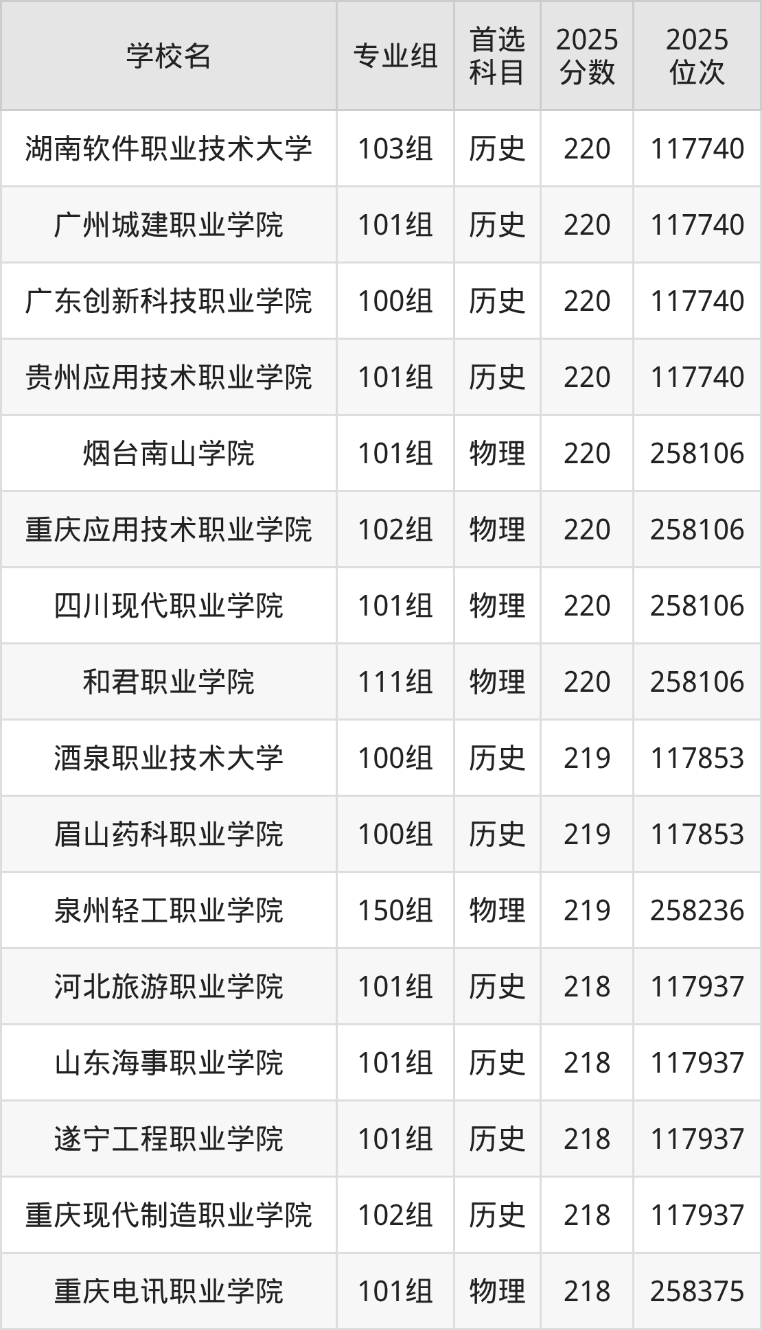 2025年在广西高考历史类录取分数线是218分的大学有河北旅游职业学院、山东海事职业学院、遂宁工程职业学院、重庆现代制造职业学院。物理类录取分数线是218分的大学有重庆电讯职业学院、江西工商职业技术学院。