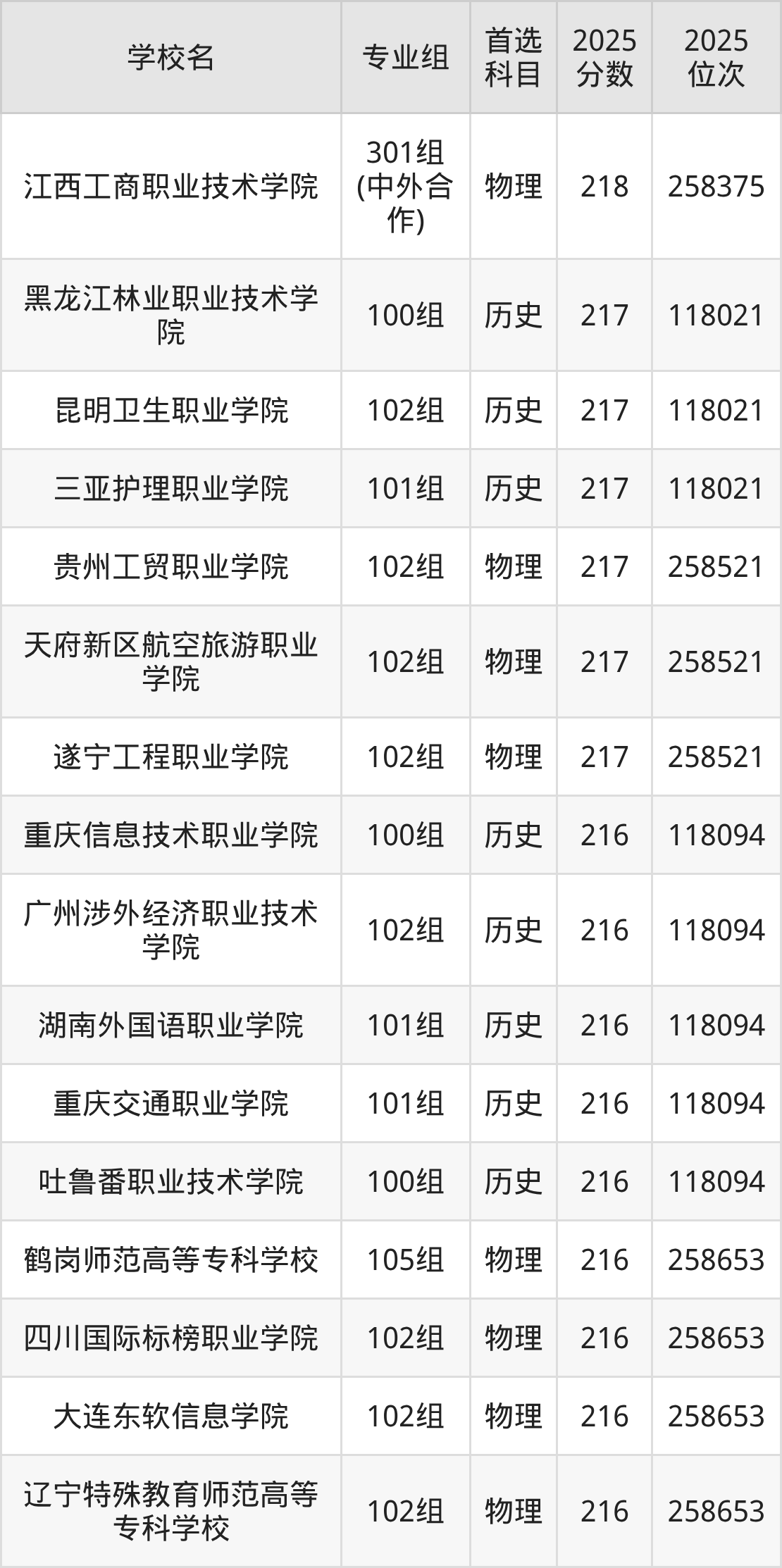 下面老师将以上文整理的其中两个省份为例,为大家具体展示218分左右能上的专科大学名单。