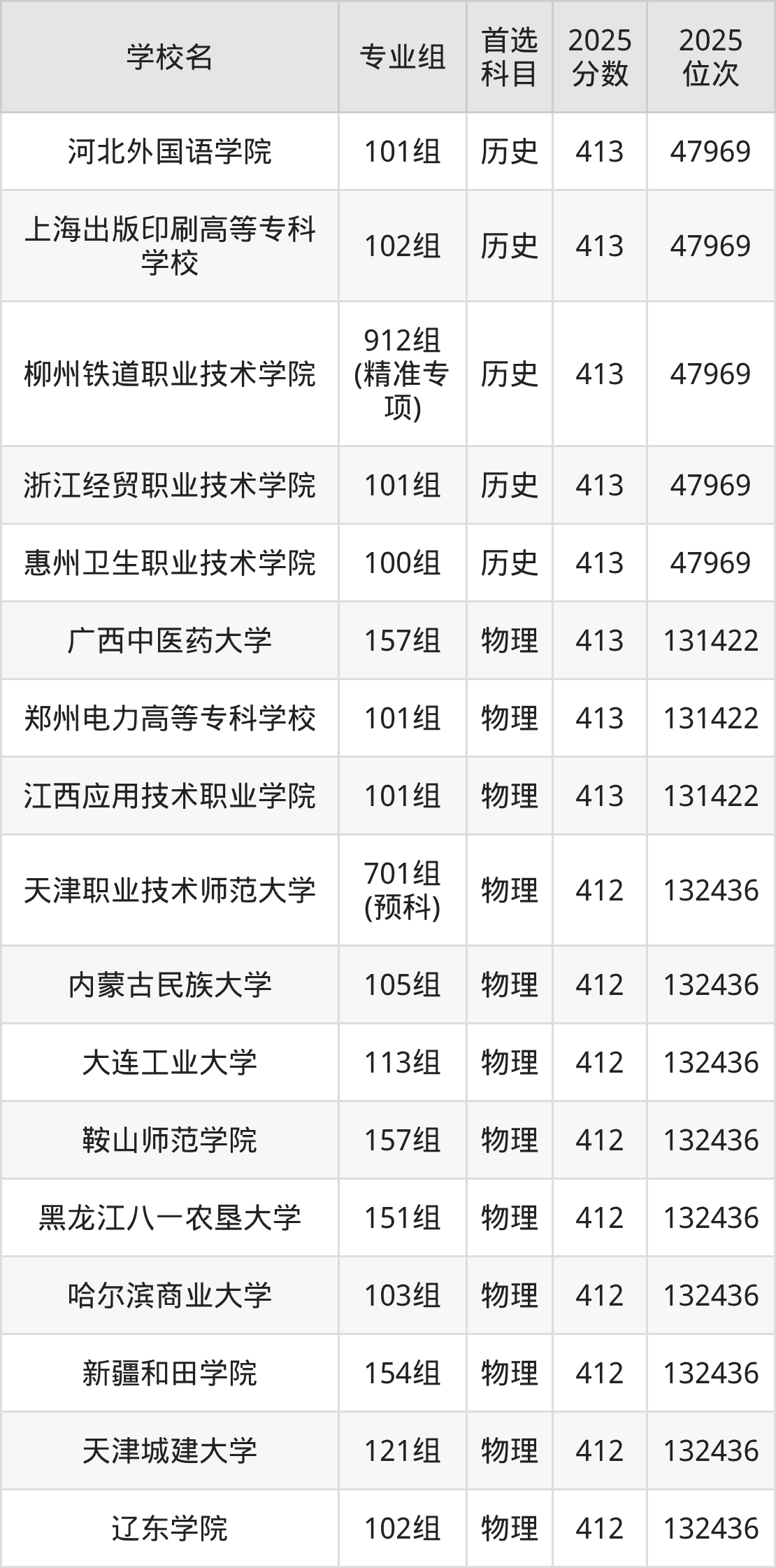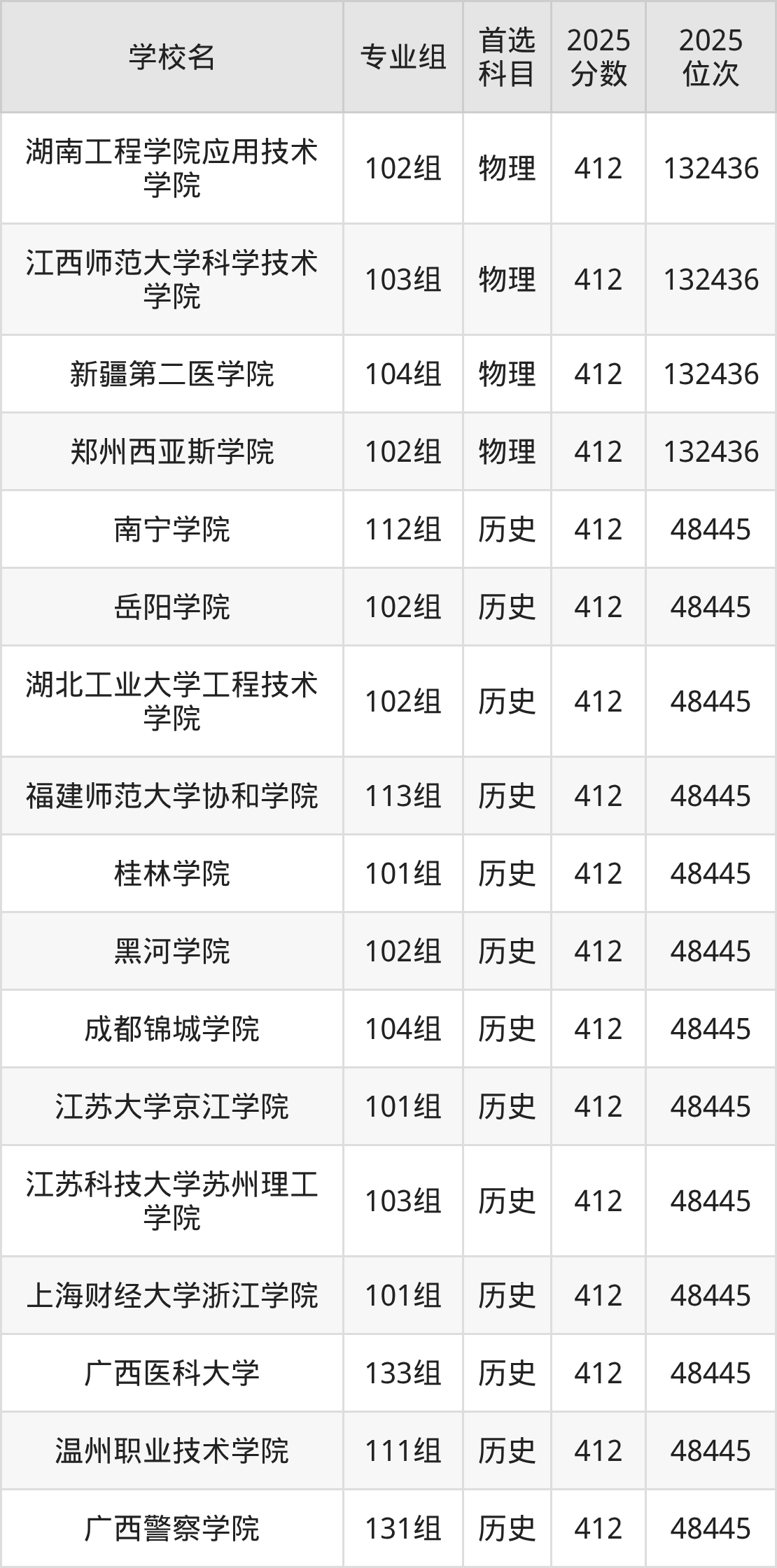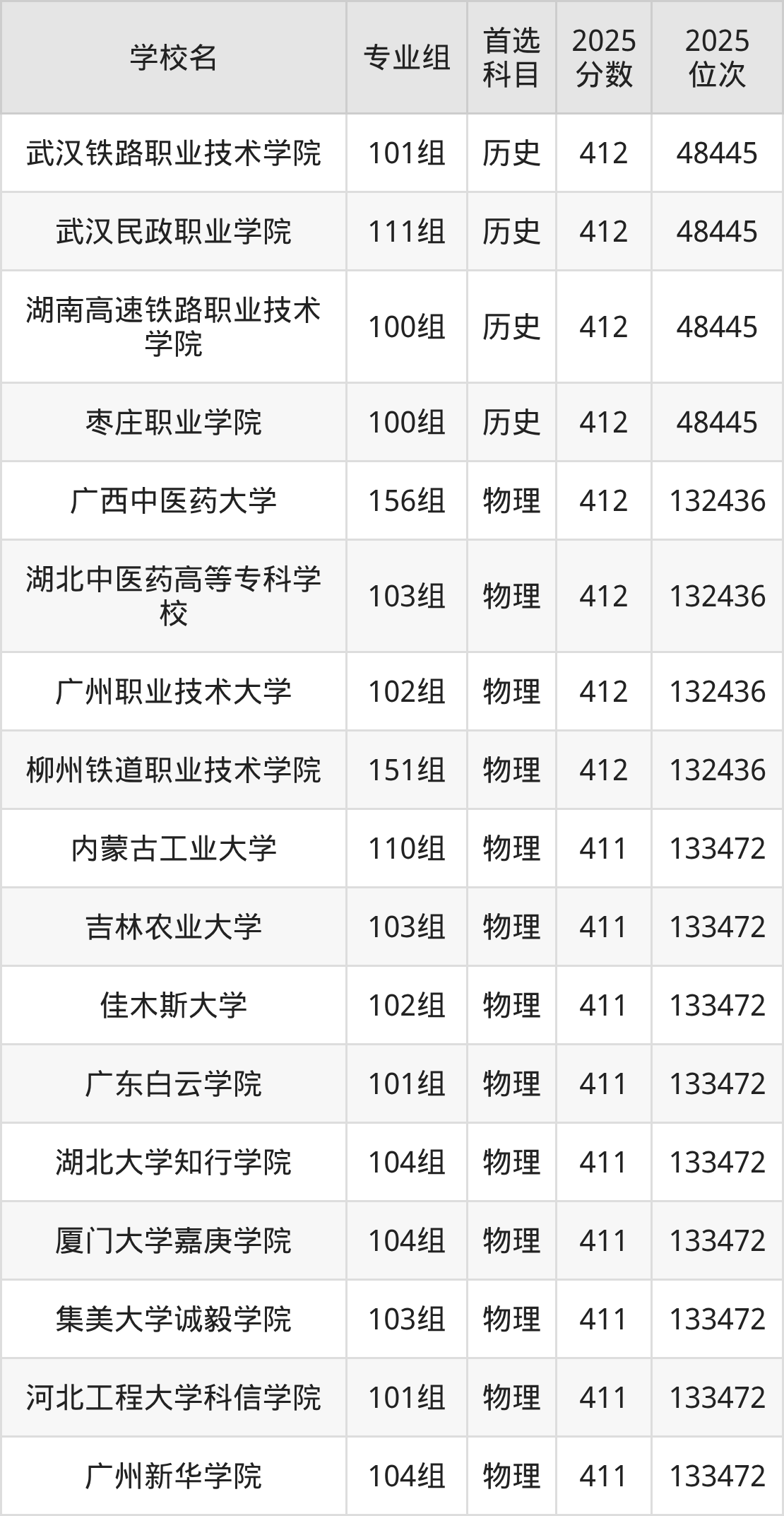 2025年在广西高考物理类录取分数线是411分的大学有内蒙古工业大学、吉林农业大学、佳木斯大学、广东白云学院、湖北大学知行学院、厦门大学嘉庚学院、集美大学诚毅学院、河北工程大学科信学院、广州新华学院、西南财经大学天府学院等。历史类录取分数线是411分的大学有武汉东湖学院、河南推拿职业学院、江西师范高等专科学校。