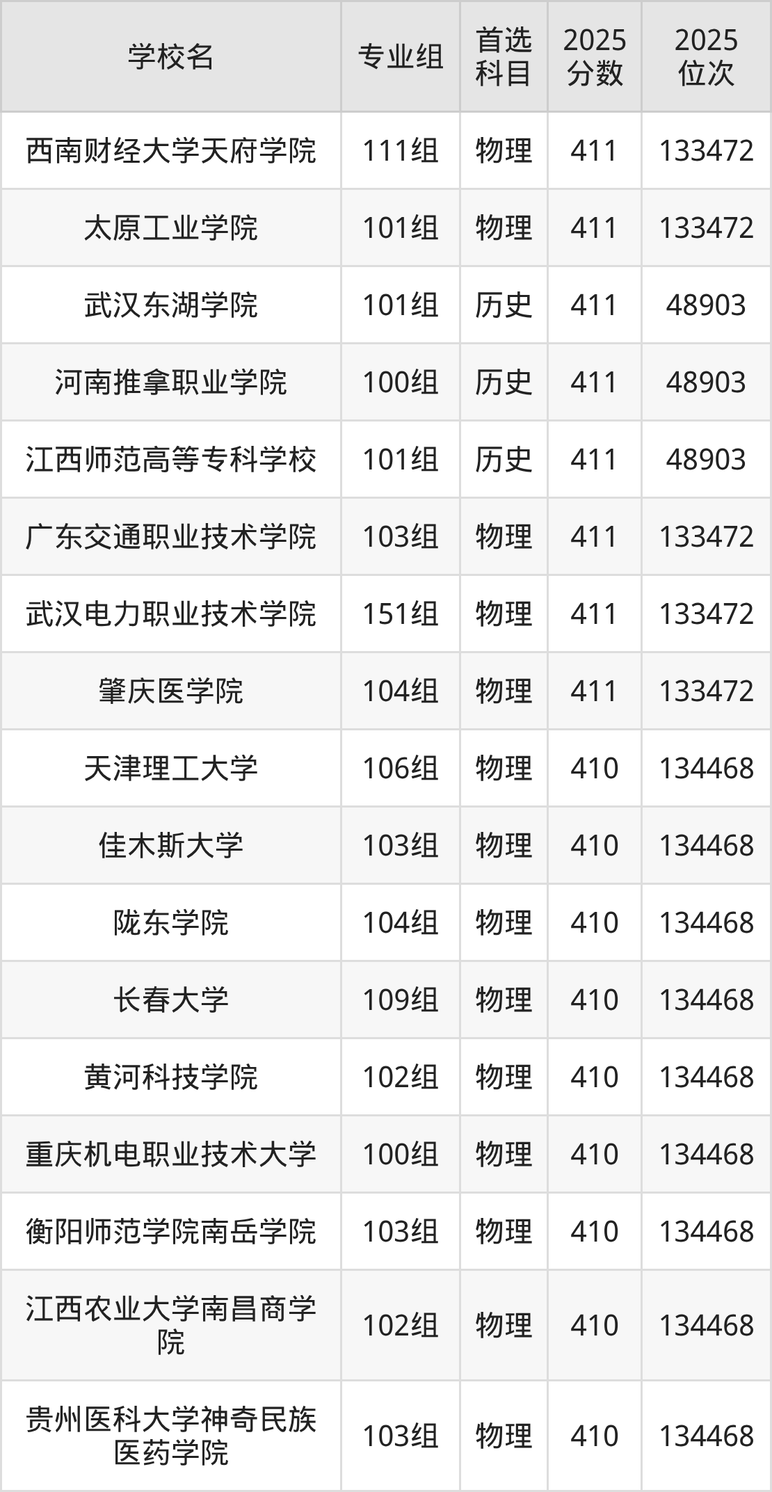 广西高考历史类411分对应的位次排名是48903名,物理类411分对应的位次排名是133472名,因此建议2026年位次排在这附近的同学考虑这些大学。