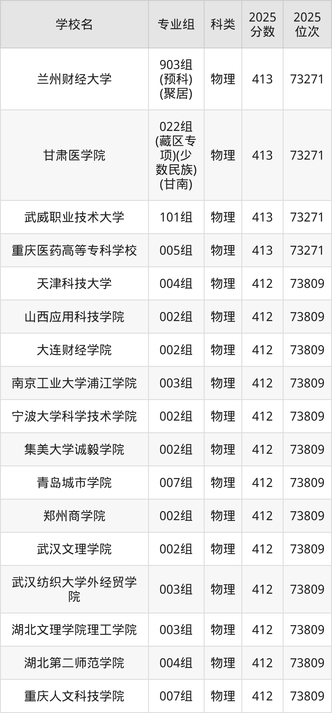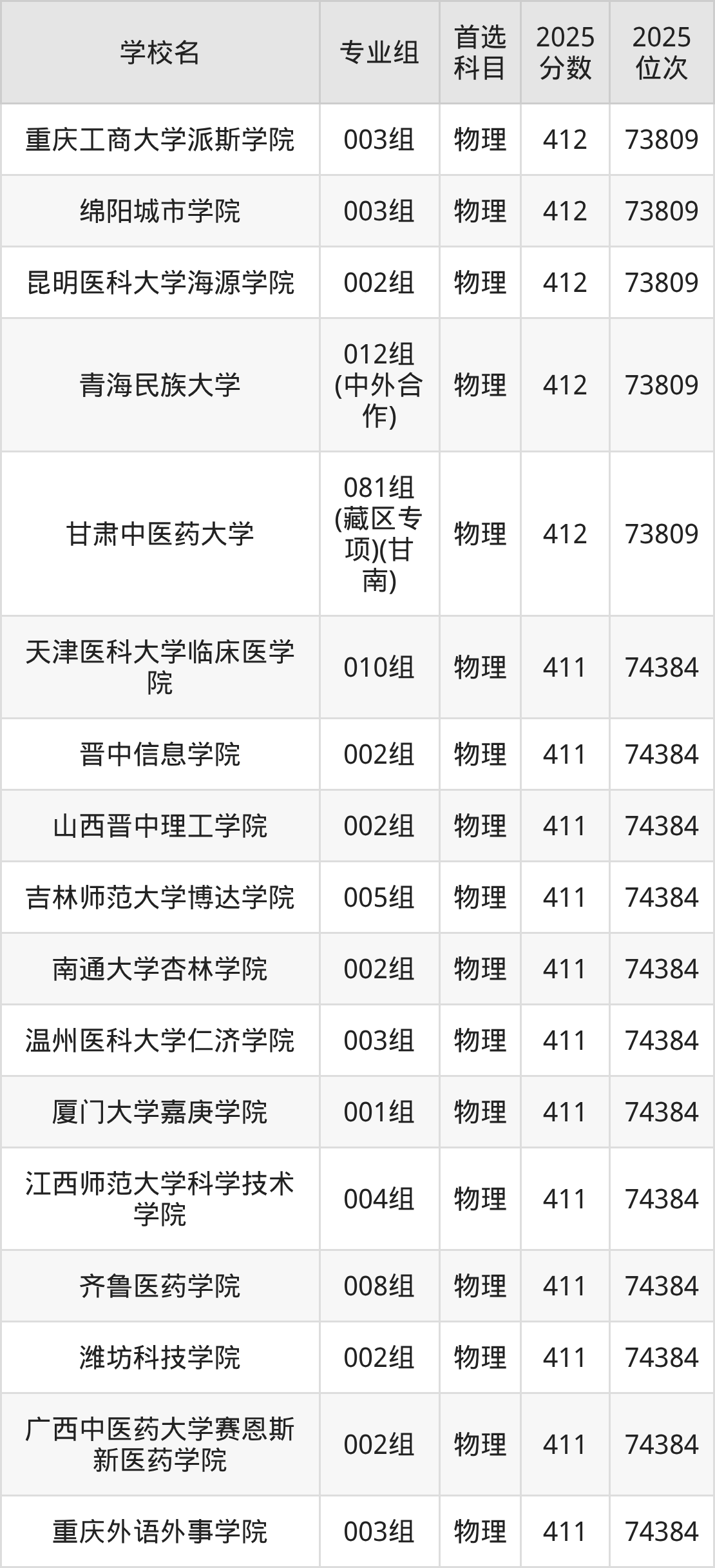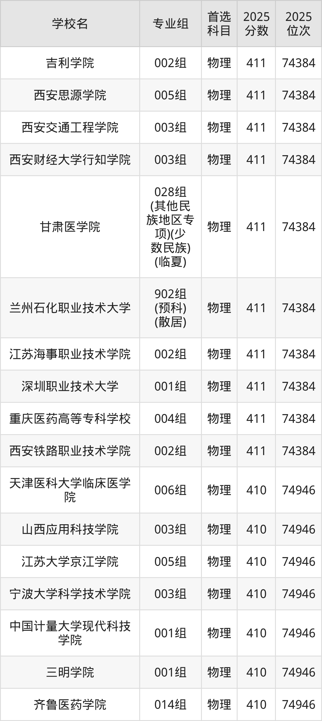 甘肃物理类411分对应的位次排名是74384名,因此建议2026年位次排在这附近的考生考虑这些大学。