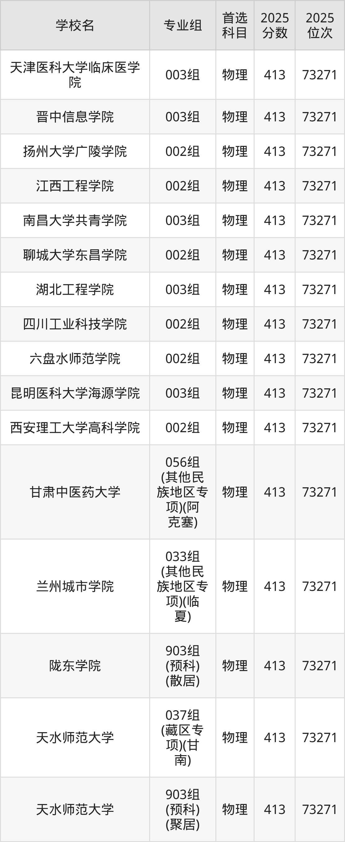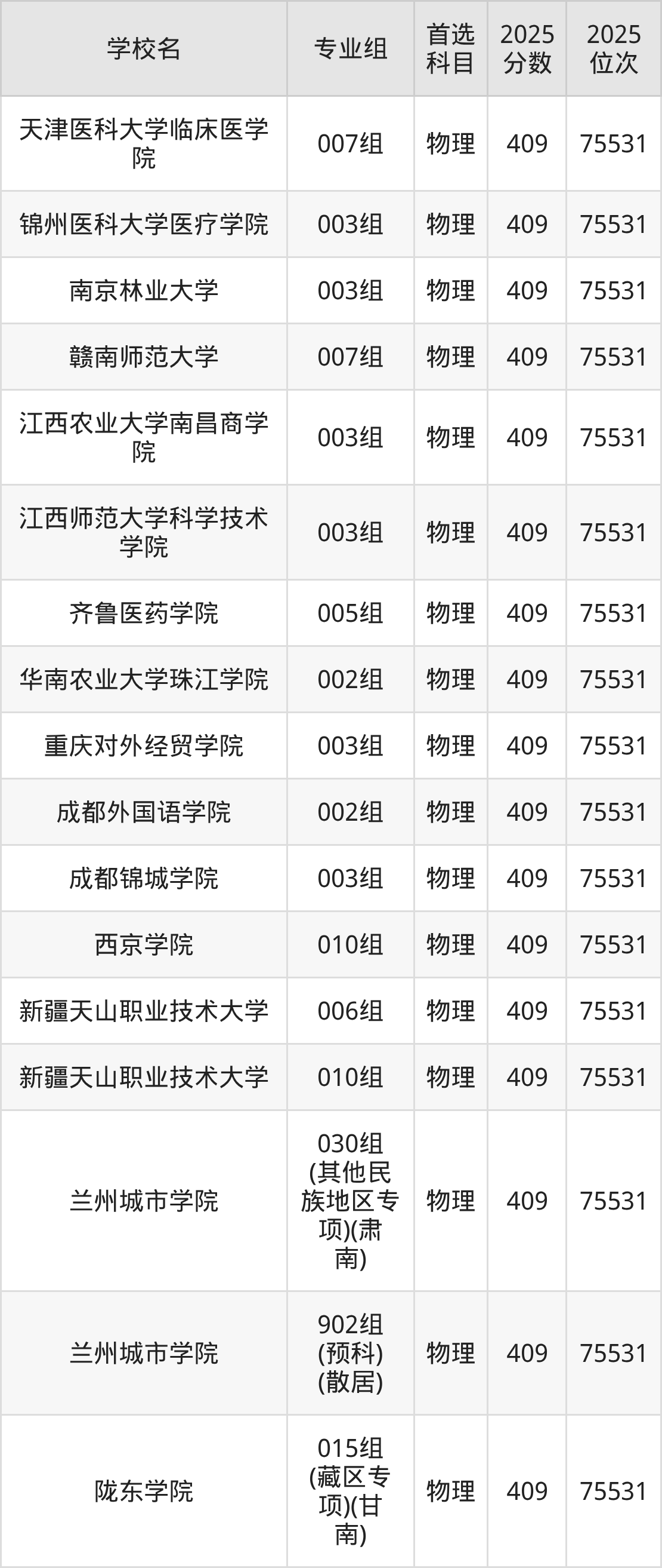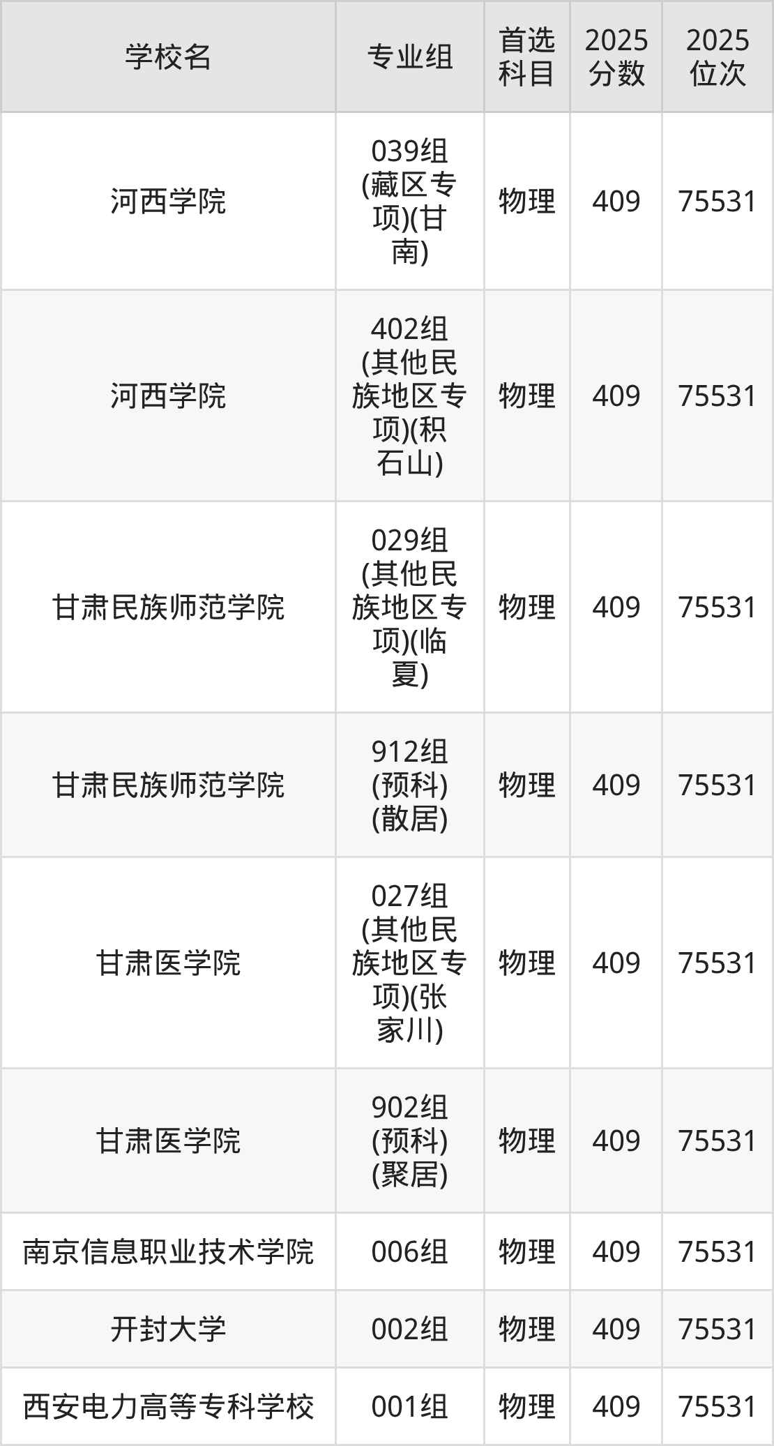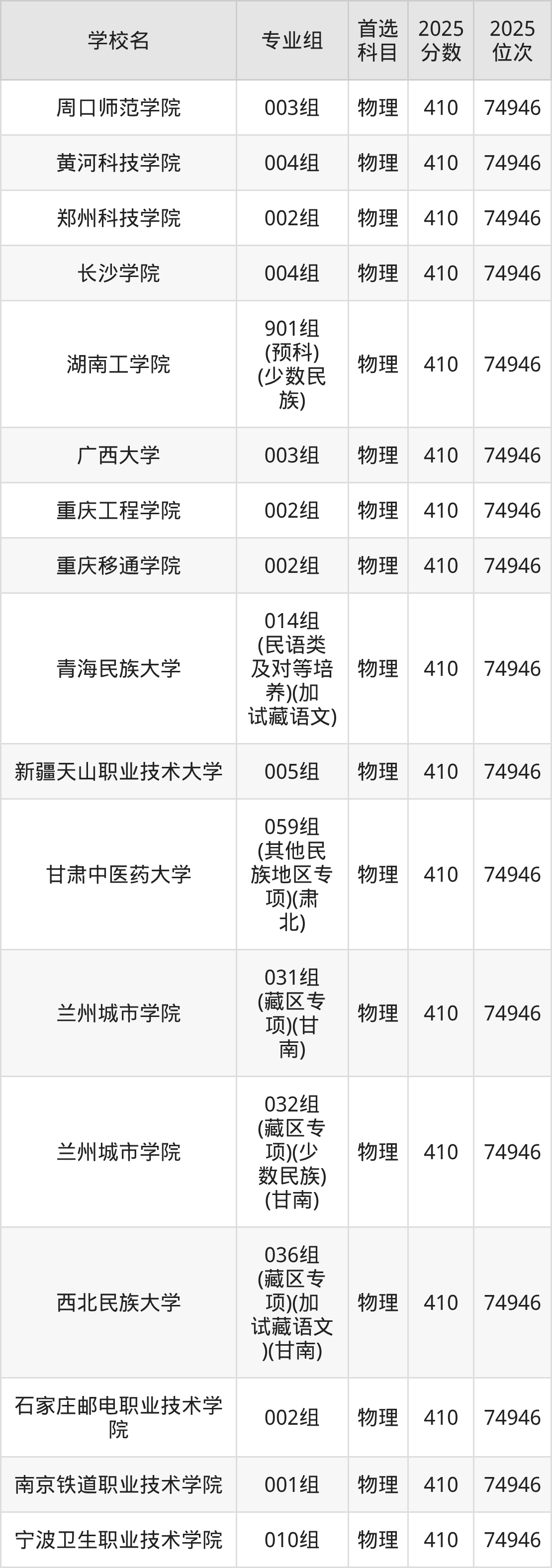 甘肃物理类411分对应的位次排名是74384名,因此建议2026年位次排在这附近的考生考虑这些大学。