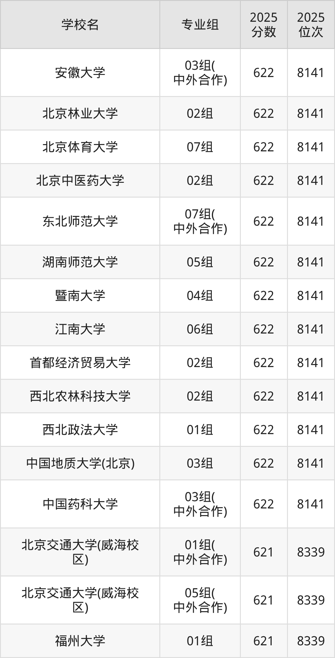 620分可以冲一冲的大学:安徽大学622分、北京林业大学622分、北京体育大学622分、北京中医药大学622分等;