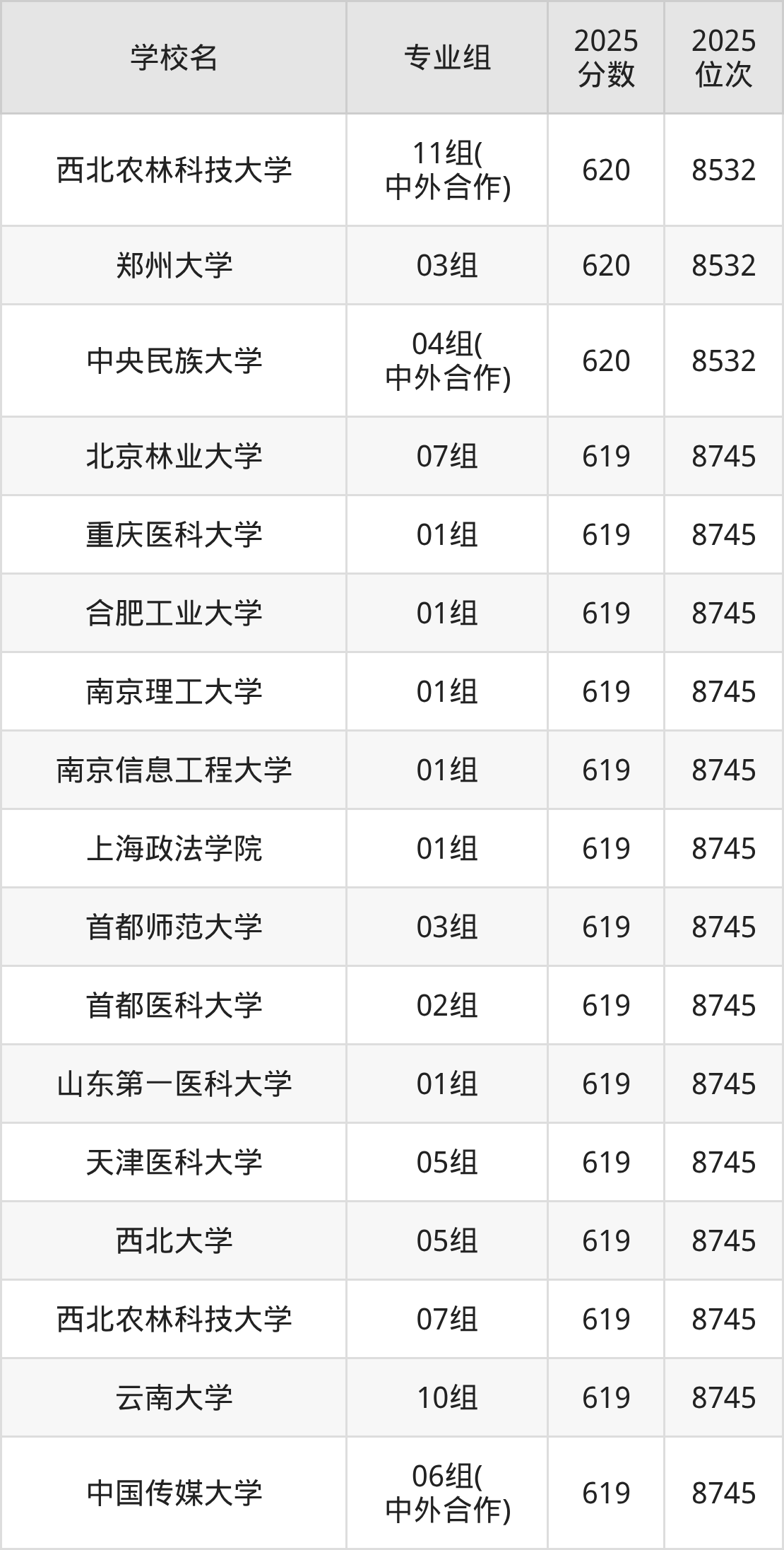 620分较稳妥的大学:北京林业大学619分、重庆医科大学619分、合肥工业大学619分、南京理工大学619分等。