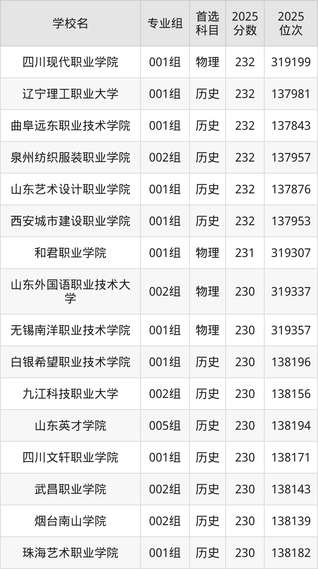 物理类230分可以冲的大学:四川现代职业学院232分、和君职业学院231分;较稳妥的大学:广东岭南职业技术学院229分、江海职业技术学院229分、泉州轻工职业学院229分、长江艺术工程职业学院228分等。
