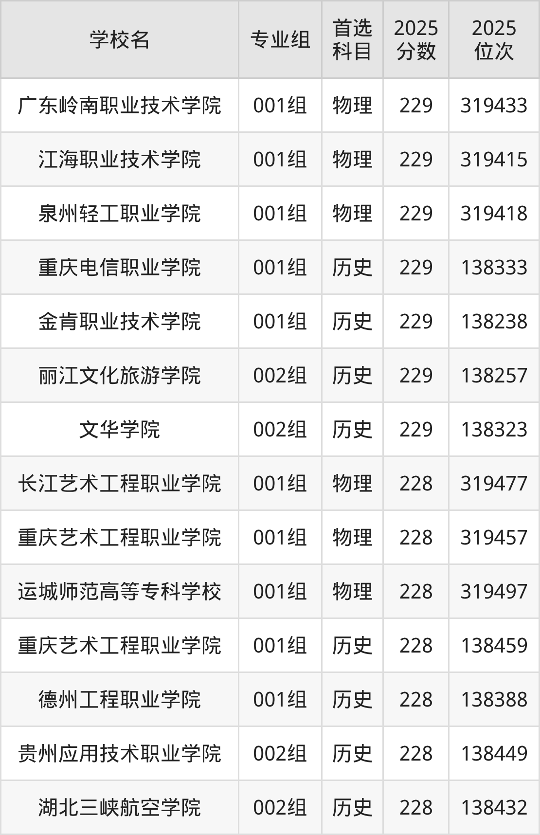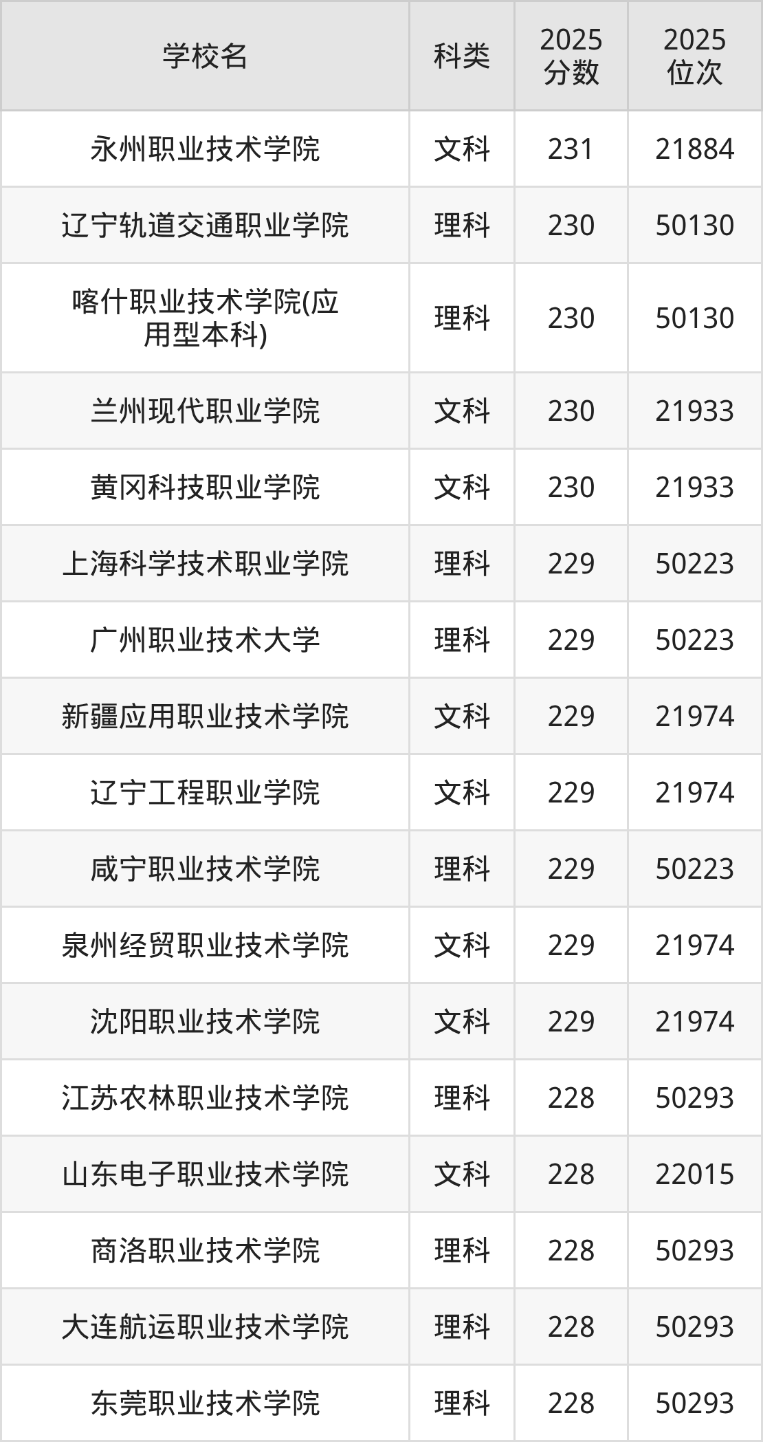 下面老师将以上文整理的其中两个省份为例,为大家具体展示230分左右能上的专科大学名单。