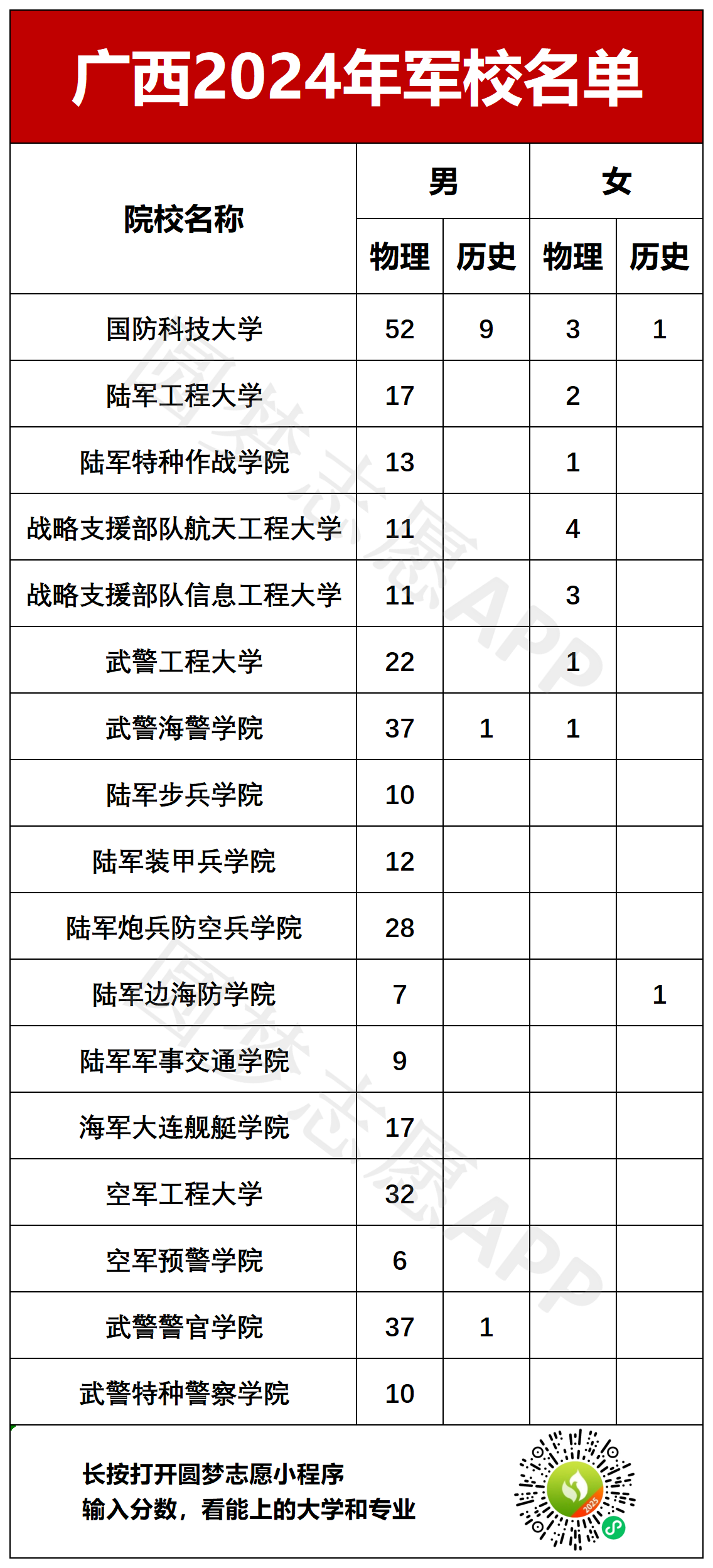 2024年共有17所军校在广西本科提前批招生、3所军校在广西普通批招生,名单如下: