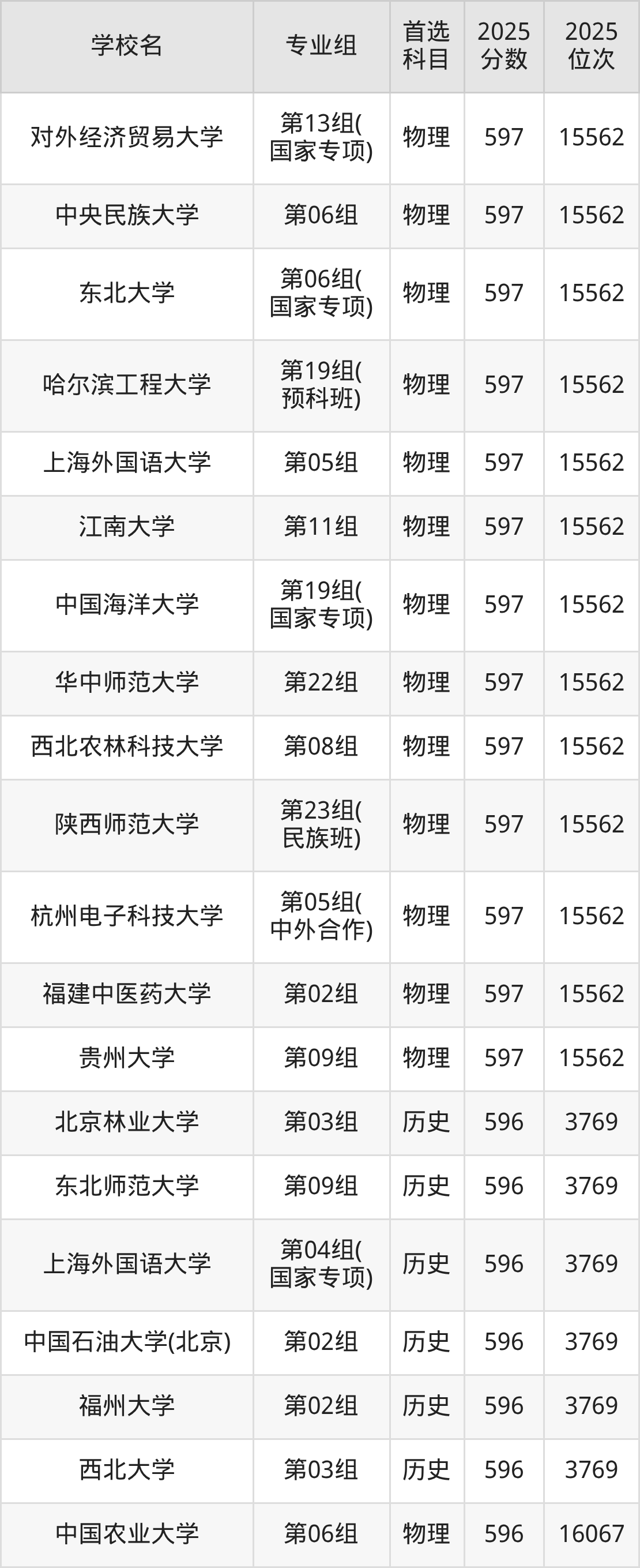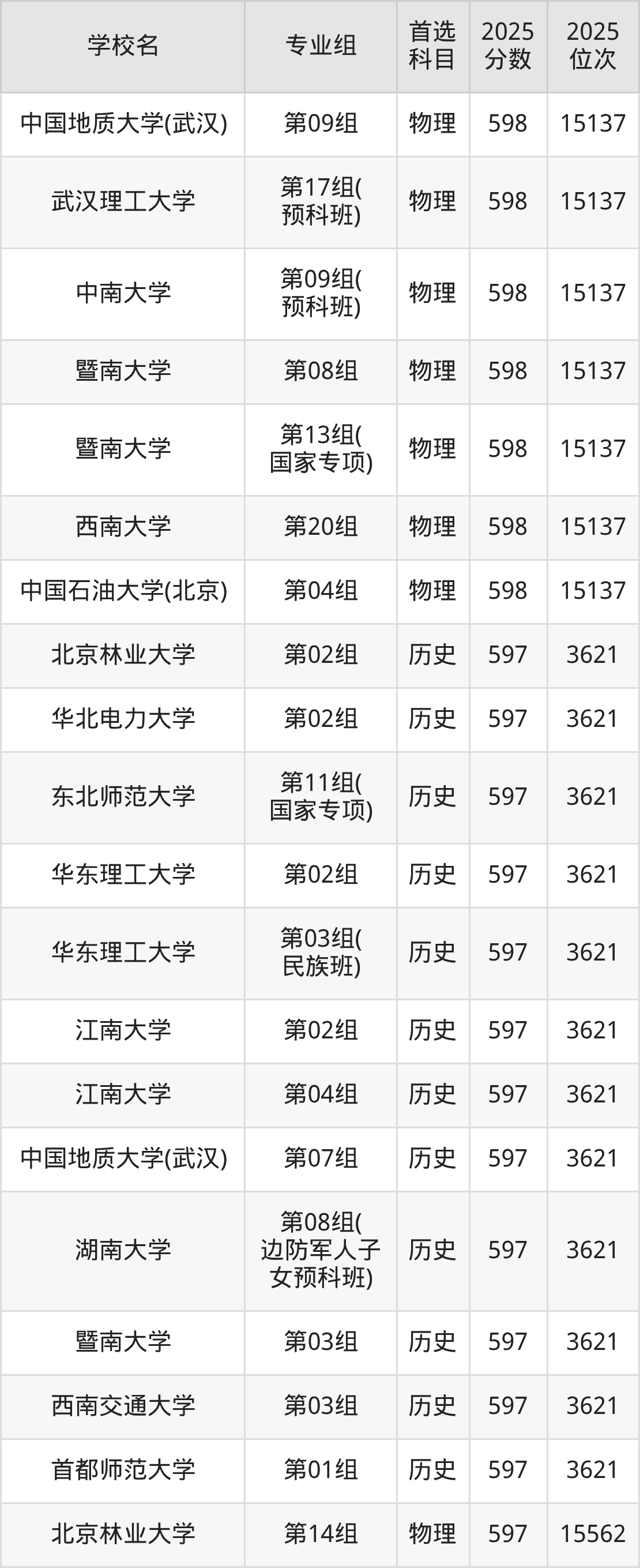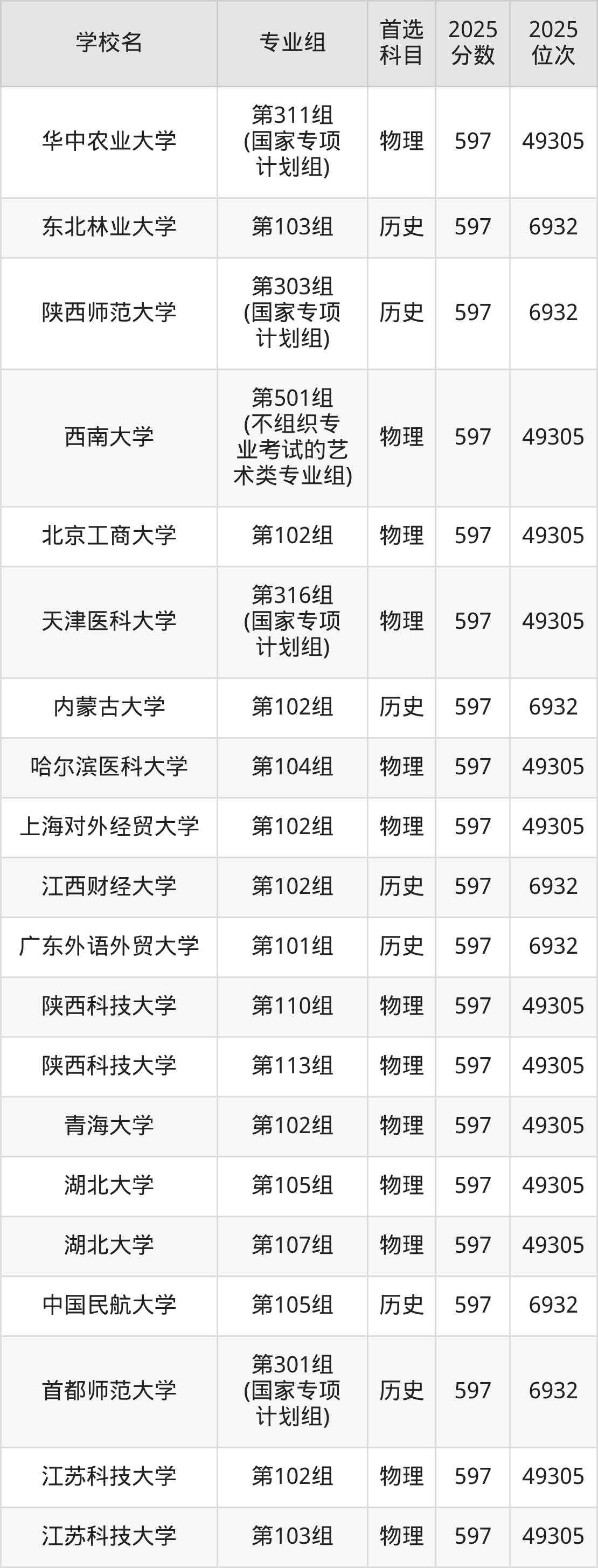 2025年在湖北高考历史类录取分数线是597分的大学有北京林业大学、华北电力大学、东北师范大学、华东理工大学、江南大学、中国地质大学(武汉)、湖南大学、暨南大学、西南交通大学、首都师范大学。物理类录取分数线是597分的大学有北京林业大学、对外经济贸易大学、中央民族大学、东北大学、哈尔滨工程大学、上海外国语大学、江南大学、中国海洋大学、华中师范大学、西北农林科技大学等。