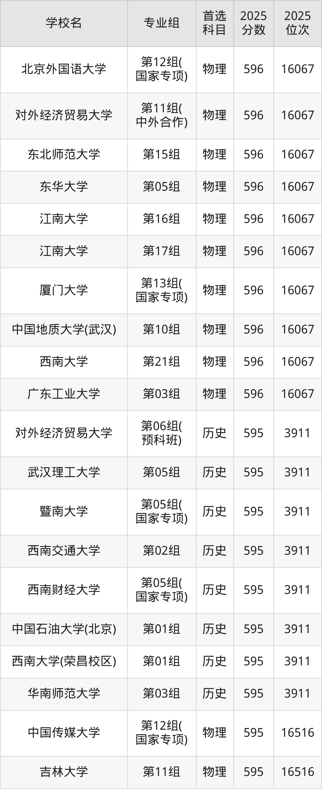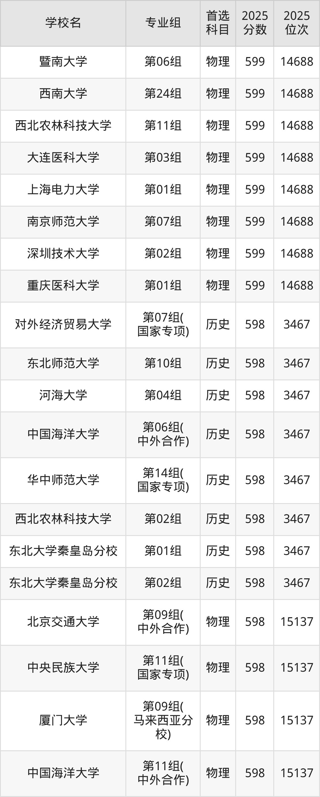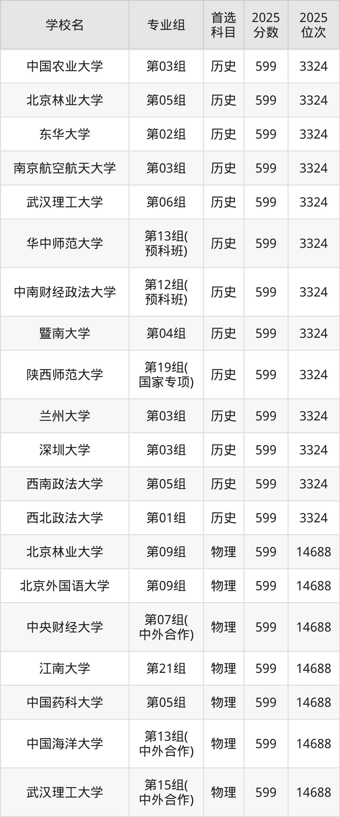 2025年在湖北高考历史类录取分数线是597分的大学有北京林业大学、华北电力大学、东北师范大学、华东理工大学、江南大学、中国地质大学(武汉)、湖南大学、暨南大学、西南交通大学、首都师范大学。物理类录取分数线是597分的大学有北京林业大学、对外经济贸易大学、中央民族大学、东北大学、哈尔滨工程大学、上海外国语大学、江南大学、中国海洋大学、华中师范大学、西北农林科技大学等。