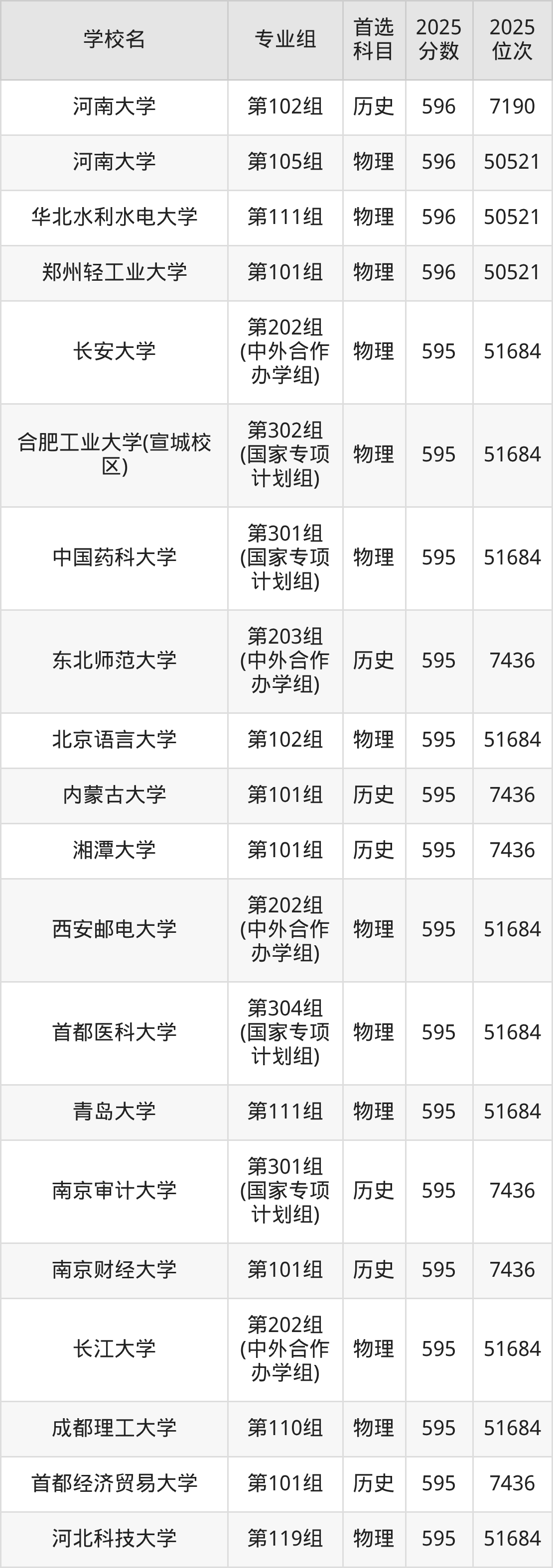 2025年在河南高考历史类录取分数线是597分的大学有东北林业大学、陕西师范大学、内蒙古大学、江西财经大学、广东外语外贸大学、中国民航大学、首都师范大学、成都理工大学、郑州大学(中外合作)、郑州大学等。物理类录取分数线是597分的大学有陆军工程大学、华东理工大学、西南交通大学、华中农业大学、西南大学、北京工商大学、天津医科大学、哈尔滨医科大学、上海对外经贸大学、陕西科技大学等。