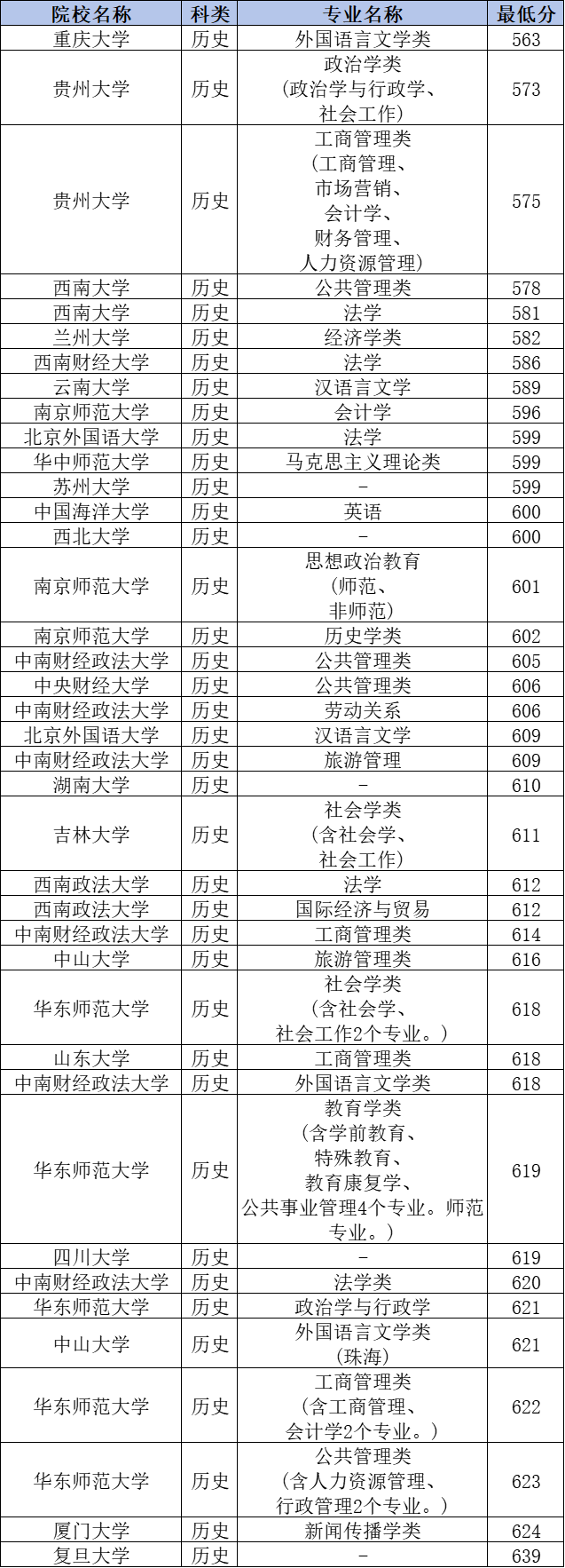 录取分数线最高的是复旦大学,分数线为639分;录取分数线最低的是重庆大学外国语言文学类,分数线为563分。