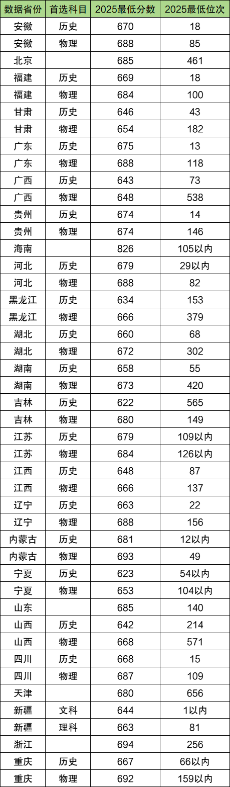 不要只看分数线,每年试卷难度不同,录取分波动会比较大,最可靠的参考2025年录取数据表格中的位次。比如清华大学在北京录取最低分是685分,该分数对应位次是461名,那么2026年省排位461名左右的同学报考清华大学录取概率会较大。