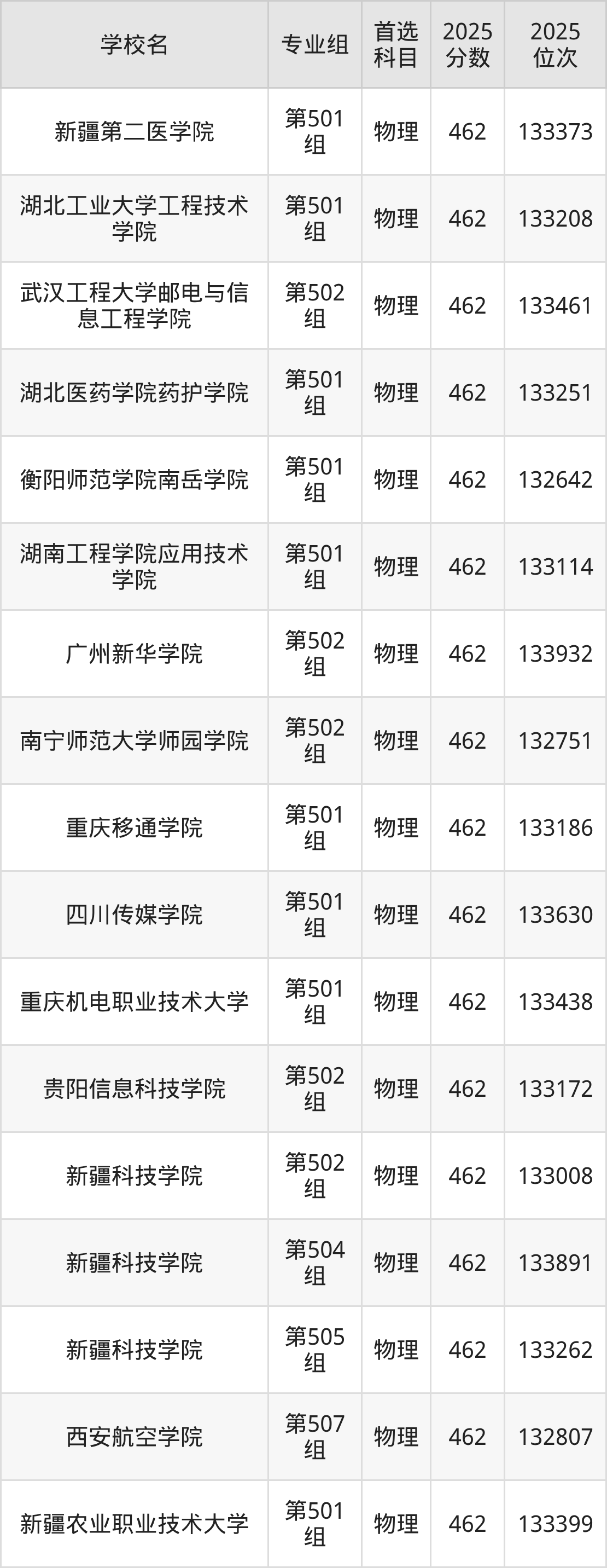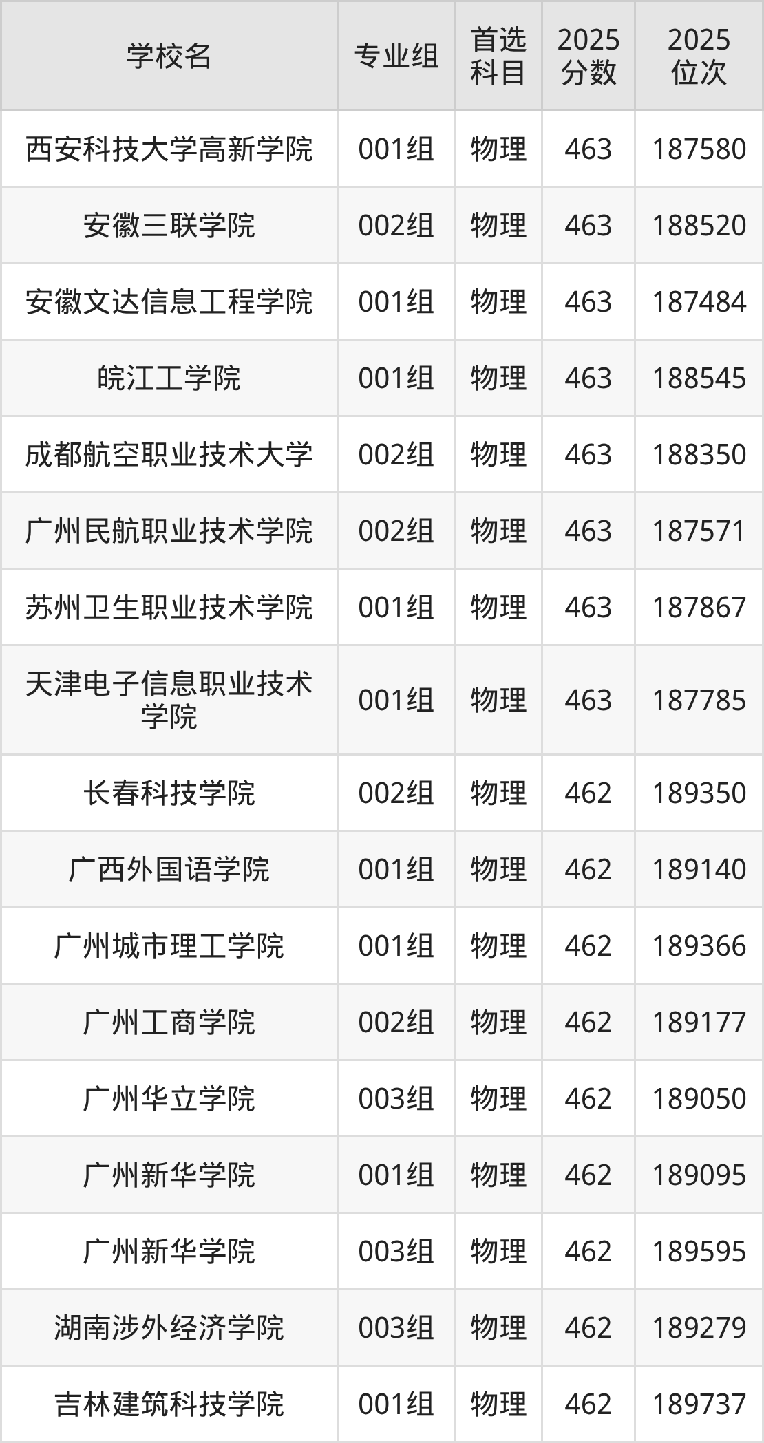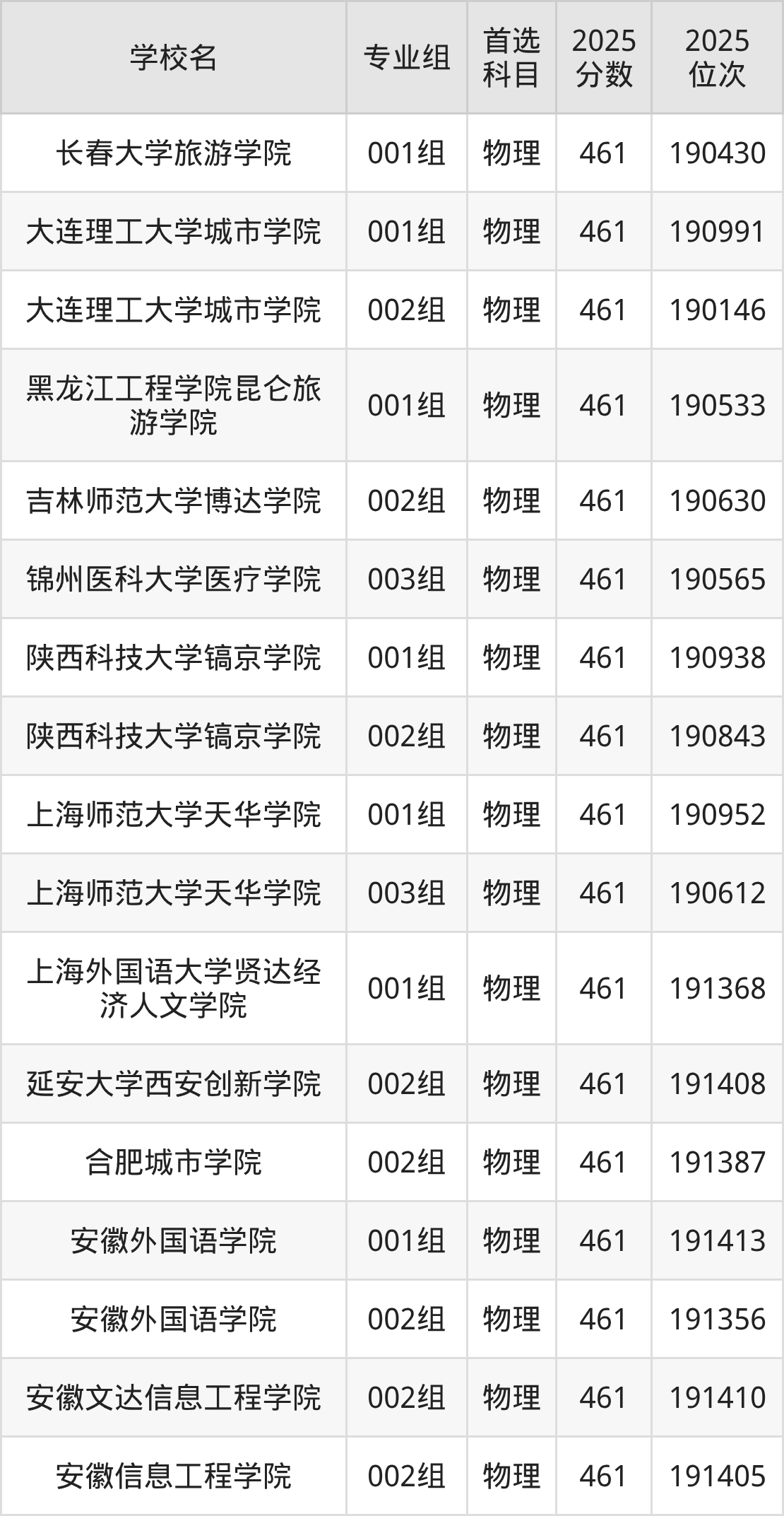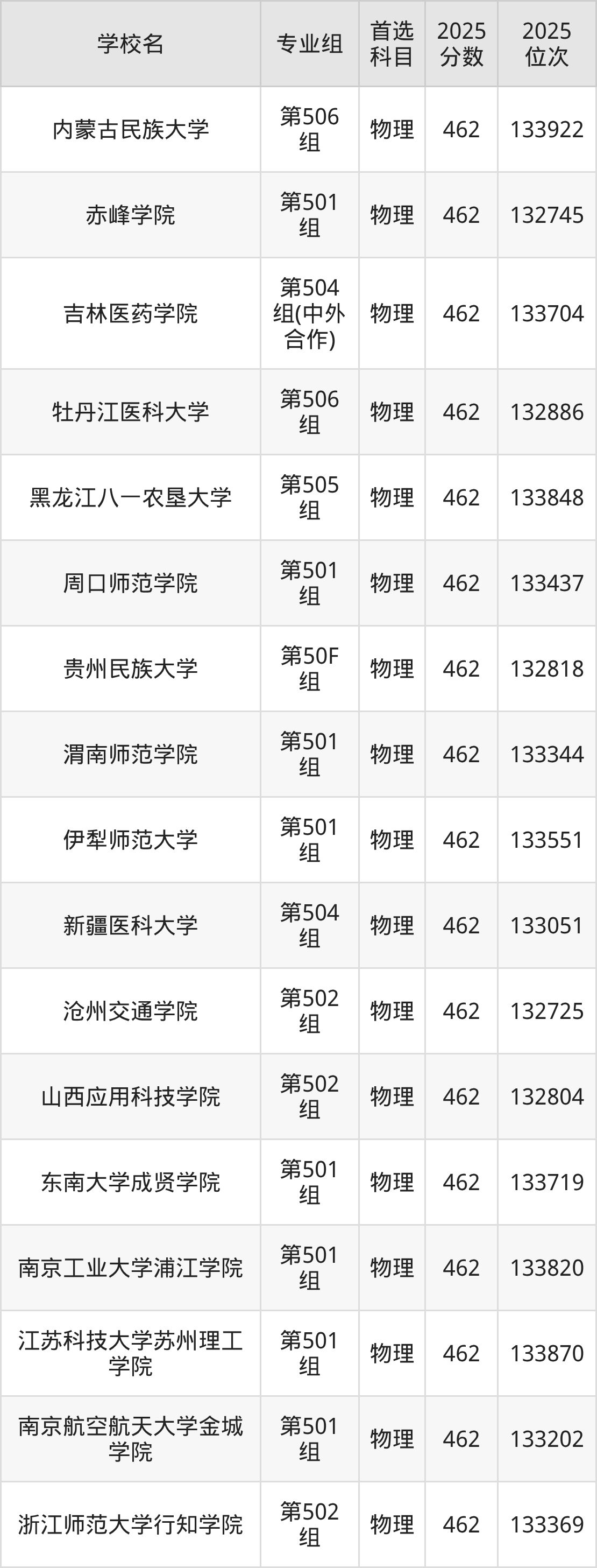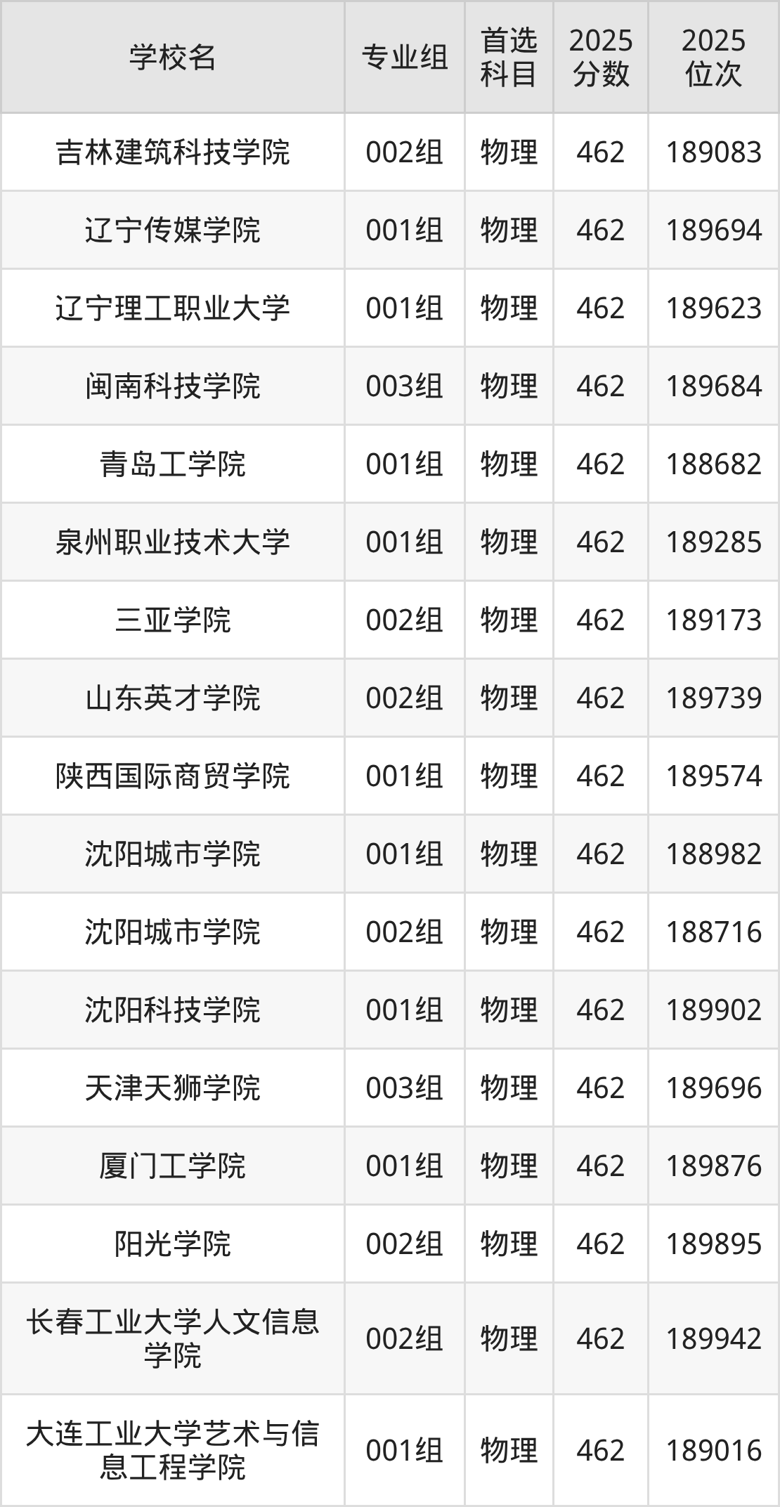 安徽物理类462分对应的位次排名是188682名-189974名,因此建议2026年位次排在这附近的考生考虑这些大学。