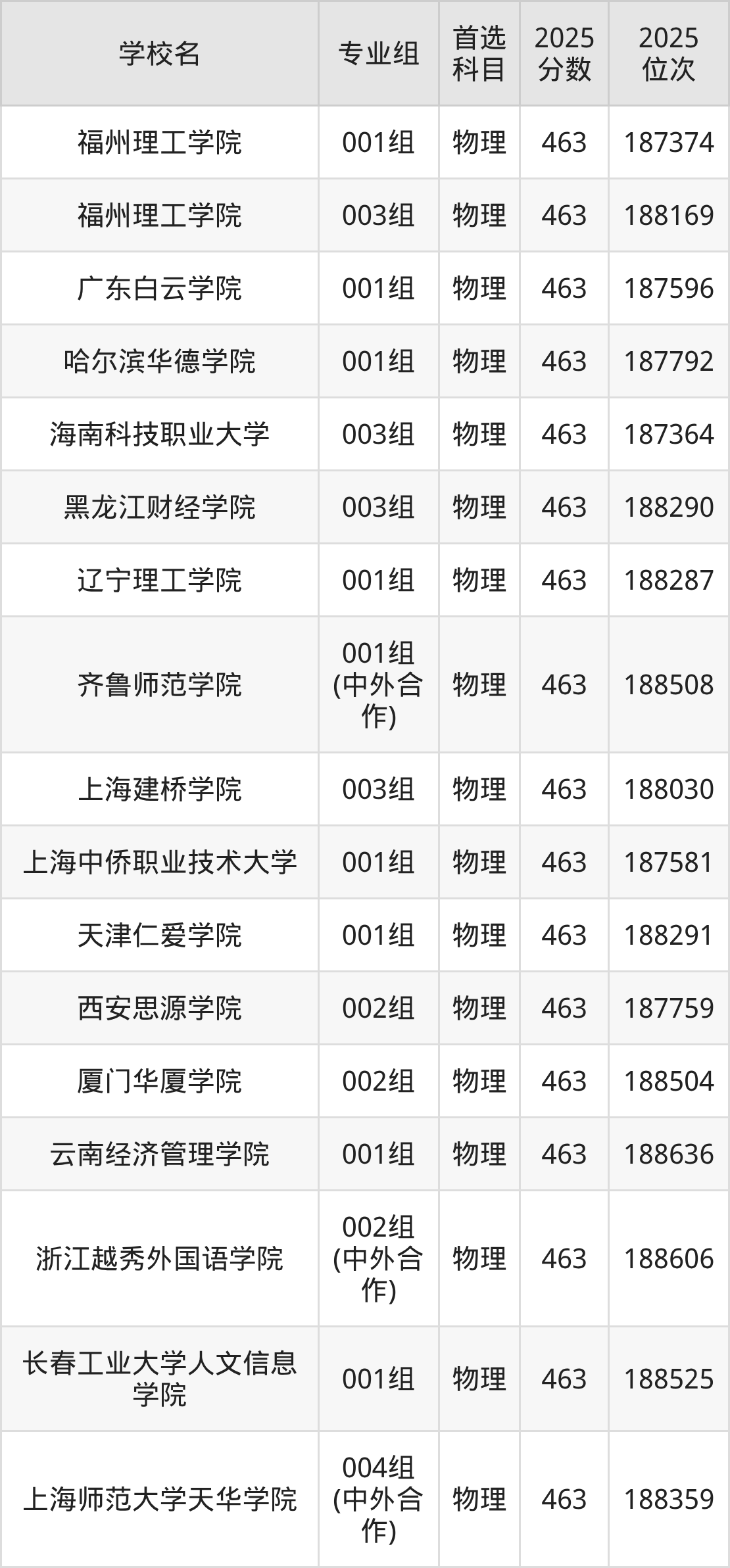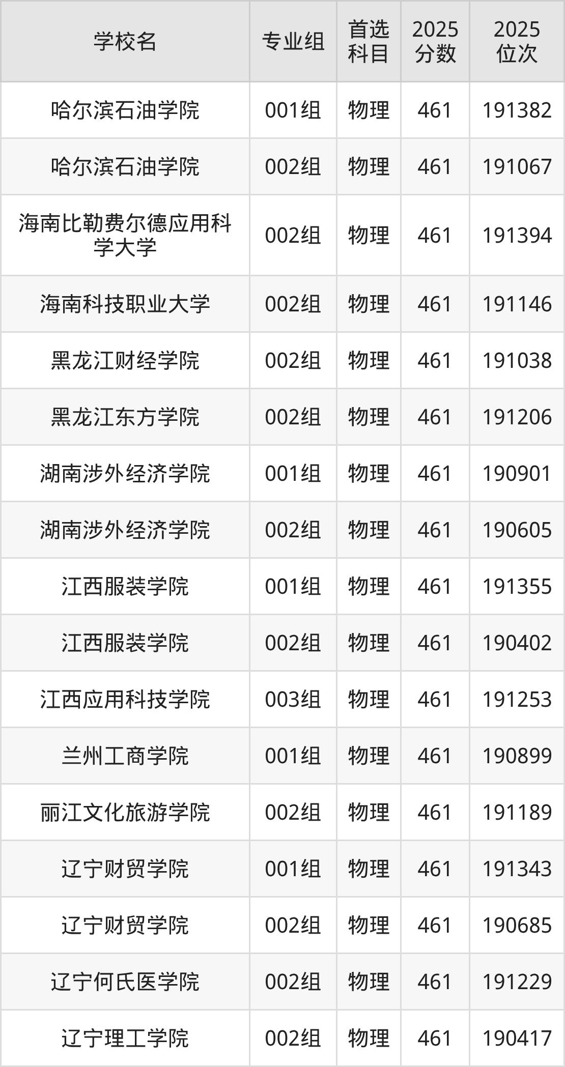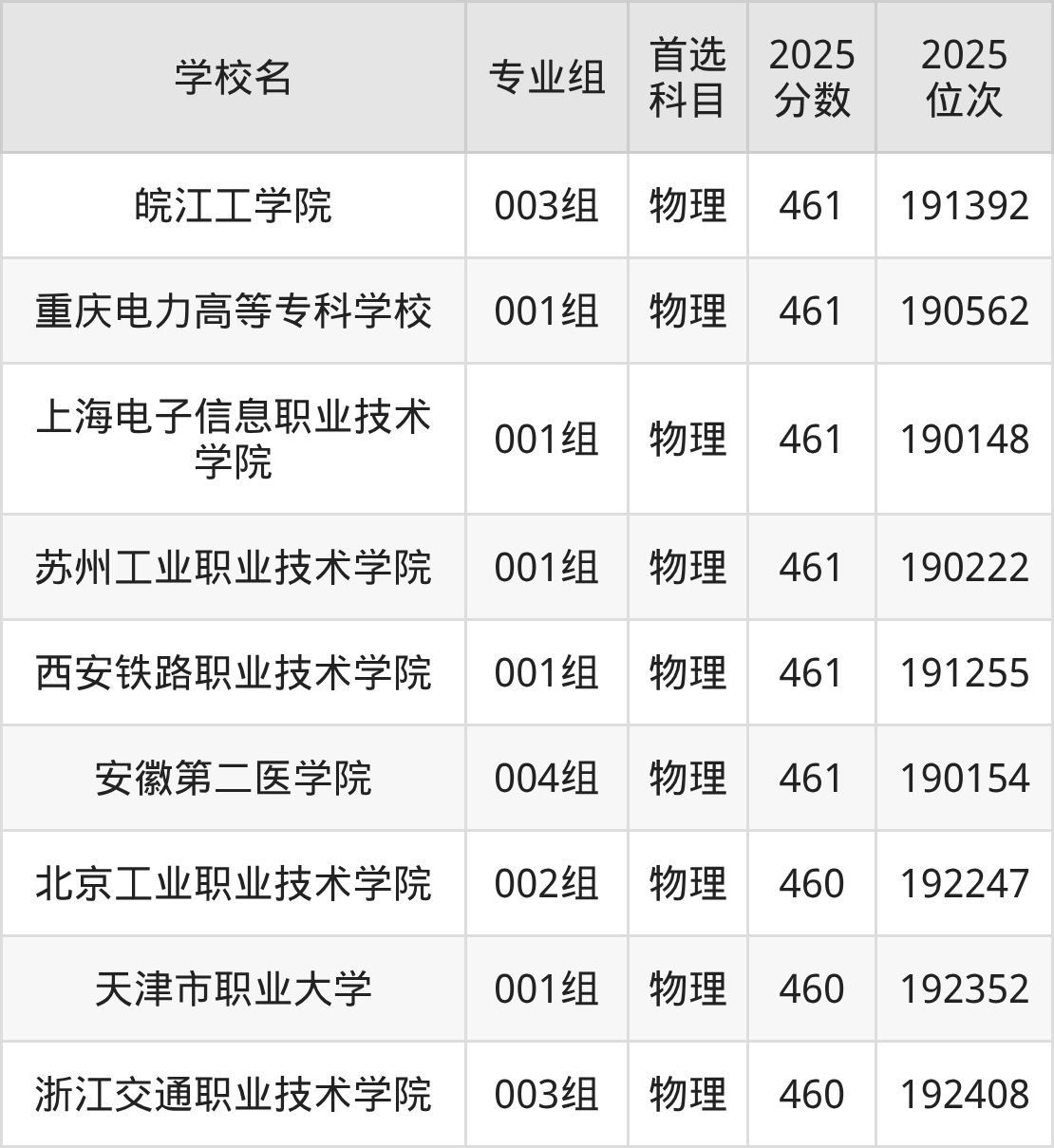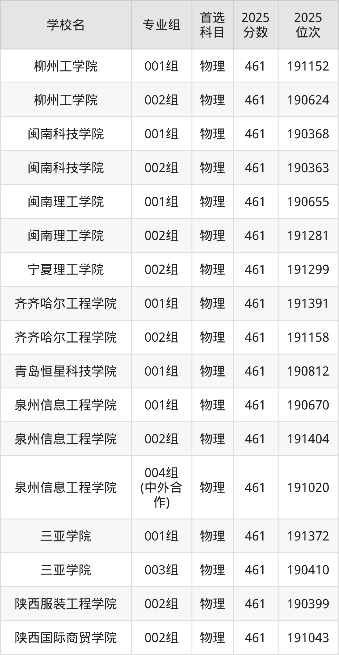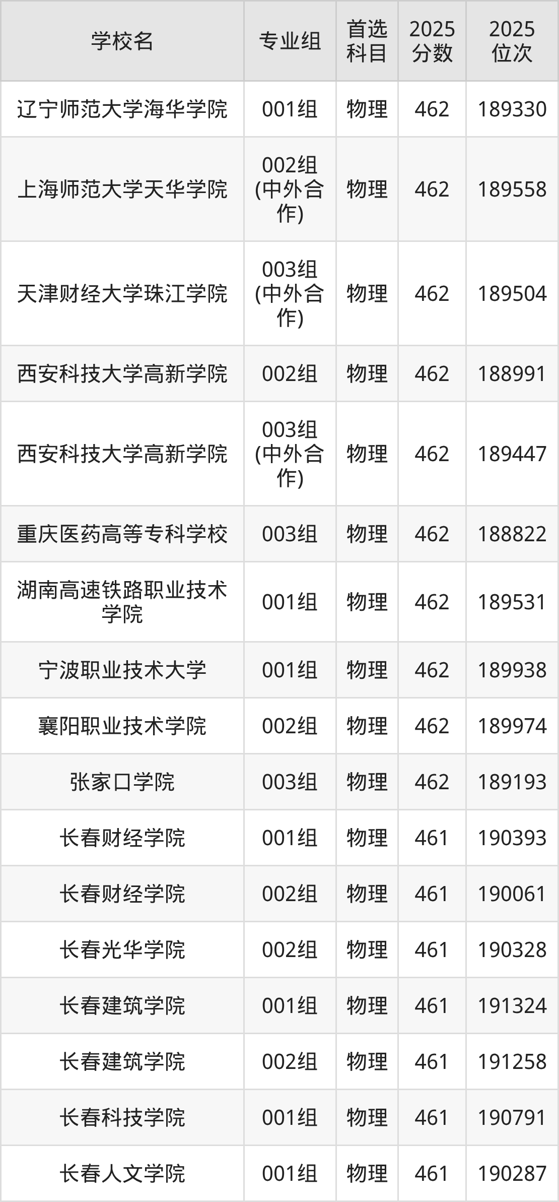 安徽物理类462分对应的位次排名是188682名-189974名,因此建议2026年位次排在这附近的考生考虑这些大学。
