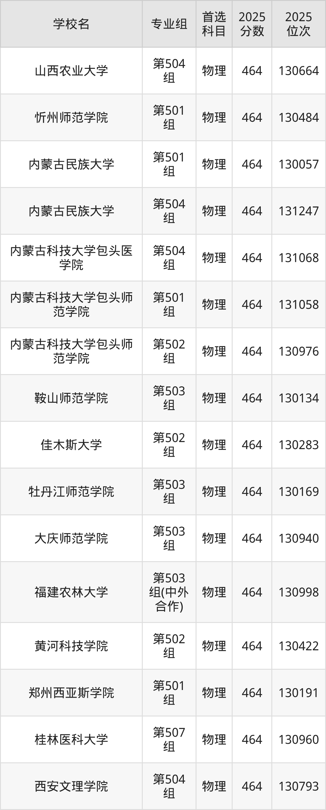 462分可以冲一冲的大学:山西农业大学464分、忻州师范学院464分、内蒙古民族大学464分、内蒙古科技大学包头医学院464分等;