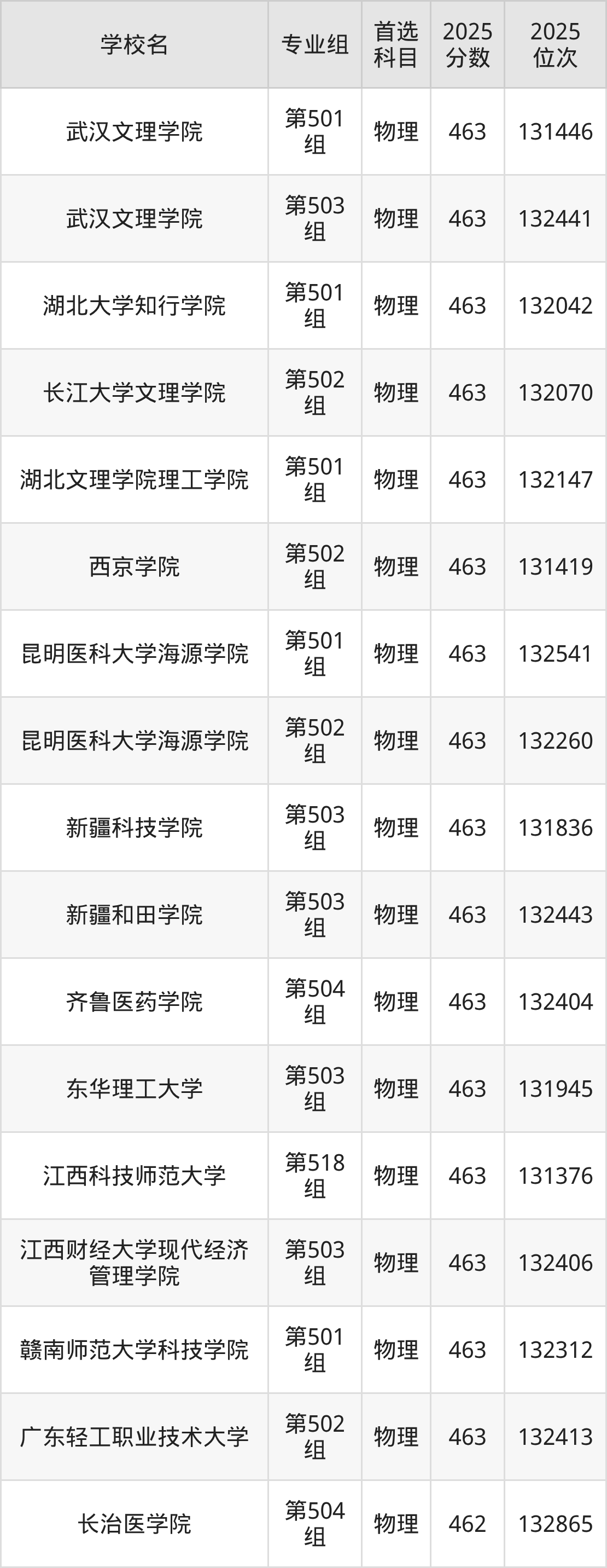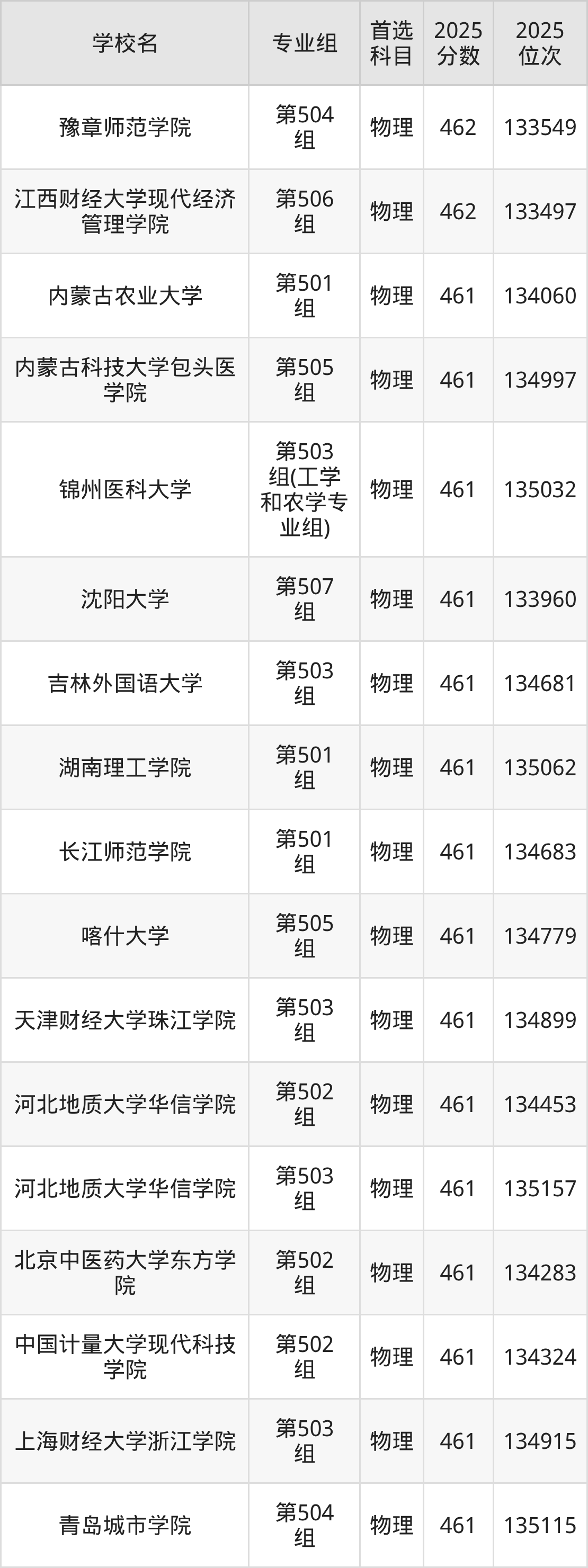 江西物理类462分对应的位次排名是132642名-133932名,因此建议2026年位次排在这附近的考生考虑这些大学。