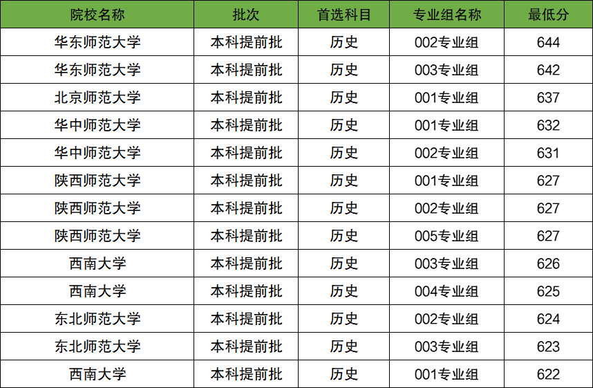 其中最低分院校为西南大学(001专业组),2025年最低分为622分。最高分院校为华东师范大学(002专业组),2025年最高分为644分。